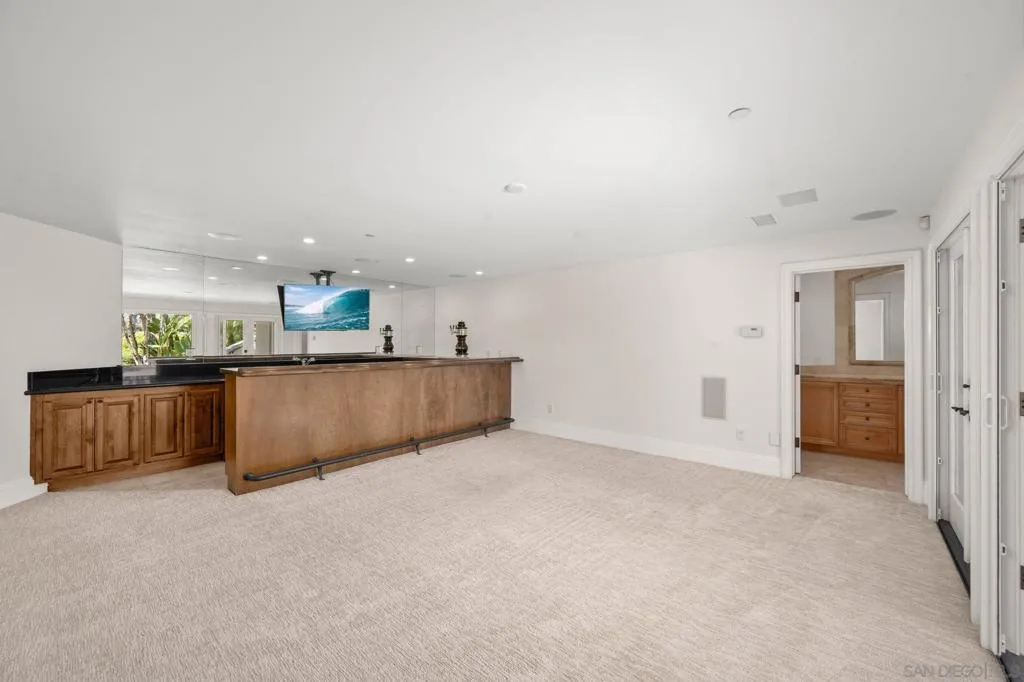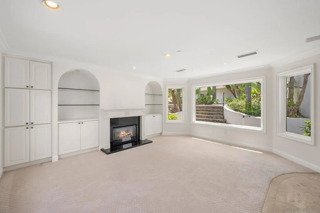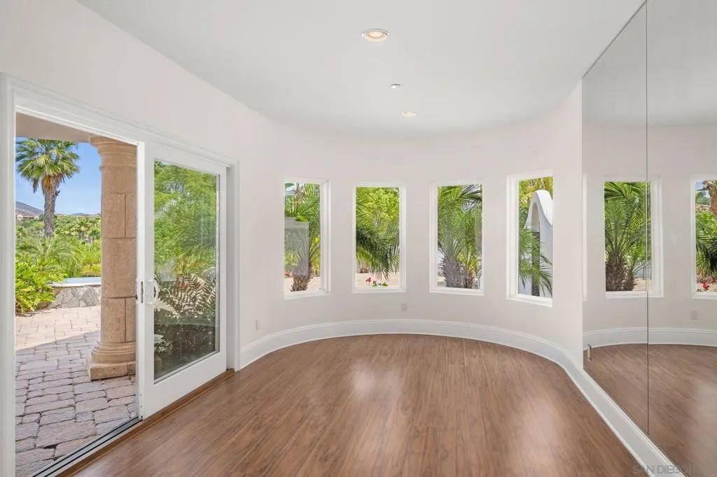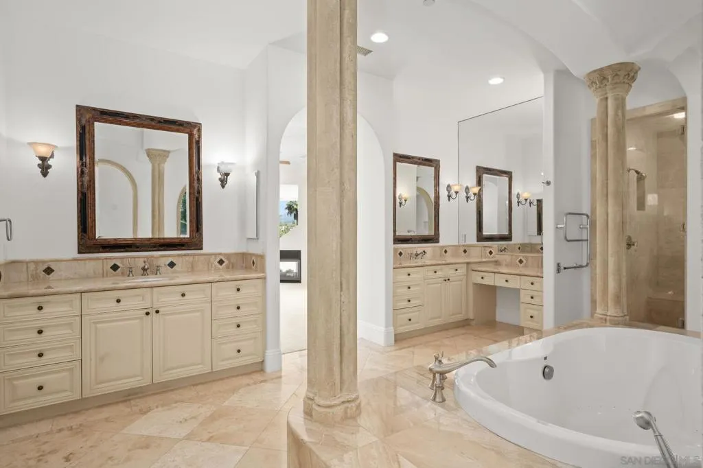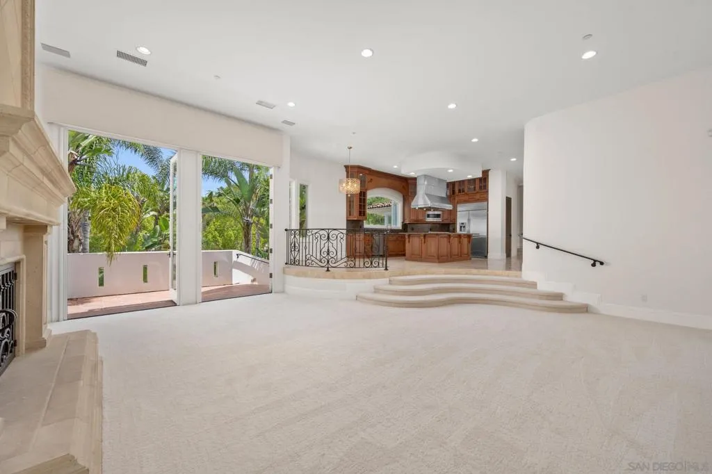 Private Spanish Resort Estate ~ Set behind the gates of the Groves in Rancho Santa Fe and within the Roger Rowe School District, this timeless estate offers space, privacy, and a true resort lifestyle on a lush hillside with sweeping mountain views, mature landscape, and layered greenery. A white courtyard entry with a rustic arched gate opens to a sunlit patio framed by palms and distant views. The grand foyer welcomes you through arched wooden doors with a carved stone fireplace and soft natural light. The main residence lives primarily as a single level with 5+ bedrooms, soaring ceilings, a dedicated office with built-ins, bar and lounge, and a wellness gym. The chef’s kitchen features custom wood cabinetry, stone counters, a large island with cooktop, and a professional range, opening to the family room and terrace for seamless indoor-outdoor living. The primary suite offers a private fireplace, balcony views, a custom walk-in closet, and a spa-like bath with soaking tub and steam shower. A detached 1-bed, 1-bath guest house includes its own kitchen and living area. The outdoors center around an infinity-edge pool and spa, lush tropical landscape, and a spacious courtyard with fireplace and built-in barbecue, an ideal setting for gathering and making lasting memories. Gated entry, circular driveway, and a 4-car garage complete this rare offering.