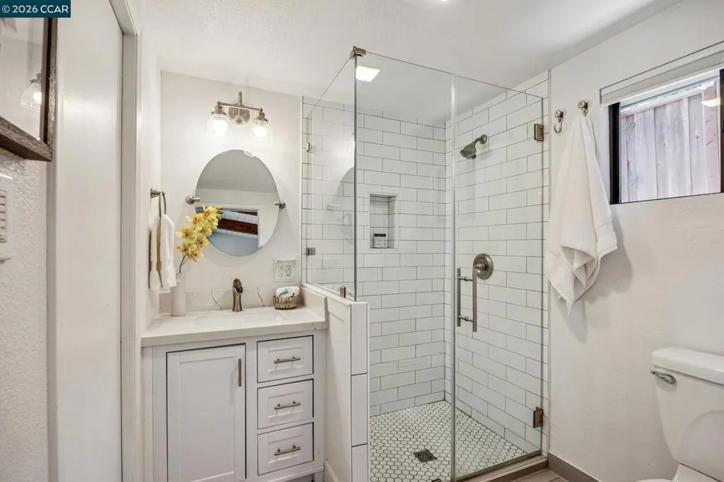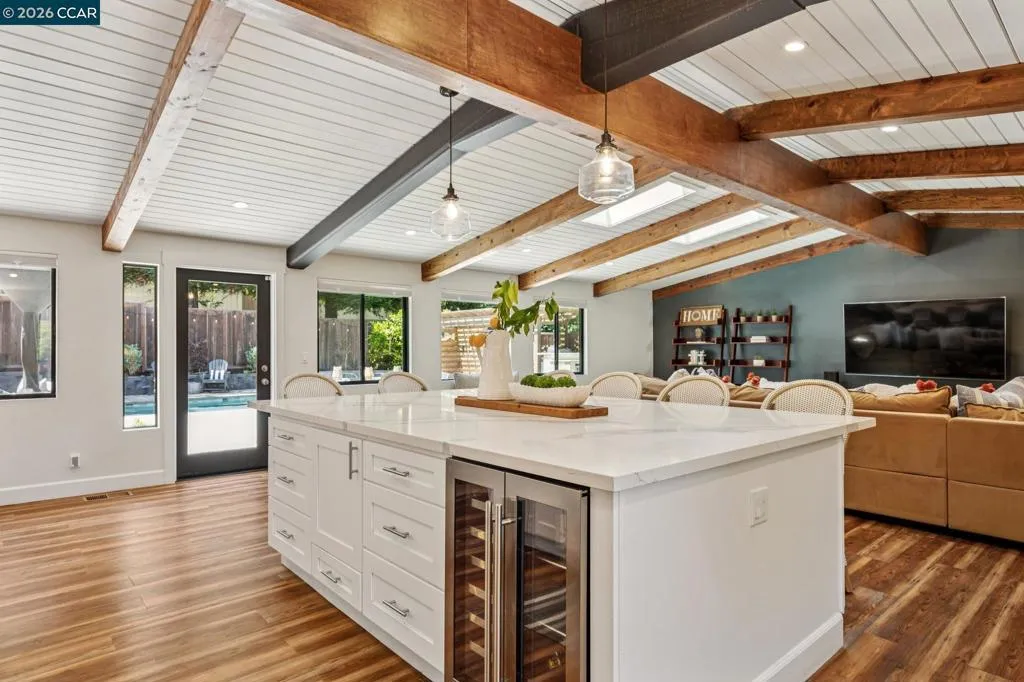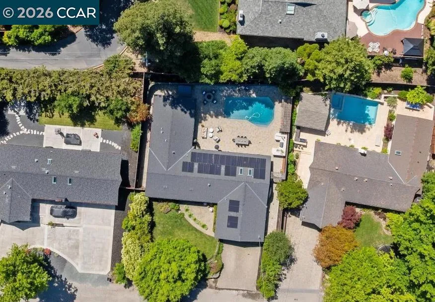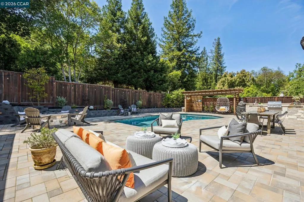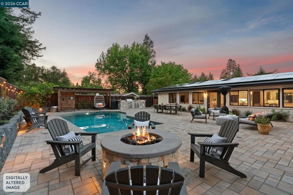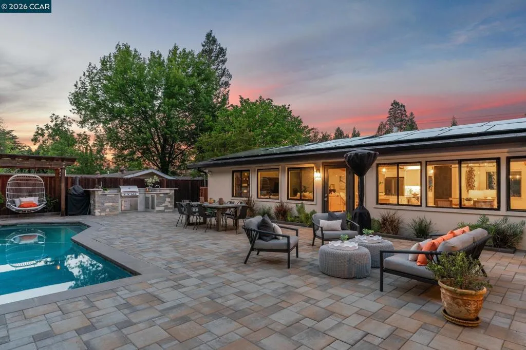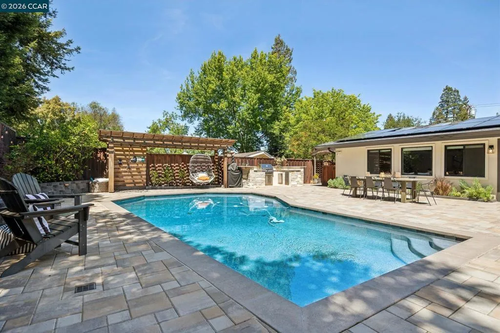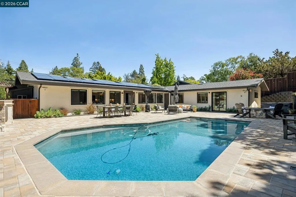 Stunning single-level home in sought-after Westside Alamo, moments from the Iron Horse Trail. Tucked on a private court, this beautifully remodeled 3-bedroom, 2.5-bath home features an open-concept layout, over $600K in updates, and a designer kitchen with an oversized island, high-end appliances, and custom cabinetry. The resort-style backyard is built for California living with a saltwater pool, spa, paver patio, outdoor kitchen, outdoor shower, and gas fire pit. A private bedroom wing includes a serene primary suite with backyard views, sliding glass doors, a remodeled bath, and a walk-in closet. Additional features include FULLY OWNED SOLAR, newer roof, French drains, tankless water heater, and skylights. Close to parks, trails, top-rated SRV schools, and local amenities.