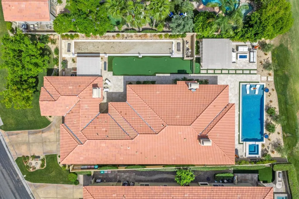 Spectacular Santa Barbara-style entertainer's estate on an oversized, private lot overlooking Hole 16 of PGA WEST Weiskopf private course. This 3,465 square feet home features four en-suite bedrooms plus a detached casita, a massive walled courtyard entry and a chef's kitchen with new Wolf appliances. Newly painted interiors, gas fireplace with slab surround and designer lighting complete the elegant living spaces -- but the showstopper is the backyard, built for unforgettable gatherings.An entertainer's paradise, the outdoor compound is fully outfitted for seamless indoor/outdoor living and large-scale events. The newly resurfaced PebbleTec pool features a swim step, integrated lights and drains, and automated fire & water bowls for dramatic nighttime ambiance. Two gas fire pits and multiple lounge zones create conversation areas for intimate evenings or large parties, while a dedicated bocce court and a putting green provide recreational options that appeal to all ages. Pergola and gazebo covers define outdoor dining and lounge spaces, and extensive high-end outdoor furniture with portable beverage units keeps guests comfortable and refreshed.The outdoor kitchen and bar are stadium-grade: Taj Mahal slab counters, multiple refrigerated drawers, a Perlick ice maker plus two Perlick beverage coolers, an EVO grill and Twin Peaks grill combine for full-service catering capability. Five high-end full-sun outdoor TVs, a full indoor/outdoor Sonos audio system with new speakers and strategically placed lighting and landscape hardscaping transform the yard into a private resort. Air-conditioned garages with epoxy floors, makes this property a turn-key entertainer's dream. Perfect for golf course lifestyle living and grand-scale entertaining, this home delivers resort-caliber amenities and meticulous outdoor design for year-round enjoyment.