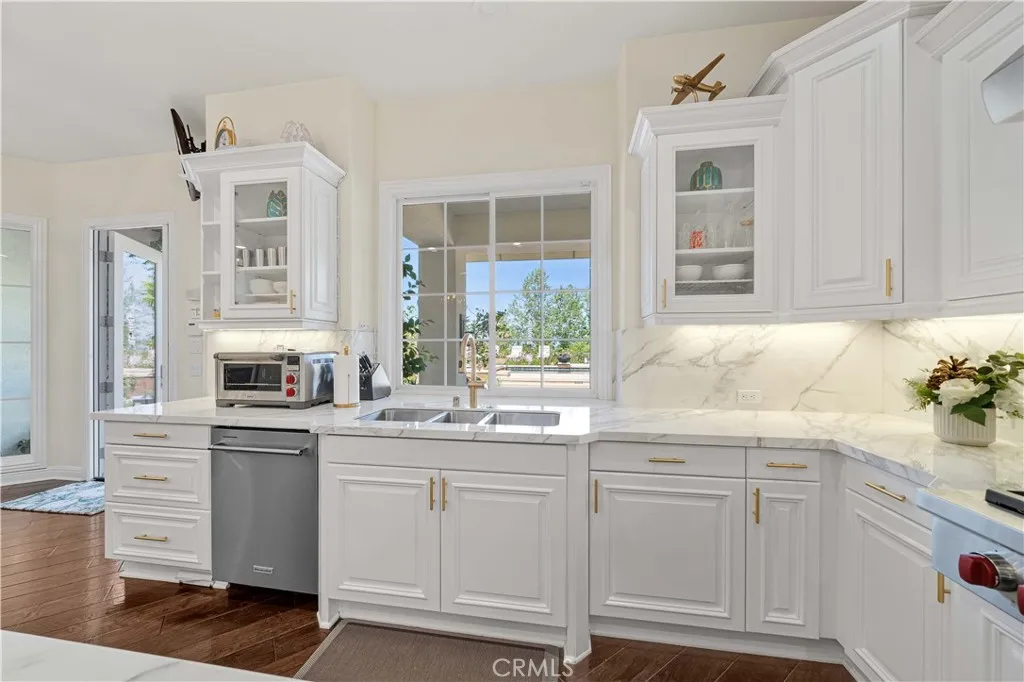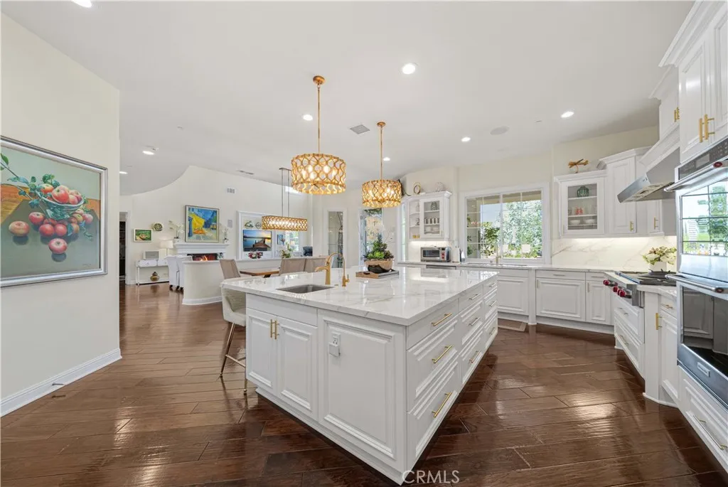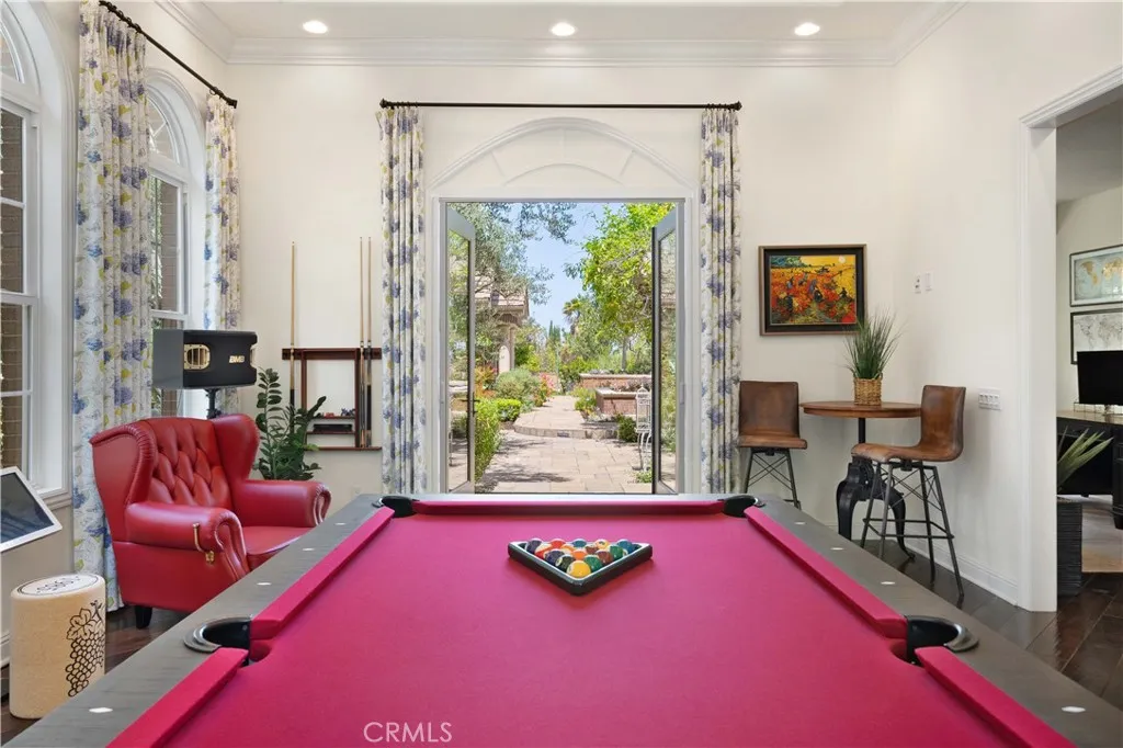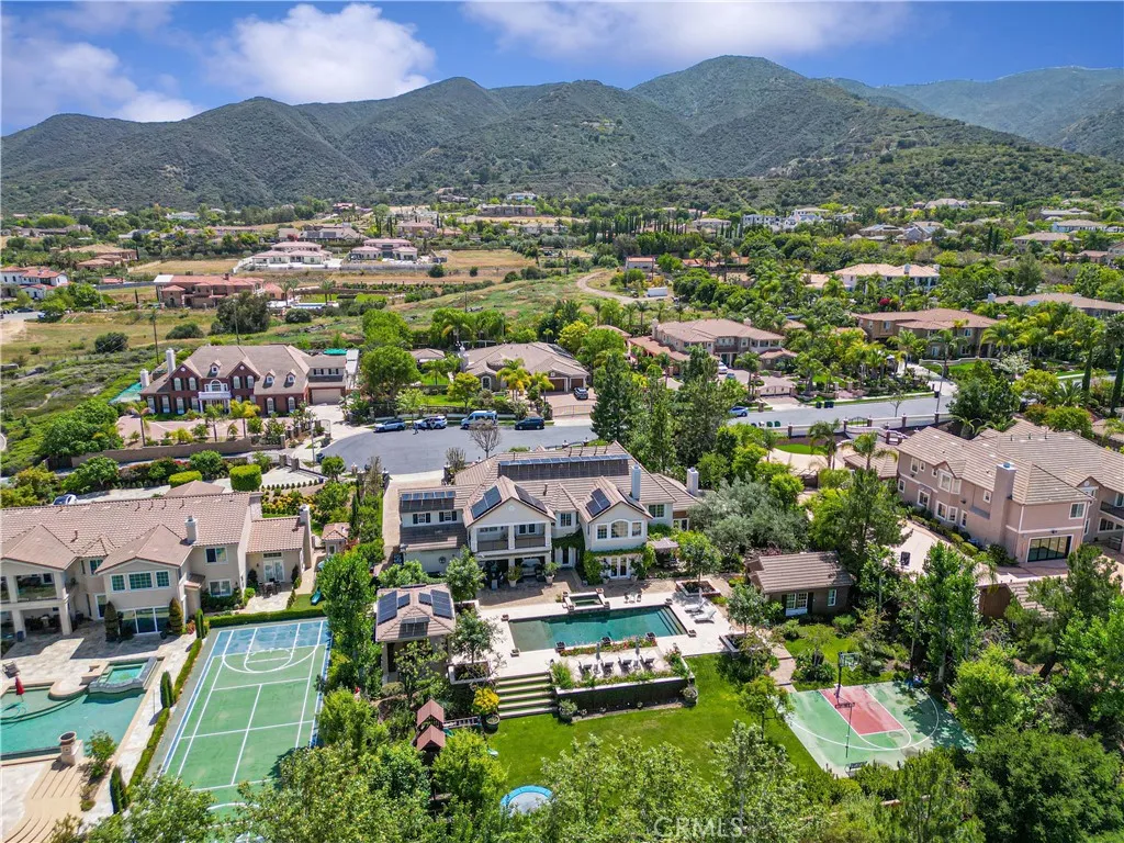 Beautiful former Model home by Toll Brothers estate and well kept 2 stories 6 Bedrooms & 6.5 Baths Single family house in South Corona. North & South facing fully gated property in a quiet cudasac street on a large lot of about 34,848 sq ft with big front yard, side yards, and backyards. Two sets of 2 car garages with each garage having its own Tesla & Chargepoint EV charger. Backyard is very spacious for family gathering with 2 patios, Calfornia room with sink, BBQ, heater & fans, a good size heated swimming pool & spa. Good size about 300 sq ft of Detached private Casita/Guest house/or office at the corner of the back yard with its own Central AC/heat system & water heater & Shower bathroom. Beautifully landscaped yard with roses, olive trees, flowers, grass along with basketball court, built-in trampoline, play house, sitting area with fire pit and fire places surrounded by trees and LED outdoor lights for nightime. As you enter the front gate of the house, you will see a serene water creek flows on the side yard surrounded by mature trees to give it a resort feeling of relaxation. Front door got an upgrade of a metal screen door for extra security and letting fresh air in. High ceiling entrance with big living room, family room, office, entertainment room, a bedroom suite downstairs with shower bathroom. Very large living room with high ceiling and lots of windows to let natural lights surround the house and equips with surround sound system and a fireplace. Spacious open kitchen with giant countertop with 2023 upgraded Wolf commercial graded Stove and Vent, garbage compressor, kitchen Aid dishwasher, oven and microwave, warming drawer, & Subzero refrigerator. Laundry room at downstairs and a space for refrigerator along with a guest bathroom. Upstairs is the master bedroom with master retreat, balcony overlooking the pool and backyard, and a large walk in closet with a spacious Separated shower and tub and 2 toilets. 3 additional bedrooms with their own bathrooms upstairs. Large 65 Solar panels enery efficient system to power the house and pool sufficient enough for $0 to minimum electricity bills. Other features include central vacuum system,water softener for the whole house & upgraded wood flooring downstairs. Other items included with the sale is Sony 85 Inch TV, self playing grand paino, full size billard table, 165 inch projector fixed wall screen, 2 persons sauna room. Low property tax with no Mello Roos! Too many things to list, come see it!