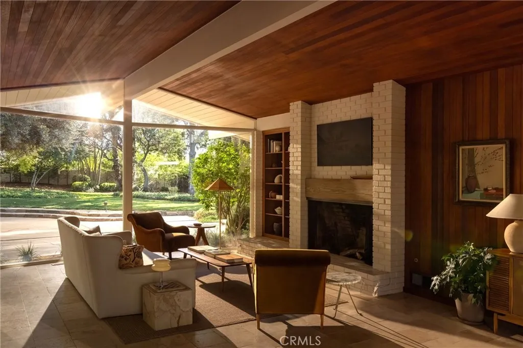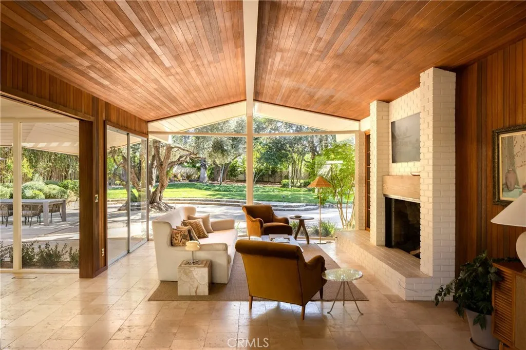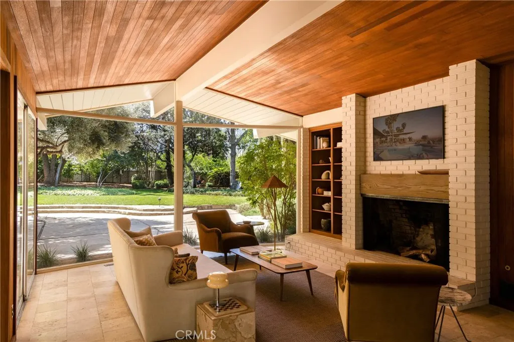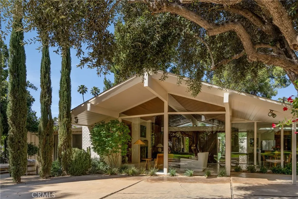 VICTORIA WOODS-Offered as a rare opportunity to own a true piece of Southern California architectural history, this exceptional mid-century modern residence is attributed to noted architect Philmer J. Ellerbroek, whose work was featured in Architectural Digest and helped define the seamless indoor-outdoor lifestyle synonymous with California living. Privately perched on a gentle hill along prestigious Arroyo Drive in the coveted Victoria Woods neighborhood, this residence immediately captivates with a circular drive way with peekaboo views toward the golf course and beyond. A serene gated courtyard sets the tone, guiding you through extra tall double entry doors that upon entering reveal this homes most breathtaking feature.Inside, soaring vaulted ceilings, walls of paneled mahogany and A-framed glass offer picturesque views of an entire landscape that unfolds like a living work of art. It is all anchored by a magnificent original olive tree set within a large concrete patio. Beyond, layers of mature trees, lush lawn, and meandering walkways wind gracefully through ivy and greenery, creating a serene, park-like setting that feels both curated and completely organic.This seamless visual connection between indoors and outdoors embodies the essence of mid-century design where architecture and landscape exist harmoniously.The expansive living room flows effortlessly as the heart of the home, filled with natural light and designed for both quiet moments and entertaining. To the left, the kitchen and adjoining breakfast nook with access to a flexible adjoining room—currently used as a bedroom but ideal as a study or formal dining space. This wing also connects to the enclosed garage, originally designed as a covered carport.The opposite wing is dedicated to privacy, featuring the spacious primary suite along with secondary bedrooms and a well-appointed hall bath reflecting classic mid-century design principles of separation.Originally conceived as a contemporary-modern showpiece, the home has been renovated to retains its architectural integrity while offering flexibility for modern living. Extensive original plans and architectural documents are preserved and included.Situated on approximately half an acre and located just moments from the Victoria Club, schools, shopping and easy freeway, truly exceptional home offered in one of Riverside’s most established and desirable neighborhood where timeless design, privacy, and location converge.
