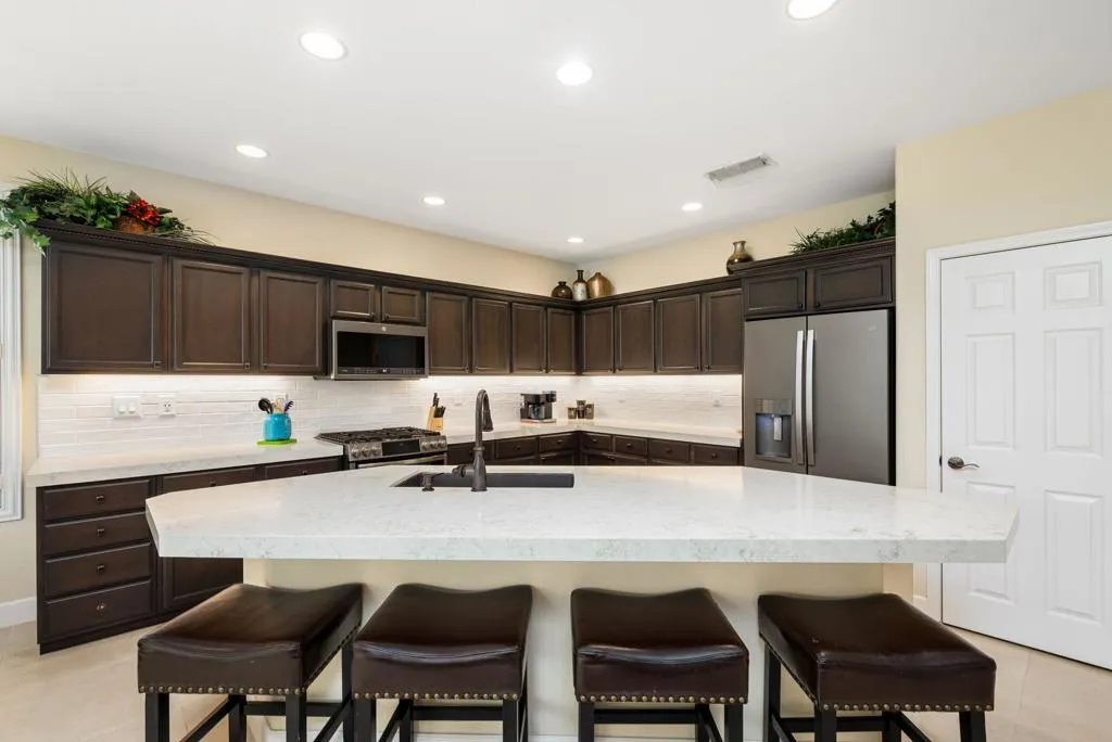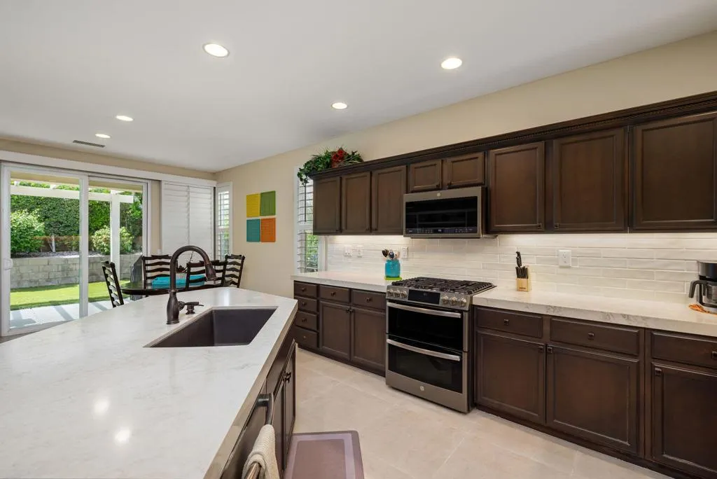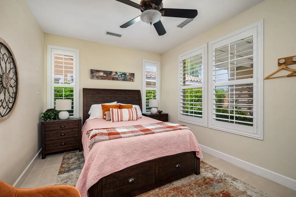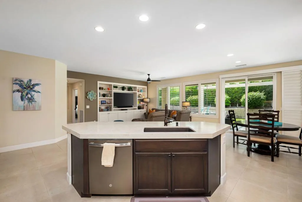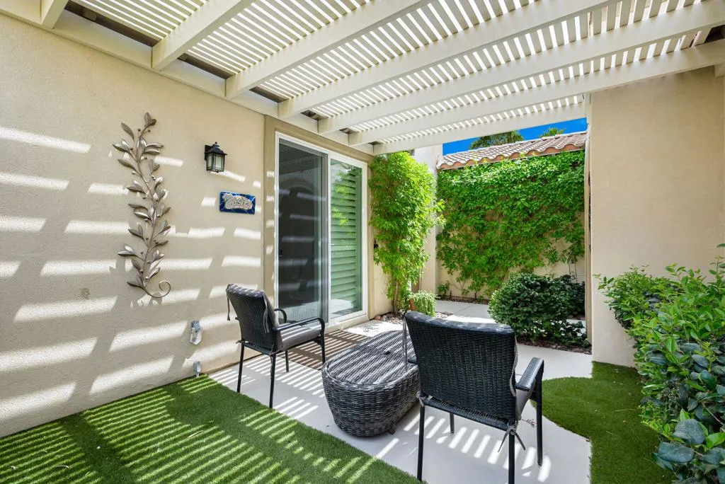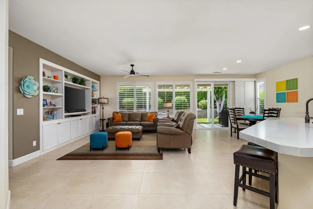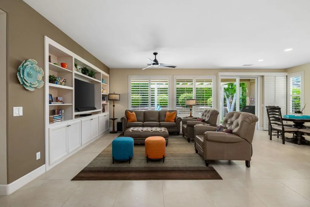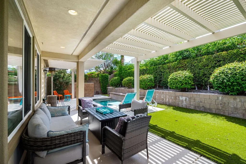 Beautifully upgraded and thoughtfully enhanced, this highly desirable Monterey floor plan in Trilogy at La Quinta offers exceptional flexibility, style, and resort-style living in one of the Coachella Valley's premier 55+ communities, ideally located just moments from the clubhouses and all community amenities. Originally configured as a 3-bedroom home with a detached casita, the property now features a professionally converted den/office, creating a highly desirable fourth bedroom or flex space--ideal for guests, hobbies, or a private home office. The open-concept great room is filled with natural light and anchored by custom built-in cabinetry, while expansive windows with plantation shutters seamlessly connect indoor and outdoor living. The chef's kitchen has been tastefully updated with quartz countertops, a large center island with bar seating, stainless steel appliances, and abundant rich cabinetry, making it perfect for both everyday living and entertaining. The primary suite is a true retreat, offering direct access to the backyard along with a spa-inspired bathroom featuring dual vanities, a walk-in shower, and a spacious custom walk-in closet. Guests will enjoy privacy and comfort with multiple well-appointed bedrooms, including the detached casita complete with its own kitchenette--perfect for extended stays, visiting family, or multigenerational living. Step outside to your private backyard oasis where a covered patio, pergola, spa, and lush mature landscaping create a peaceful and secluded environment--ideal for relaxing or entertaining under the desert sky. As part of Trilogy at La Quinta, residents enjoy access to world-class amenities including a championship golf course, resort-style pools, a state-of-the-art fitness center, tennis and pickleball courts, on-site dining, and an active social calendar with clubs, events, and activities designed for an exceptional lifestyle, making this home a perfect blend of comfort, versatility, and premier desert living. This home can also be offered turnkey furnished under a separate contract.