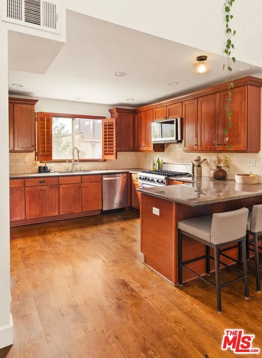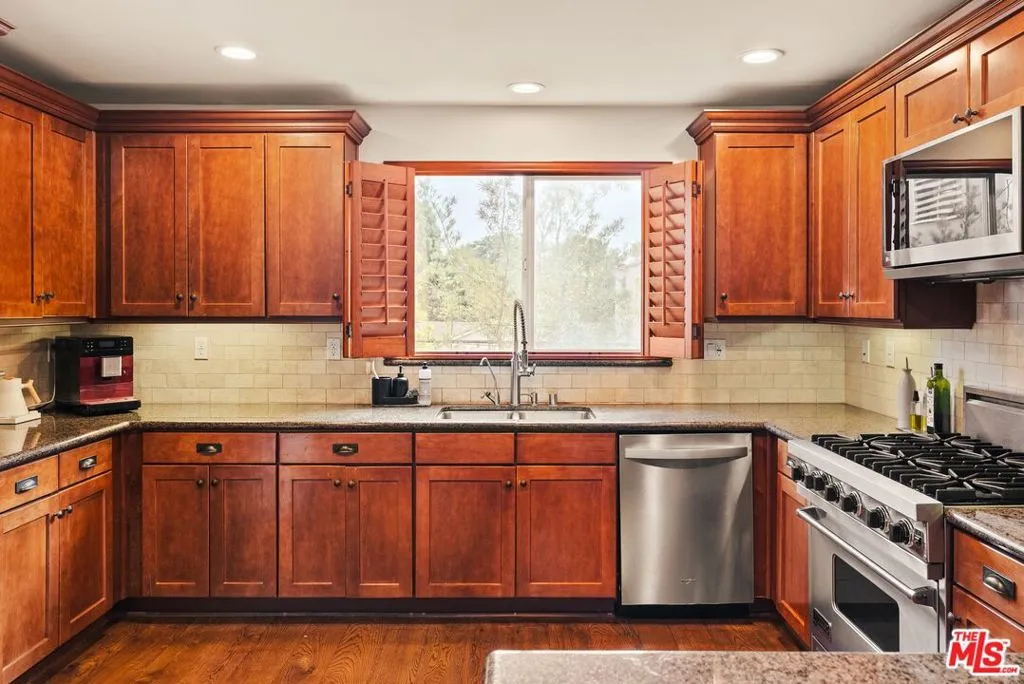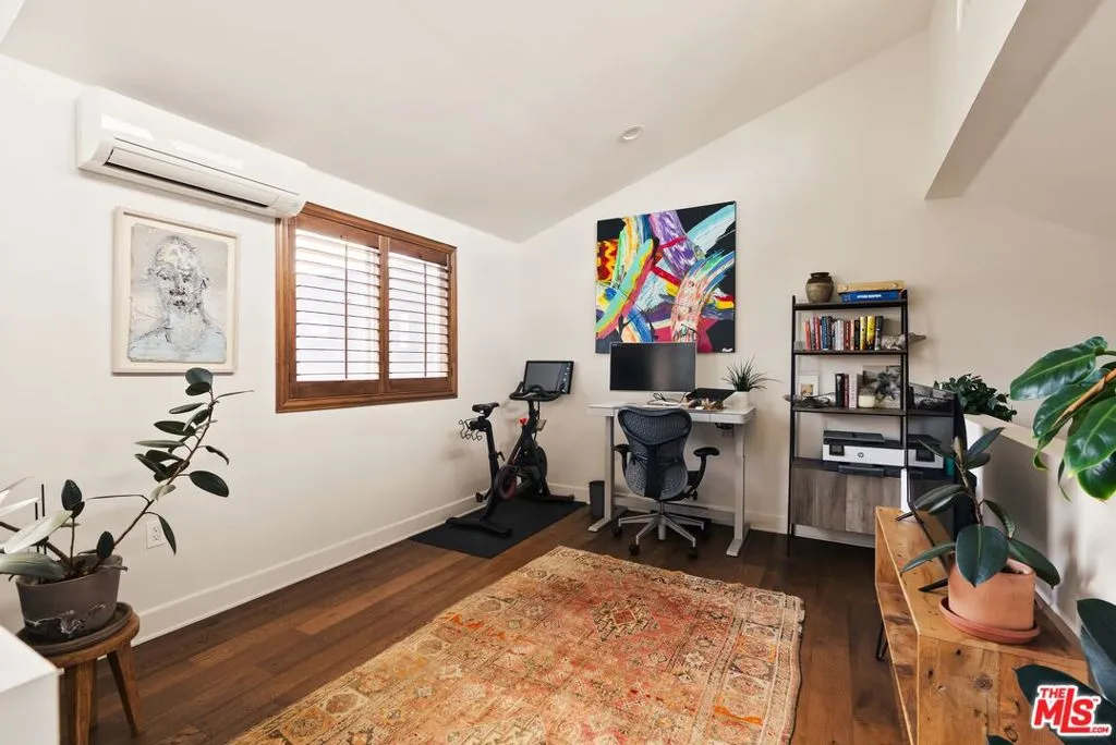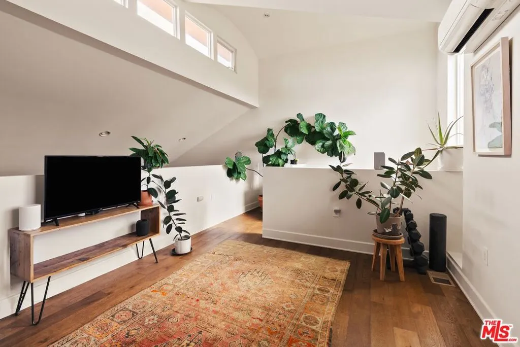 Set on a peaceful, tree-lined street in the heart of Mar Vista, this beautifully appointed townhome blends thoughtful design with everyday comfort, enhanced by tasteful upgrades throughout. Offering 2 bedrooms, 2 bathrooms, and a spacious loft, the light-filled interior feels warm, inviting, and effortlessly versatile. The main living area showcases dramatic ceilings, rich hardwood floors, and a charming fireplace that anchors the space. The kitchen is well-suited for both daily living and entertaining, featuring a 6-burner Viking range, stainless steel appliances, a walk-in pantry, reverse osmosis water filtration system, and ample storage. The generous primary suite offers a walk-in closet and a serene en suite bath, while the second bedroom also includes ample closet space and its own en suite bathroom with a soaking tub. Upstairs, the loft provides flexibility as a home office, gym, or creative space, with the option to function as a third bedroom. An oversized flagstone patio, framed by lush drought-tolerant landscaping, offers the perfect setting for outdoor entertaining or quiet, serene mornings. Additional conveniences include in-unit washer and dryer and a generous bonus storage area, while the private 2-car garage equipped with EV charging capability completes the home. Ideally located just minutes from popular restaurants, coffee shops, and neighborhood favorites, this home offers the best of Westside living in one of its most walkable communities.