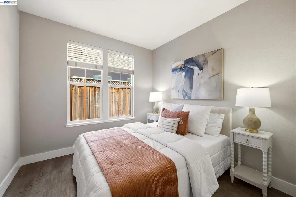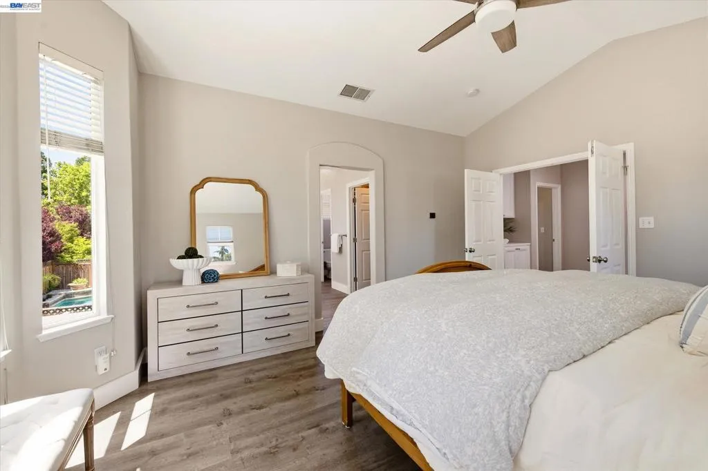 Fantastic east-facing four-bedroom, three-bath home situated directly across from the beautiful 6 acre Hansen Park and just a short walk to top-rated K–12 schools, downtown Pleasanton, and shopping. Enjoy easy commuter access to the 580/680 freeways. Inside, you’re greeted by abundant natural light, soaring 14-foot ceilings, new luxury vinyl flooring, and fresh paint. The eat-in kitchen boasts a breakfast bar, walk-in pantry, gas stove, dishwasher, built-in microwave, and refrigerator. The family room, with a gas fireplace, overlooks the private backyard. A full bedroom and bath on the main level provide flexibility, while the inside laundry includes a high-efficiency LG washer and dryer. Upstairs, the large primary suite offers an updated bath with a soaking tub, walk-in shower, dual vanities, and a walk-in closet. Two additional bedrooms share a Jack-and-Jill bath. The serene backyard, shaded by mature redwoods, includes a large patio, lawn, and outdoor kitchen with a dishwasher and refrigerator. Plus, new redwood fencing, florring lighting paint, HVAC, storage sheds, and a three-car garage with ample storage. This one will go fast, dont miss out!