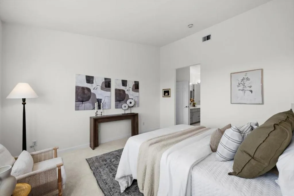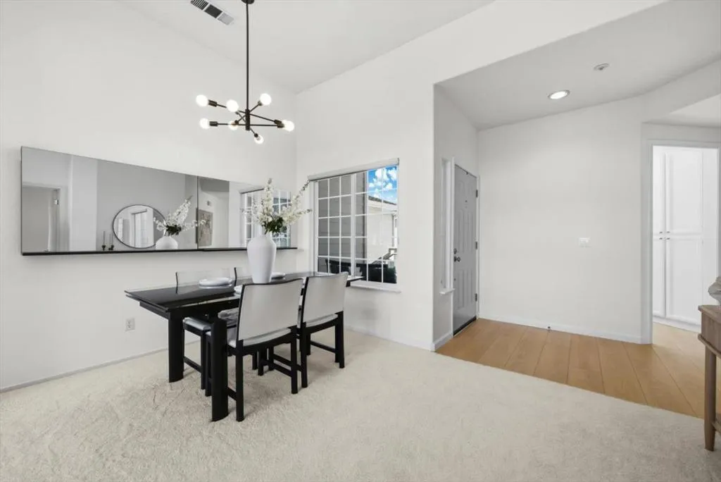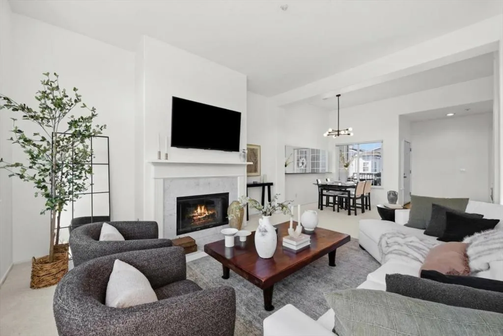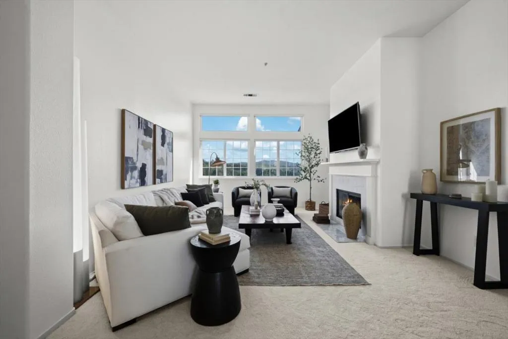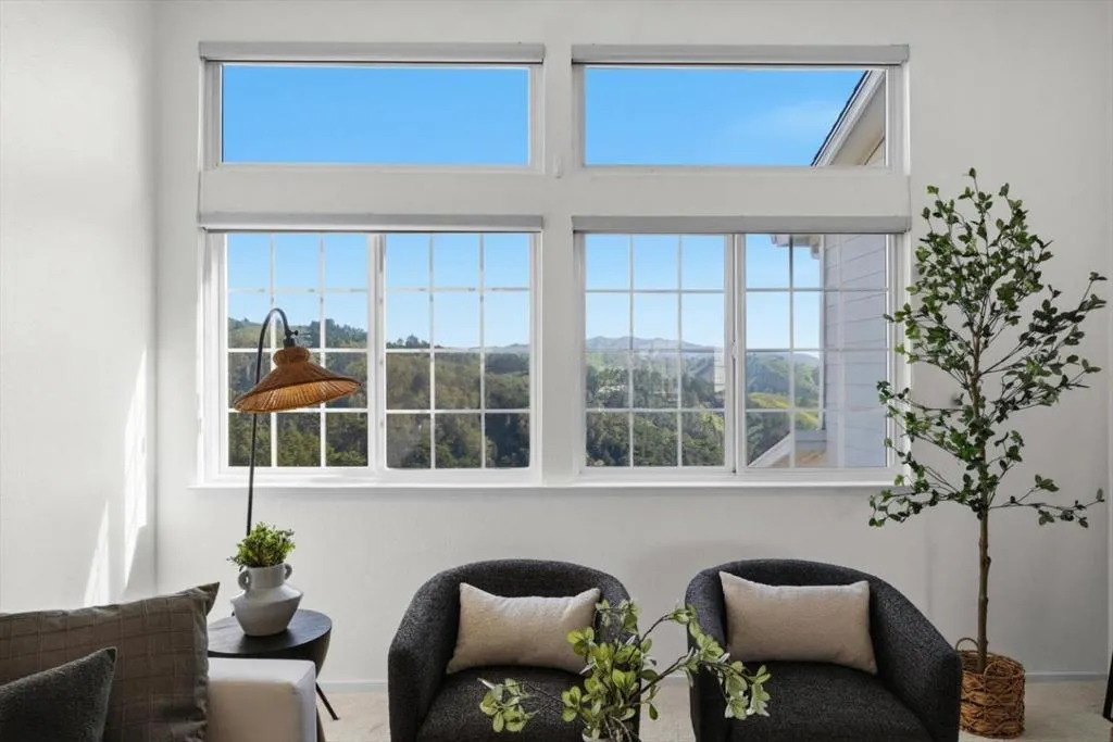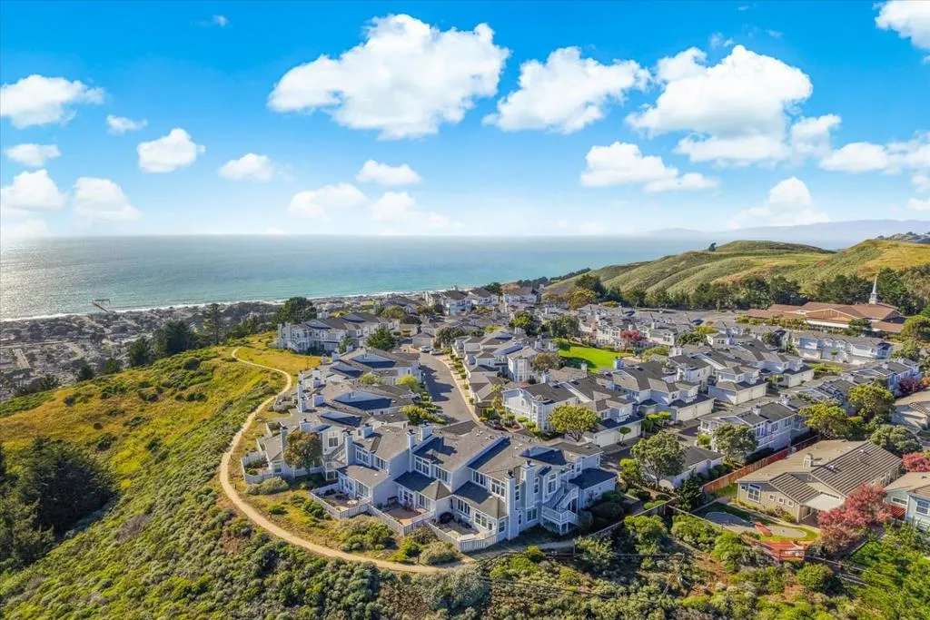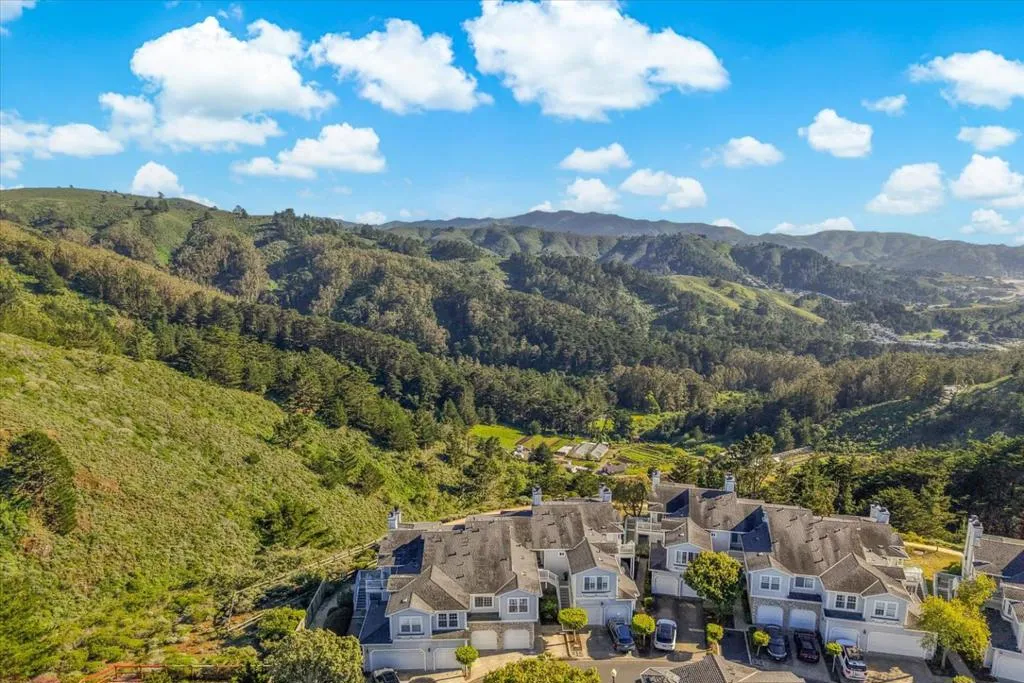 Perched on the top floor within the exclusive gated community of Mariners Pointe, this rare 3-bedroom residence offers a refined coastal lifestyle with privacy, light, and sweeping views. Approx.1,467 sqft, the home is defined by soaring ceilings and an abundance of natural light that pours into the expansive living space. Framed by tranquil mountain vistas, the living room creates a warm, sophisticated setting, complete with a wood-burning fireplace for cozy evenings. The dining area flows seamlessly for intimate dinners & gatherings.The kitchen features updated countertops, stainless steel appliances, and generous cabinetry. Vaulted ceilings and captivating mountain and ocean views create a sense of escape within the main suite. A spacious walk-in closet and spa-inspired ensuite bath with dual vanities, soaking tub, and extended storage. Additional bedrooms offer flexibility for guests, a home office, or a growing household. Highlights include in-unit laundry, central heating, two private garages plus nearby guest parking. Mariners Pointe delivers a resort-like lifestyle with scenic walking trails, clubhouse for large parties, fitness center, hot tub, and playground. Mere mins from San Francisco, Pacifica beaches, coastal trails, local shops, dining, public transit & SFO.