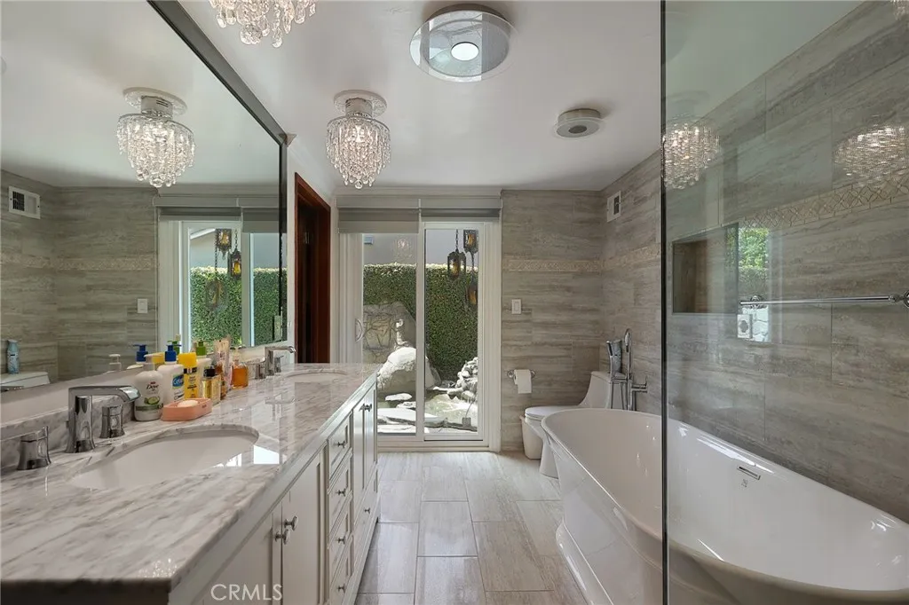 This exceptional 3 level, 2 story residence offers a rare opportunity in Laguna Lake — one of Fullerton's most coveted and tightly held neighborhoods. Set on an approximately 21,000-square-foot lot, the home delivers a remarkable blend of scale, character, and resort-style living. A striking foyer welcomes you with timeless tile floors and a dramatic stone peek-through fireplace, where a grand piano anchors the entry. Gracious gathering spaces unfold beyond, including a formal family room with wet bar. The first-floor primary suite is a tranquil retreat featuring a dressing area, generous walk-in closet, and spa-inspired ensuite with dual vanities, soaking tub, and serene koi pond views. A separate living room completes this level. The second level showcases an entertainer's kitchen with rich oak cabinetry, abundant storage, dual ovens, custom accent lighting, and a large center island with prep sink. A sunlit breakfast nook sits just off the kitchen, while a pass-through window opens to a bright, airy sunroom. The formal dining room — elevated by a crystal chandelier — flows effortlessly into the sunroom, ideal for gatherings, a home office, or fitness studio. This level also features a spacious laundry room, custom-built sauna, and full bath. Located on the third level, a second primary suite and 3 well-appointed bedrooms each offer a private ensuite. Outdoors, the grounds are nothing short of spectacular: a grand lap pool with slide and diving board, separate in-ground spa, and a full tennis court with in-ground basketball hoop. Entertaining is effortless with a built-in BBQ, motorized awning, and ample space for al fresco dining. Additional highlights include a gated front yard, dual-entry extended driveway, drought-conscious landscaping, single-car garage, and a covered carport accommodating up to three vehicles. Available to a new owner for the first time in nearly 30 years, 2441 Terraza Place sits within a highly rated school district and just moments from the very best Fullerton has to offer.