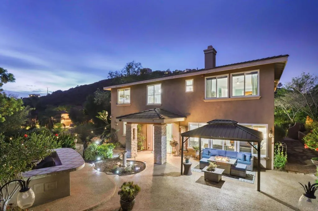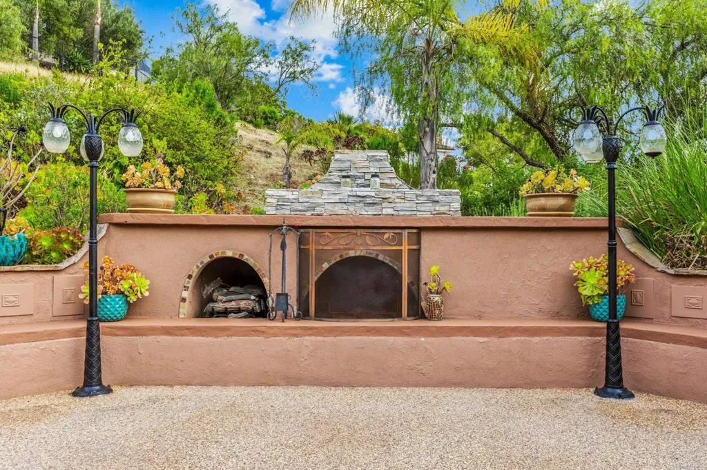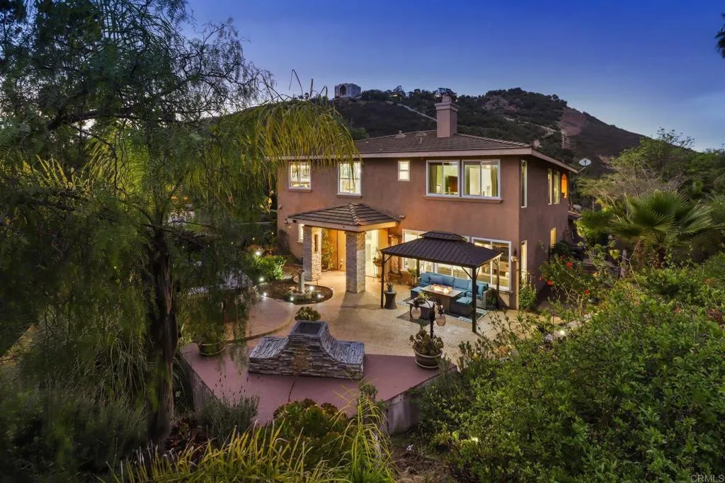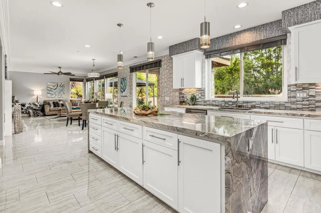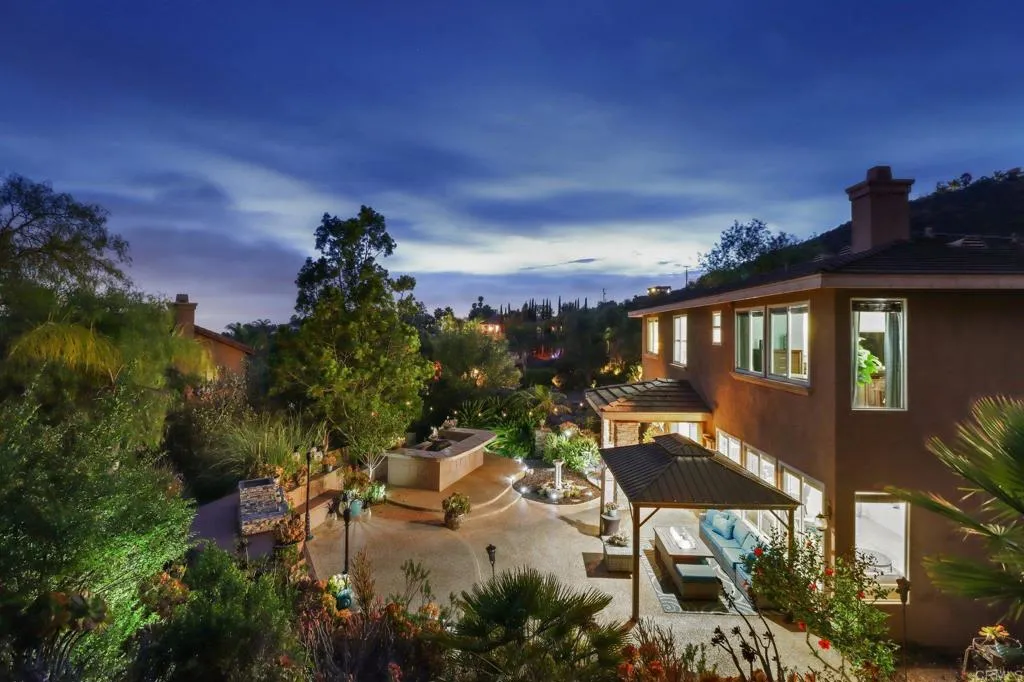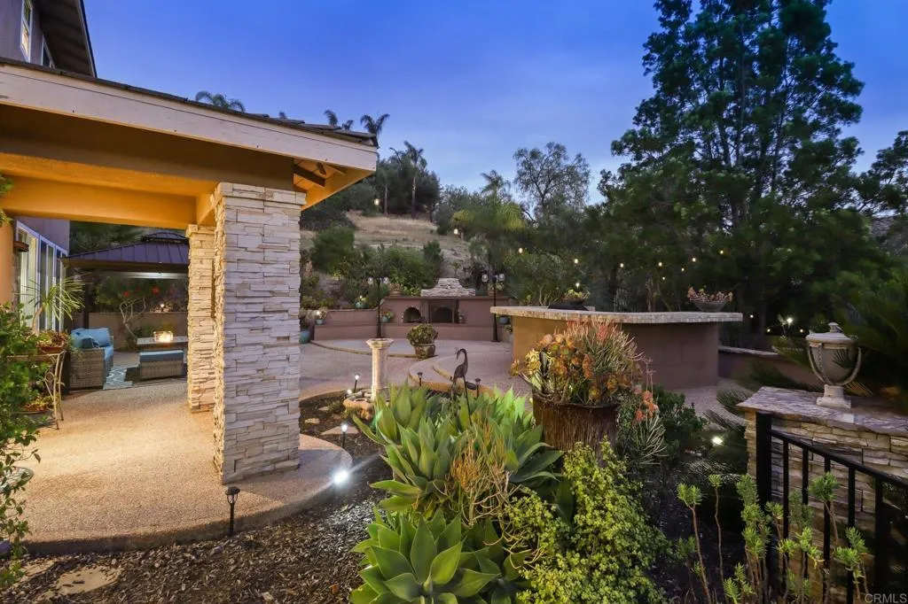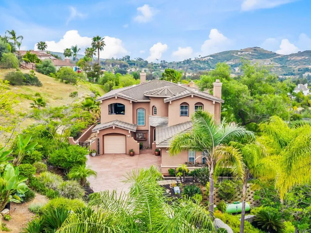 Set within the gated enclave of Vista Grove Estates—an exclusive community of just 24 executive and estate homes on spacious 0.5+ acre parcels in Vista’s highly sought-after Buena Creek area—this beautifully updated residence offers privacy, scale, and a true resort-style living experience. Positioned on an elevated 1.13-acre lot, the home spans approximately 3,454 square feet with 4 bedrooms and 3.5 bathrooms, including a full bedroom and en-suite bath downstairs. The home has been thoughtfully designed with soaring ceilings, expansive living areas, and abundant natural light throughout. The owner is an interior designer and took great care and attention to details during the recent top to bottom renovation. The home offers a cohesive design rarely found in typical properties, creating a refined yet comfortable living environment throughout. At the heart of the home is a stunning, fully remodeled kitchen featuring quartzite countertops, a large waterfall-edge center island, and extensive custom cabinetry with abundant drawer storage. A designer backsplash and newer (approx. 3-year-old) stainless steel appliance suite—including LG double ovens, LG microwave, French door refrigerator, Samsung dishwasher, and a 5-burner cooktop—create a space that is both functional and visually striking. The adjacent living spaces offer seamless flow ideal for both daily living and entertaining, highlighted by dramatic volume ceilings and two beautifully remodeled fireplaces featuring modern fire glass fireplaces—an elevated design detail that adds warmth and visual impact. Long-plank ceramic tile flooring runs throughout the main areas, enhancing the home’s clean, contemporary aesthetic. Upstairs, updated banisters and railings contribute to the home’s modern feel, while the expansive primary suite offers a true retreat. The expansive primary bedroom includes a private balcony—perfect for enjoying morning coffee or evening sunsets with sweeping views. The primary bathroom features a jetted spa tub positioned near a fireplace for a relaxing, resort-style experience, along with an upgraded shower system designed for luxury and functionality. Secondary bathrooms have also been enhanced with high-end multi-function shower panels, offering a spa-like experience throughout the home. The backyard is a true standout—designed for both relaxation and entertaining with multiple outdoor living areas, including a covered lounge space, built-in bar seating, tranquil fountain feature, and lush, mature landscaping. The setting is private, peaceful, and ideal for hosting or unwinding while enjoying Vista’s natural beauty. Additional highlights include dual HVAC systems for efficient climate control, a 3-car garage, extended driveway with ample parking, and the added benefit of sewer connection—an advantage over many properties in more rural areas. Located in the scenic Buena Creek area, known for its rolling hills, open space, and estate-style living, this home offers a rare blend of tranquility and convenience, just minutes to shopping, dining, and approximately 20 minutes to the coast. Offered with a unique opportunity, the home may be sold fully furnished, with nearly all furnishings and décor available for purchase. Interested parties are encouraged to inquire with the listing agent for additional details. This is a rare opportunity to own a thoughtfully upgraded, design-forward estate property in one of Vista’s most desirable gated communities.