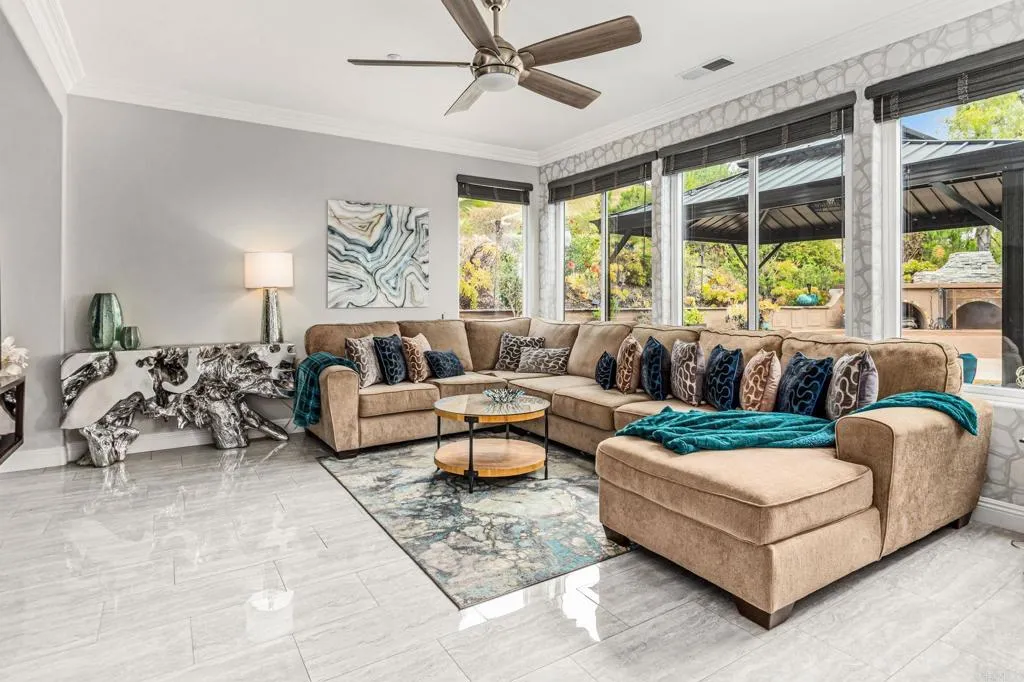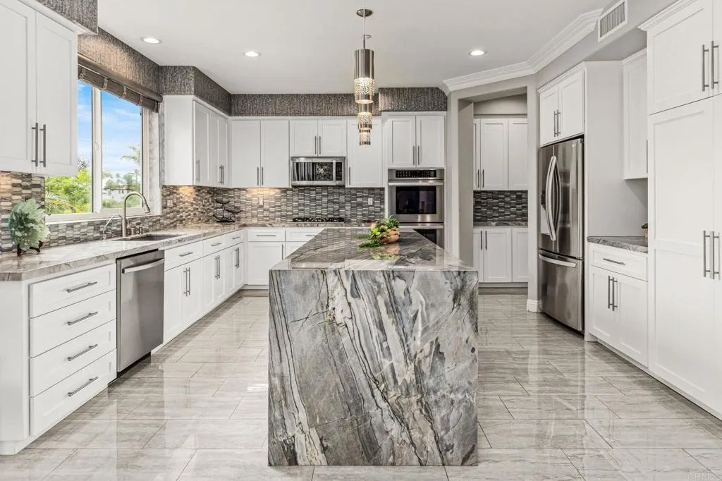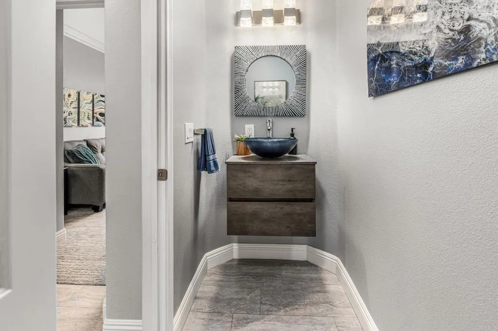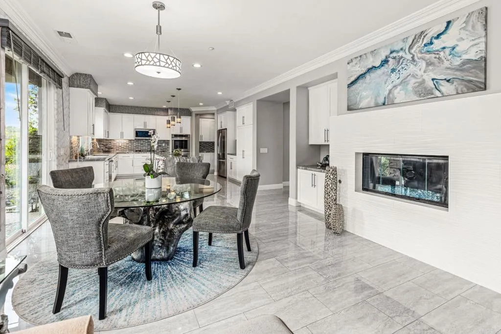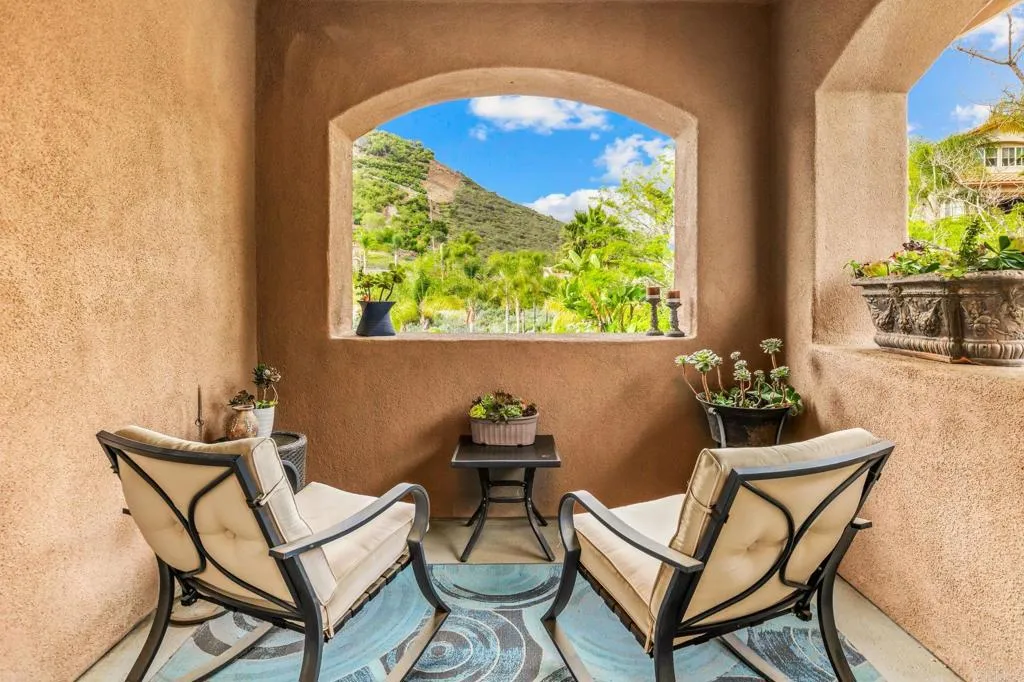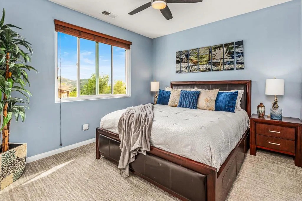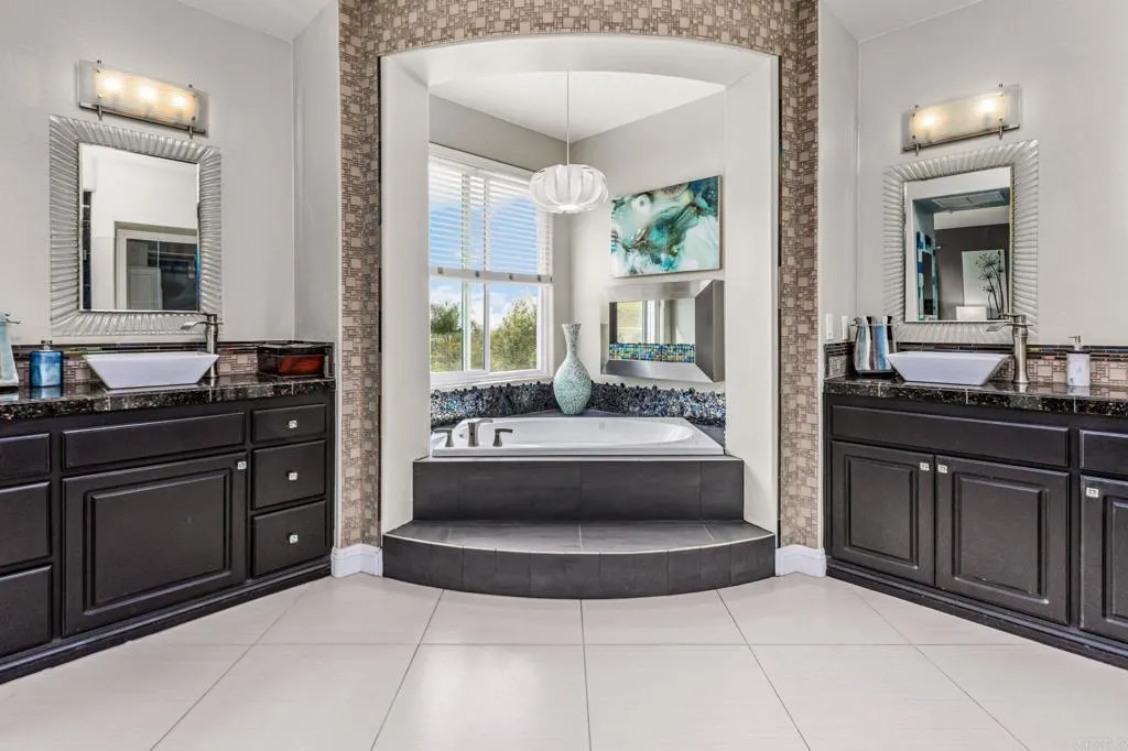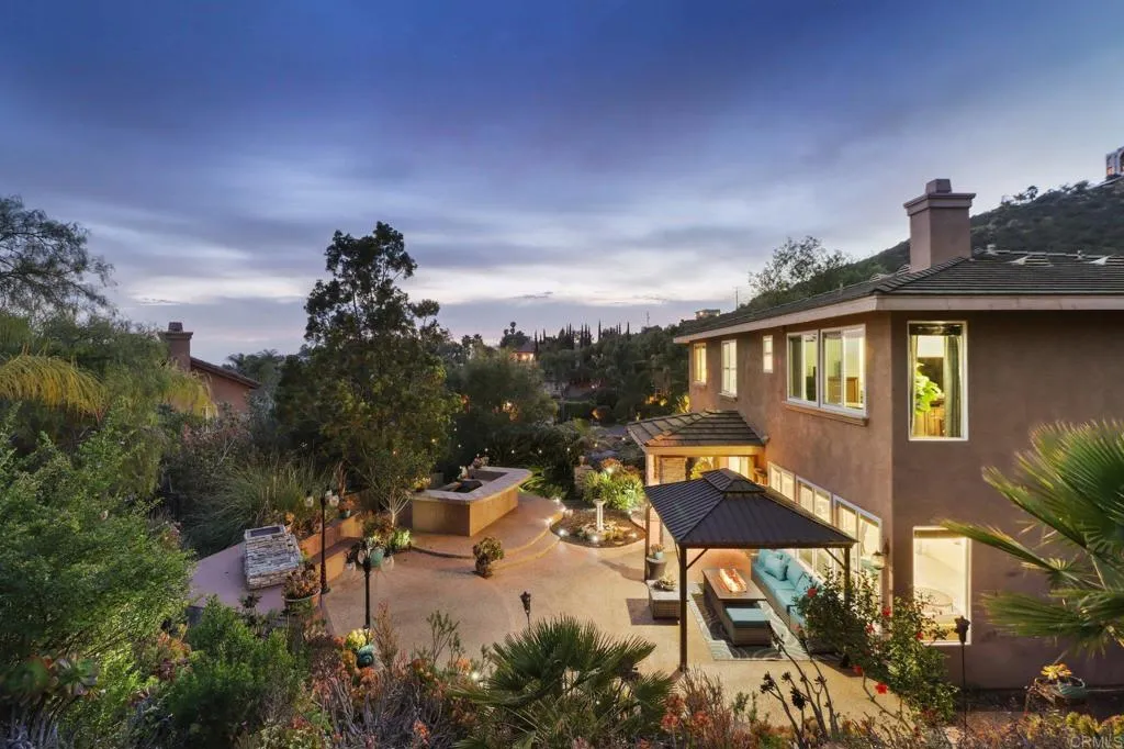 Set within the gated enclave of Vista Grove Estates—an exclusive community of just 24 executive and estate homes on spacious 0.5+ acre parcels in Vista’s highly sought-after Buena Creek area—this beautifully updated residence offers privacy, scale, and a true resort-style living experience. Positioned on an elevated 1.13-acre lot, the home spans approximately 3,454 square feet with 4 bedrooms and 3.5 bathrooms, including a full bedroom and en-suite bath downstairs. The home has been thoughtfully designed with soaring ceilings, expansive living areas, and abundant natural light throughout. The owner is an interior designer and took great care and attention to details during the recent top to bottom renovation. The home offers a cohesive design rarely found in typical properties, creating a refined yet comfortable living environment throughout. At the heart of the home is a stunning, fully remodeled kitchen featuring quartzite countertops, a large waterfall-edge center island, and extensive custom cabinetry with abundant drawer storage. A designer backsplash and newer (approx. 3-year-old) stainless steel appliance suite—including LG double ovens, LG microwave, French door refrigerator, Samsung dishwasher, and a 5-burner cooktop—create a space that is both functional and visually striking. The adjacent living spaces offer seamless flow ideal for both daily living and entertaining, highlighted by dramatic volume ceilings and two beautifully remodeled fireplaces featuring modern fire glass fireplaces—an elevated design detail that adds warmth and visual impact. Long-plank ceramic tile flooring runs throughout the main areas, enhancing the home’s clean, contemporary aesthetic. Upstairs, updated banisters and railings contribute to the home’s modern feel, while the expansive primary suite offers a true retreat. The expansive primary bedroom includes a private balcony—perfect for enjoying morning coffee or evening sunsets with sweeping views. The primary bathroom features a jetted spa tub positioned near a fireplace for a relaxing, resort-style experience, along with an upgraded shower system designed for luxury and functionality. Secondary bathrooms have also been enhanced with high-end multi-function shower panels, offering a spa-like experience throughout the home. The backyard is a true standout—designed for both relaxation and entertaining with multiple outdoor living areas, including a covered lounge space, built-in bar seating, tranquil fountain feature, and lush, mature landscaping. The setting is private, peaceful, and ideal for hosting or unwinding while enjoying Vista’s natural beauty. Additional highlights include dual HVAC systems for efficient climate control, a 3-car garage, extended driveway with ample parking, and the added benefit of sewer connection—an advantage over many properties in more rural areas. Located in the scenic Buena Creek area, known for its rolling hills, open space, and estate-style living, this home offers a rare blend of tranquility and convenience, just minutes to shopping, dining, and approximately 20 minutes to the coast. Offered with a unique opportunity, the home may be sold fully furnished, with nearly all furnishings and décor available for purchase. Interested parties are encouraged to inquire with the listing agent for additional details. This is a rare opportunity to own a thoughtfully upgraded, design-forward estate property in one of Vista’s most desirable gated communities.