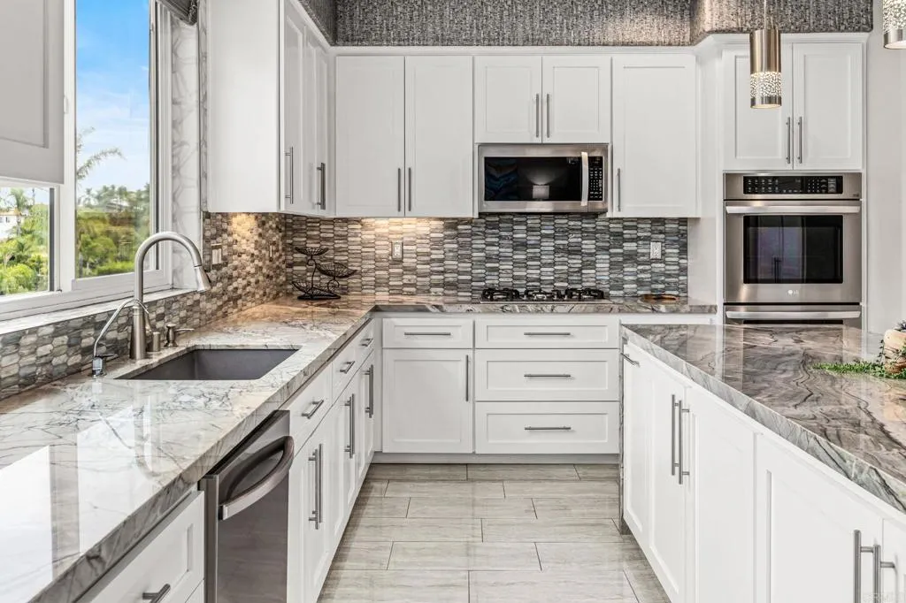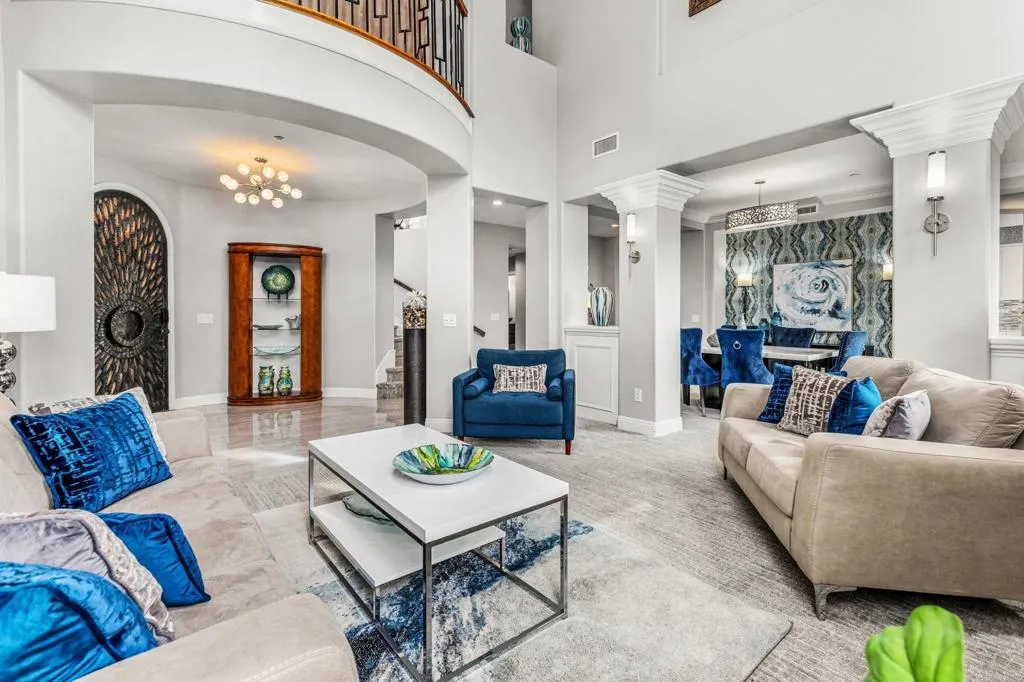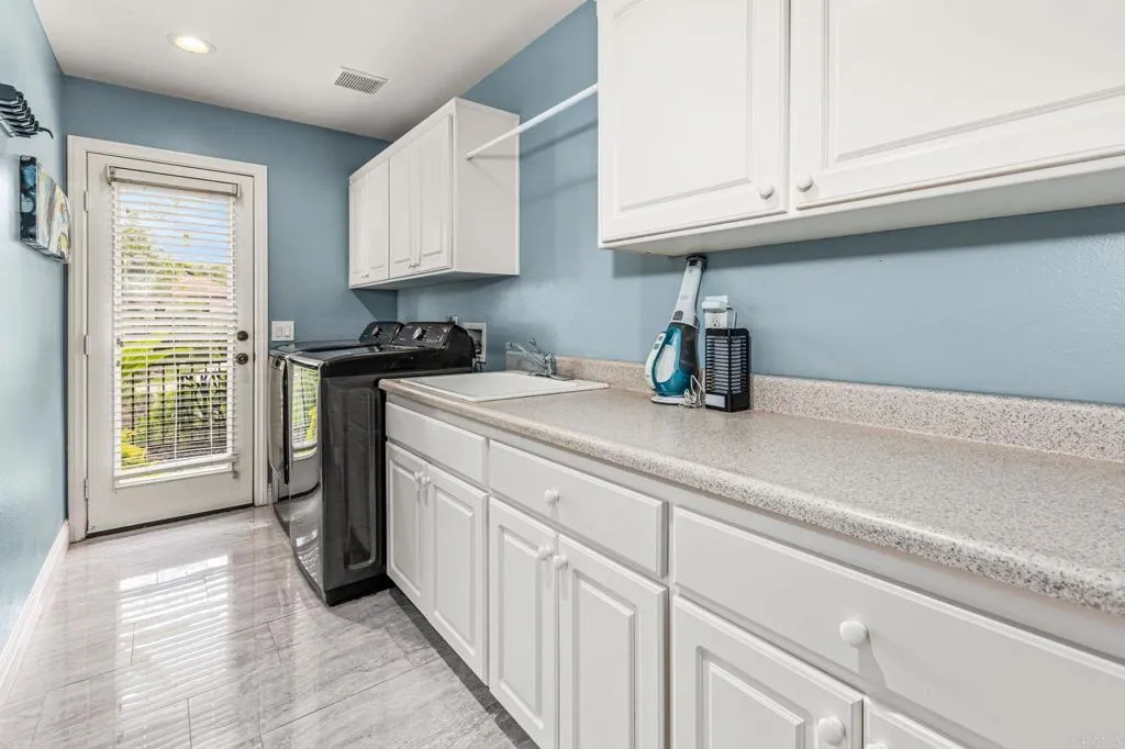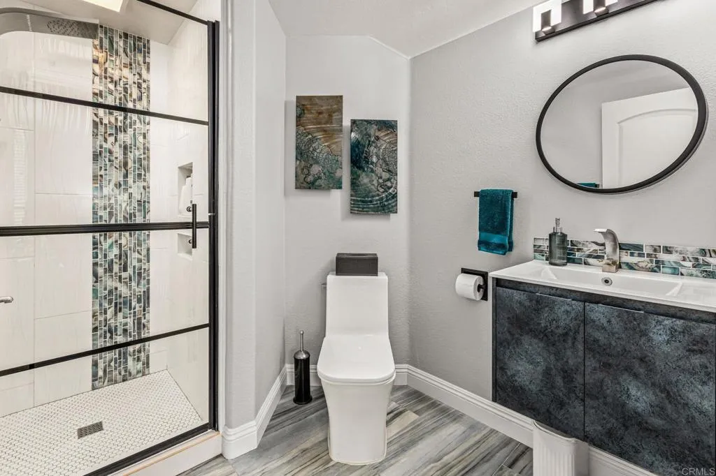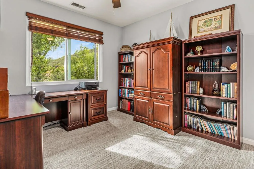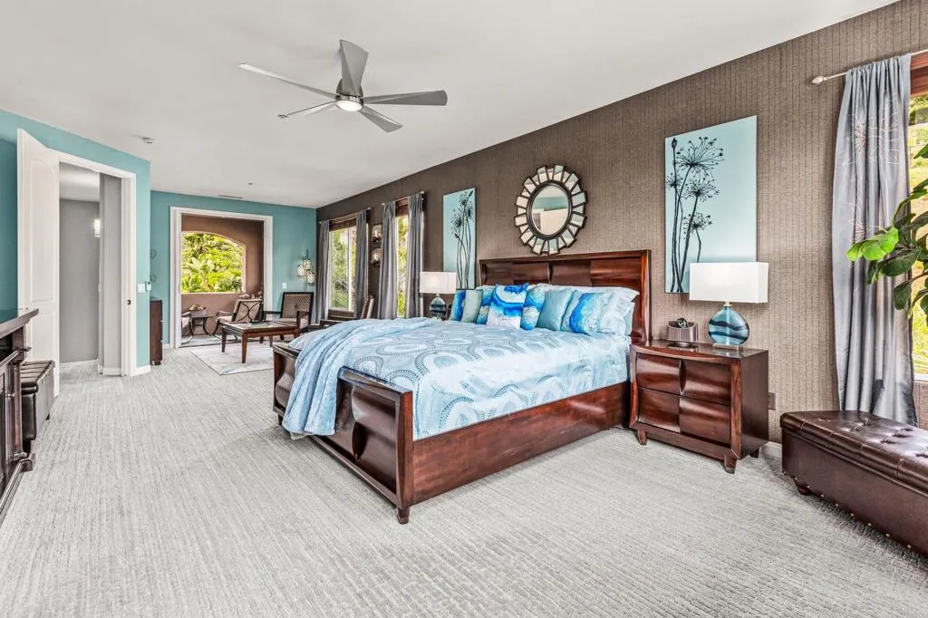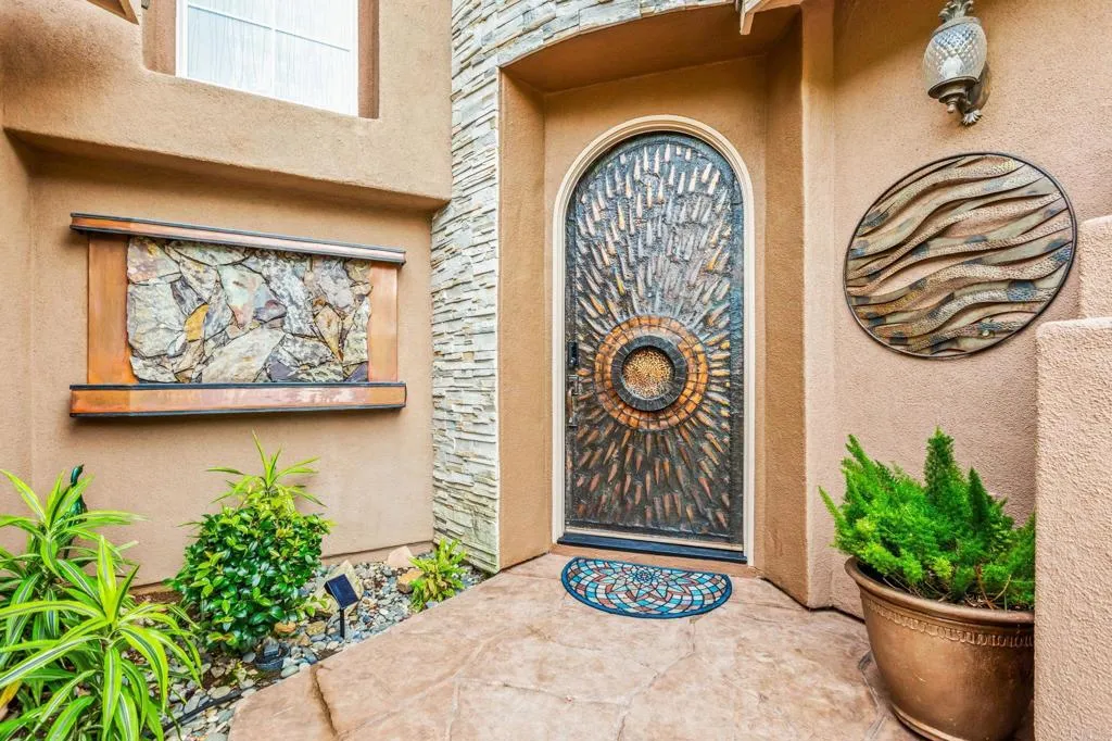 Set within the gated enclave of Vista Grove Estates—an exclusive community of just 24 executive and estate homes on spacious 0.5+ acre parcels in Vista’s highly sought-after Buena Creek area—this beautifully updated residence offers privacy, scale, and a true resort-style living experience. Positioned on an elevated 1.13-acre lot, the home spans approximately 3,454 square feet with 4 bedrooms and 3.5 bathrooms, including a full bedroom and en-suite bath downstairs. The home has been thoughtfully designed with soaring ceilings, expansive living areas, and abundant natural light throughout. The owner is an interior designer and took great care and attention to details during the recent top to bottom renovation. The home offers a cohesive design rarely found in typical properties, creating a refined yet comfortable living environment throughout. At the heart of the home is a stunning, fully remodeled kitchen featuring quartzite countertops, a large waterfall-edge center island, and extensive custom cabinetry with abundant drawer storage. A designer backsplash and newer (approx. 3-year-old) stainless steel appliance suite—including LG double ovens, LG microwave, French door refrigerator, Samsung dishwasher, and a 5-burner cooktop—create a space that is both functional and visually striking. The adjacent living spaces offer seamless flow ideal for both daily living and entertaining, highlighted by dramatic volume ceilings and two beautifully remodeled fireplaces featuring modern fire glass fireplaces—an elevated design detail that adds warmth and visual impact. Long-plank ceramic tile flooring runs throughout the main areas, enhancing the home’s clean, contemporary aesthetic. Upstairs, updated banisters and railings contribute to the home’s modern feel, while the expansive primary suite offers a true retreat. The expansive primary bedroom includes a private balcony—perfect for enjoying morning coffee or evening sunsets with sweeping views. The primary bathroom features a jetted spa tub positioned near a fireplace for a relaxing, resort-style experience, along with an upgraded shower system designed for luxury and functionality. Secondary bathrooms have also been enhanced with high-end multi-function shower panels, offering a spa-like experience throughout the home. The backyard is a true standout—designed for both relaxation and entertaining with multiple outdoor living areas, including a covered lounge space, built-in bar seating, tranquil fountain feature, and lush, mature landscaping. The setting is private, peaceful, and ideal for hosting or unwinding while enjoying Vista’s natural beauty. Additional highlights include dual HVAC systems for efficient climate control, a 3-car garage, extended driveway with ample parking, and the added benefit of sewer connection—an advantage over many properties in more rural areas. Located in the scenic Buena Creek area, known for its rolling hills, open space, and estate-style living, this home offers a rare blend of tranquility and convenience, just minutes to shopping, dining, and approximately 20 minutes to the coast. Offered with a unique opportunity, the home may be sold fully furnished, with nearly all furnishings and décor available for purchase. Interested parties are encouraged to inquire with the listing agent for additional details. This is a rare opportunity to own a thoughtfully upgraded, design-forward estate property in one of Vista’s most desirable gated communities.