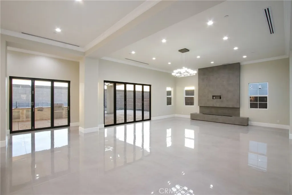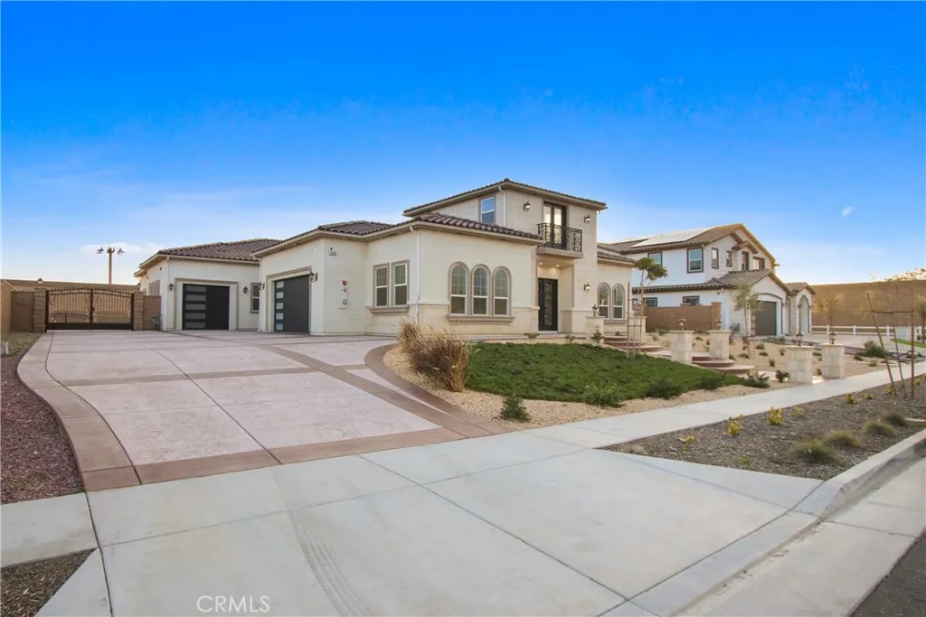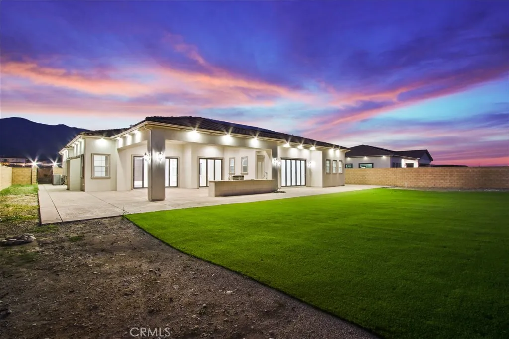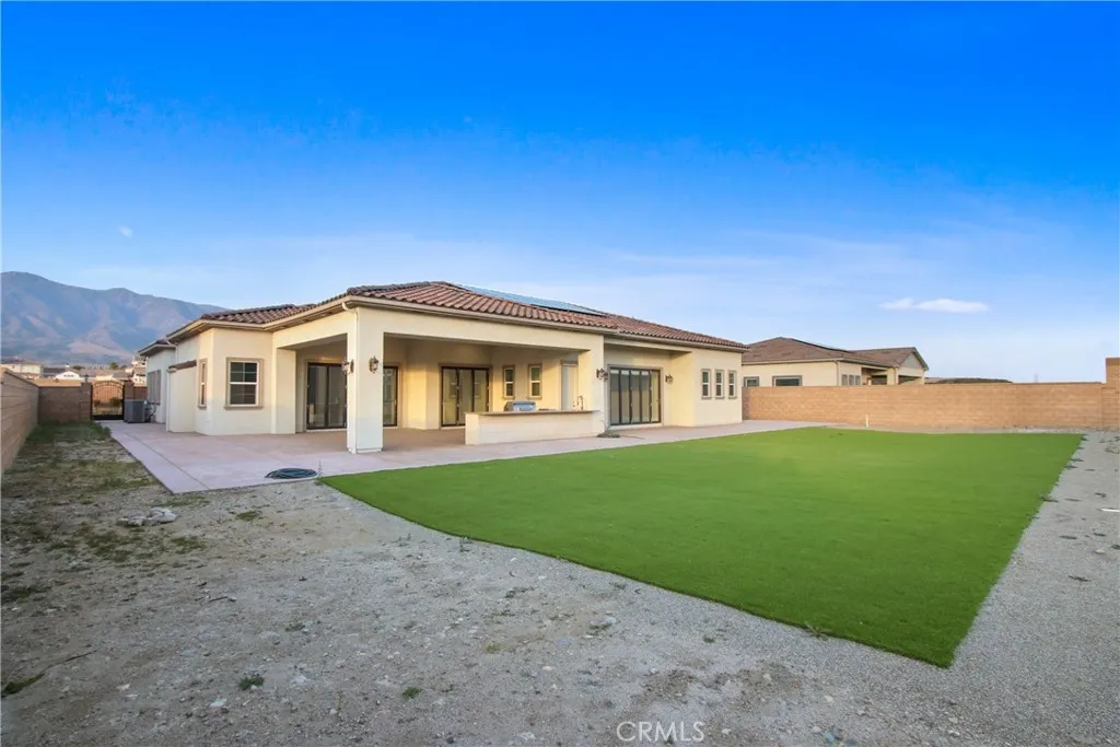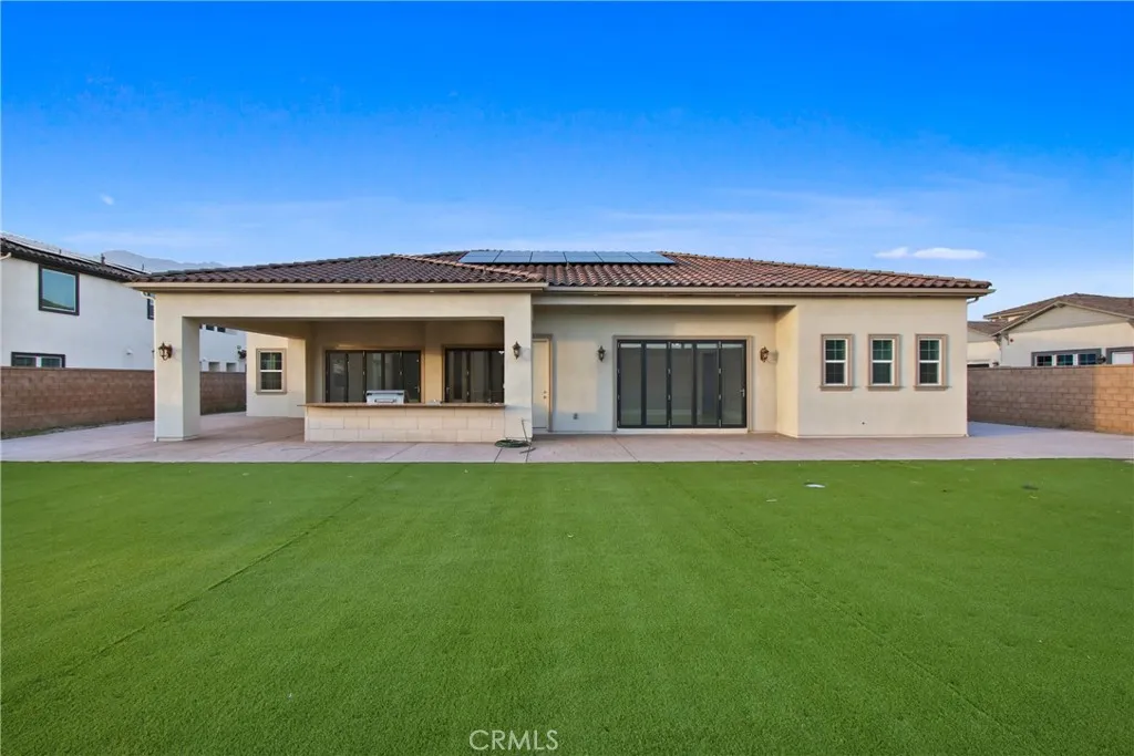 Welcome to 13715 Copley Drive, Rancho Cucamonga, a stunning brand-new luxury estate offering 4 bedrooms, 5.5 bathrooms, and 4,554 sq ft of refined living space on a ½-acre horse-zoned lot in an exclusive enclave of custom homes. Designed for modern living, entertaining, and multi-generational flexibility, this residence impresses from the moment you enter through the 8-foot custom double entry doors, opening to soaring ceilings and a bright open-concept floor plan. Expansive living areas are enhanced by three bi-folding glass doors that seamlessly connect indoor and outdoor spaces. The chef’s kitchen is a showpiece featuring high-end Forno appliances, premium finishes, and generous workspace—ideal for hosting large gatherings. Each bedroom includes its own private en-suite bath, while a striking custom fireplace feature wall adds warmth and architectural elegance. Finishes throughout include Spanish porcelain slab countertops, full-height shower walls, frameless stainless shower doors, and upgraded lighting and plumbing fixtures. Built with efficiency and comfort in mind, the home includes a fully paid solar system with 46 panels, 18kWh system with a battery backup of 13 kWh, dual-zone HVAC, and pre-wiring for smart home features. The outdoor space offers a resort-style setting with RV parking and double gates, stamped colored concrete, a built-in BBQ island, outdoor fireplace, and approximately 3,000 sq ft of premium artificial turf. The flat, usable lot provides excellent ADU potential, while front landscaping features water-saving drip irrigation. Additional highlights include a low tax rate, low HOA, city sewer connection, stunning mountain views, and access to the highly regarded Etiwanda School District. This is a rare opportunity to own a new luxury estate on a half-acre lot in one of Rancho Cucamonga’s most desirable new developments.
