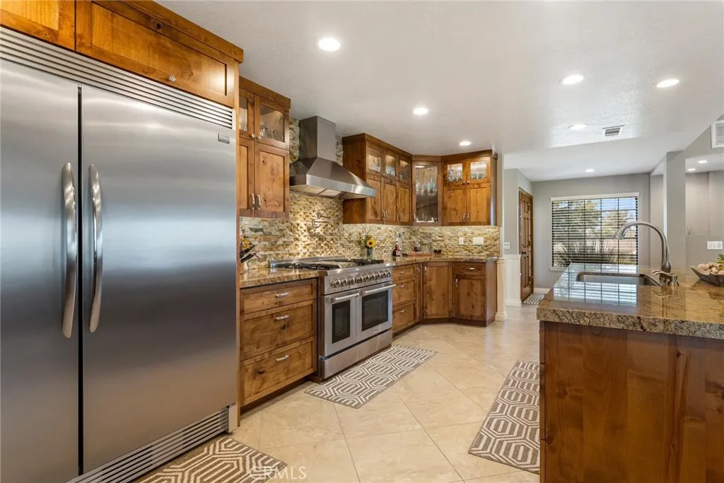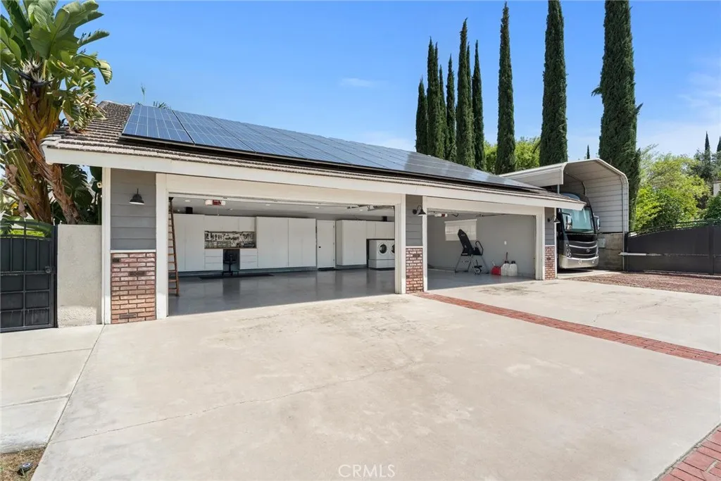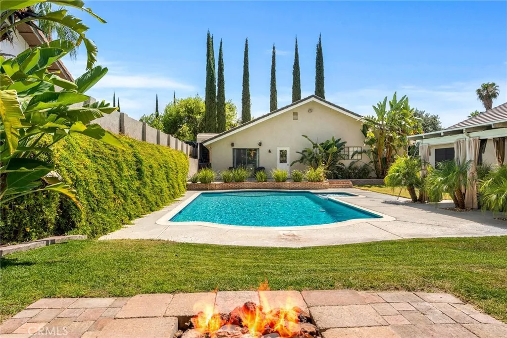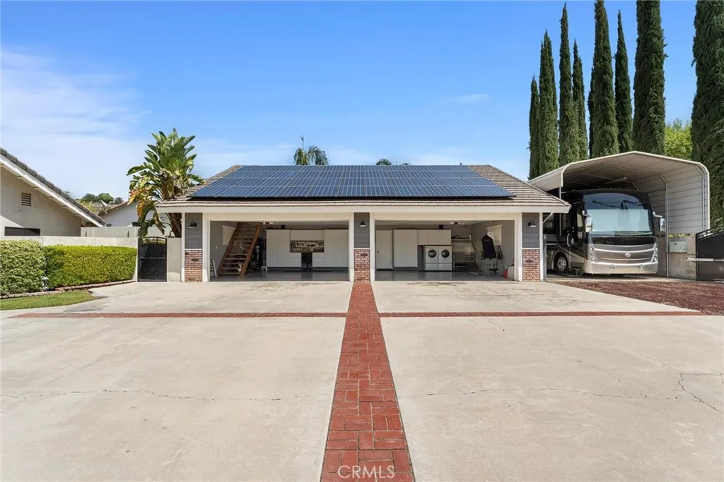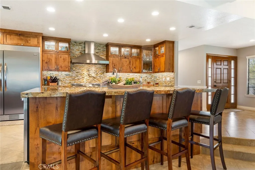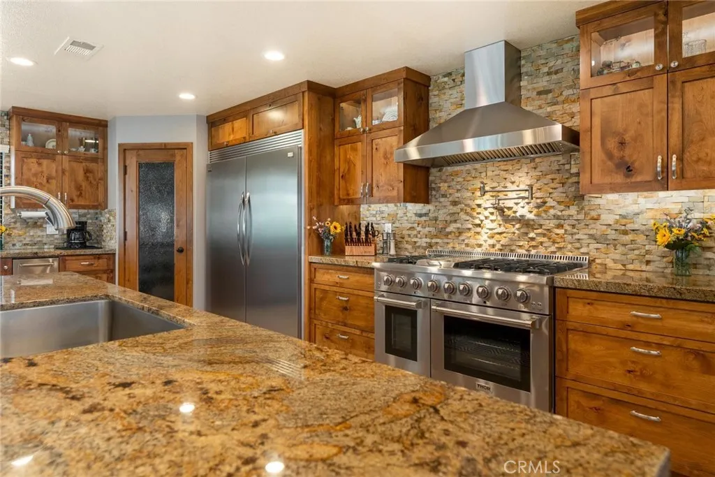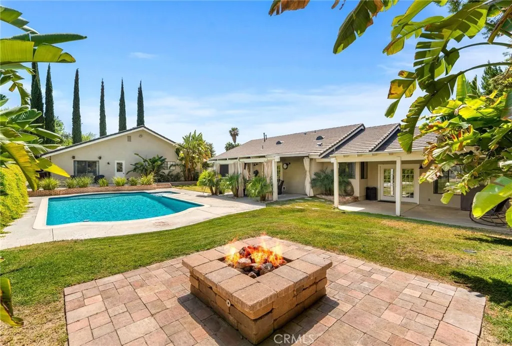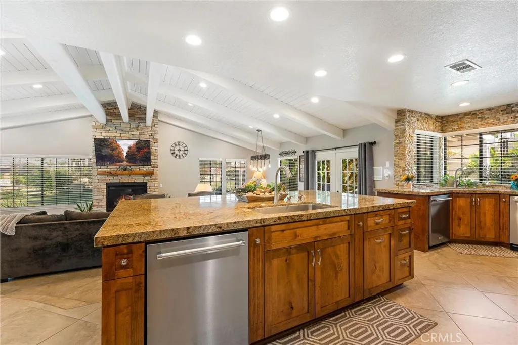 Stunning custom estate (3,007 SQ FT total — main house 2,207 SQ FT + 800 SQ FT ADU) on a .46-acre corner lot adjacent to East Hemet orange groves. Four bedrooms, three baths, vaulted beamed living room, and a chef’s kitchen with single-slab granite, large island, soft-close cabinetry, rock backsplash, pot filler, double-oven range, two dishwashers and trash compactor. Primary suite with crown molding, dual vanities and oversized dual-head shower; all bedrooms fit king beds. Upgrades include paid solar, tankless water heater, reverse osmosis, whole-house attic fan, ethernet, intercom to ADU, and updated plumbing/electrical. ADU features kitchenette, full bath and living area — ideal for guests or multi-generational living. Exterior: 4-car garage with epoxy floors and dog wash, covered RV parking w/ remote gate, 220V and hookups, covered patio, gas fire pit, app-controlled saltwater pool & jacuzzi, landscape and permanent holiday lighting.