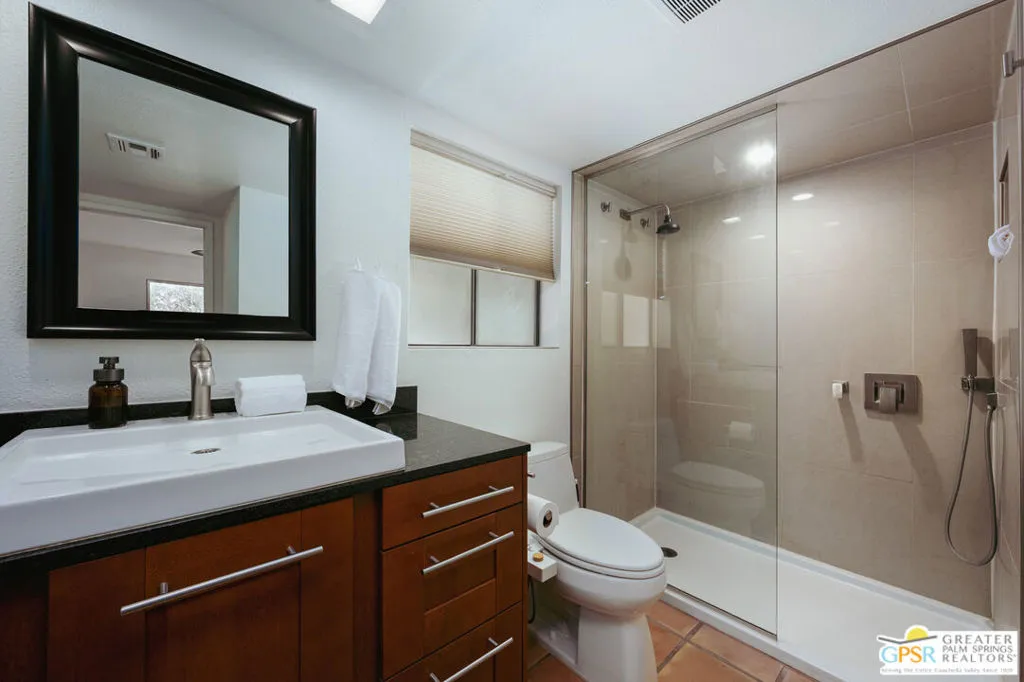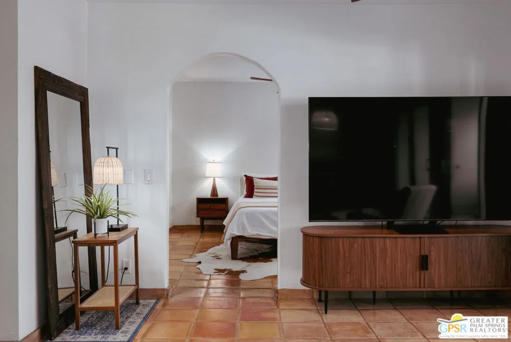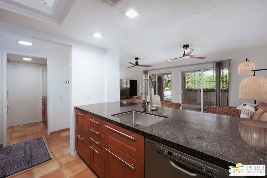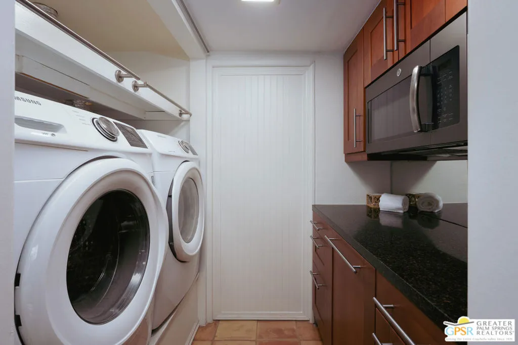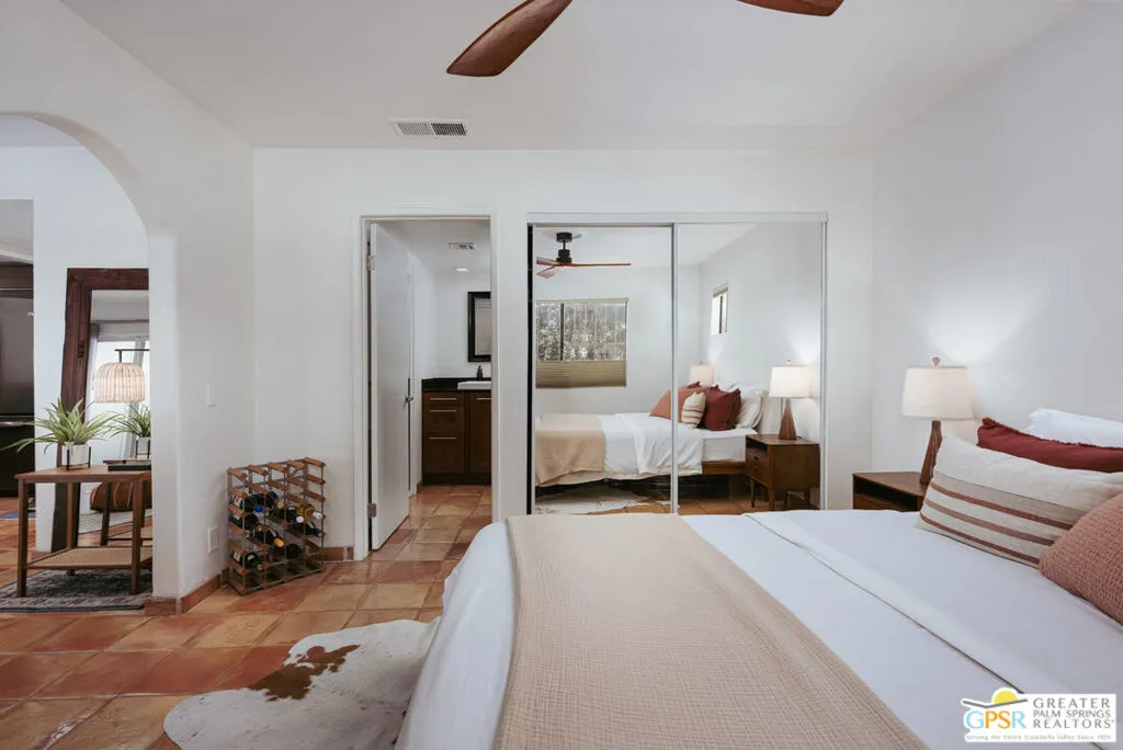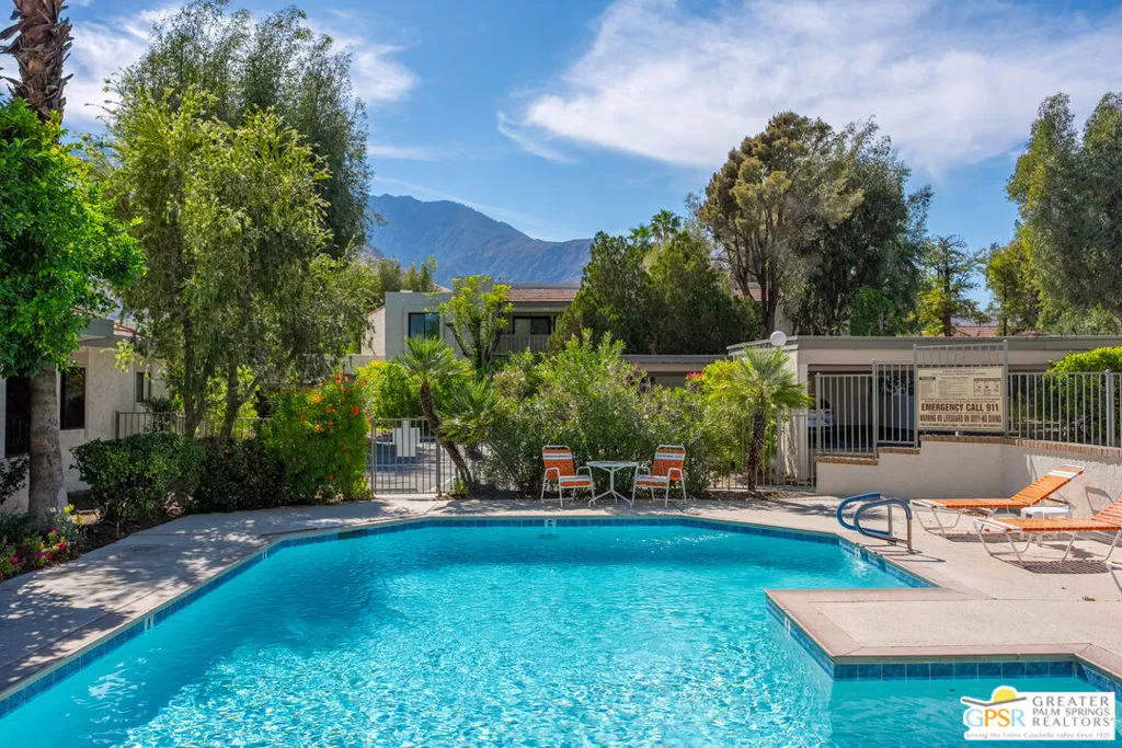 Welcome to this charming ground-floor, one-bedroom, one-bathroom condo nestled in Riviera Gardens. Perfectly positioned on the bottom level with both an interior-facing front door and direct access street-entry, this home offers a rare blend of convenience and privacy. Step inside to discover a thoughtful layout that maximizes every square foot, offering a comfortable and inviting atmosphere ideal for full or part-time residents and investors. The home has been warmly updated with gorgeous Saltillo tile flooring throughout, an extended and remodeled kitchen with quartz countertops, and a full-size laundry area. The low monthly HOA fee covers water, trash, exterior structure maintenance including roof, pools, hot tubs, and lush landscaping allowing for a truly low-maintenance lifestyle. Best of all, there is no land lease so you own the land. Located near Palm Springs' Uptown Design District, Riviera Gardens places you within easy reach of world-class dining, boutique shopping, vibrant nightlife, and the breathtaking natural beauty of the Coachella Valley. Whether you're looking for a weekend getaway or a permanent slice of paradise, this ground-floor gem is your gateway to the ultimate desert lifestyle.