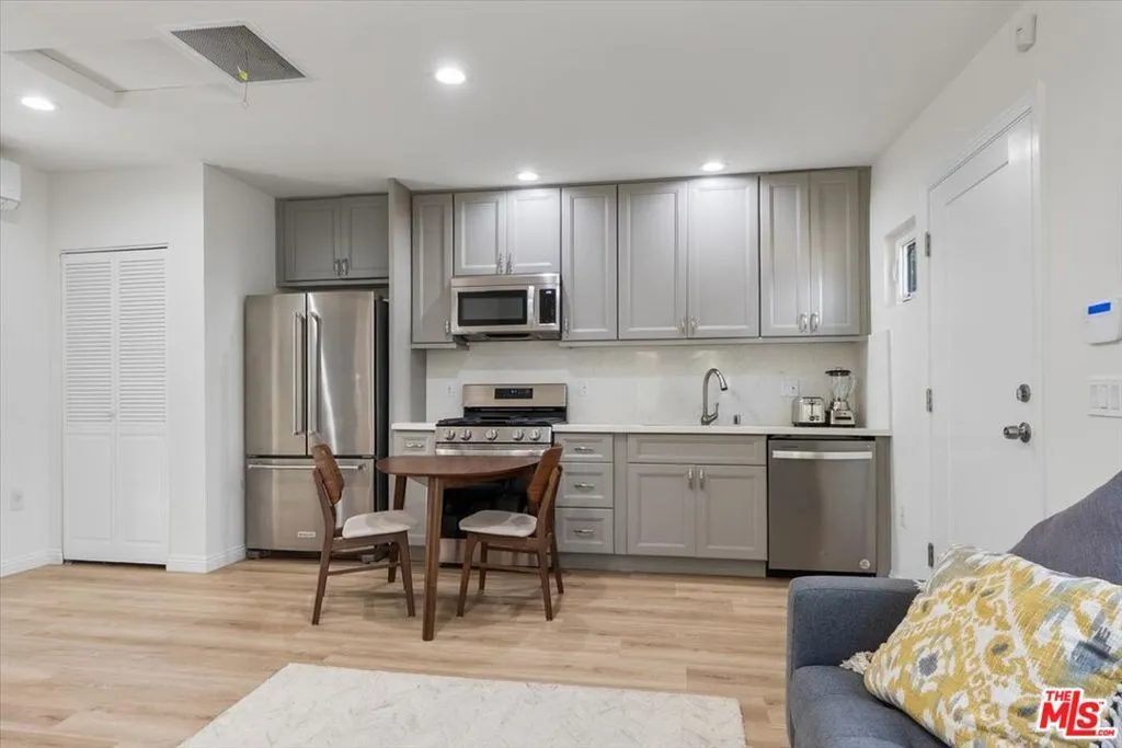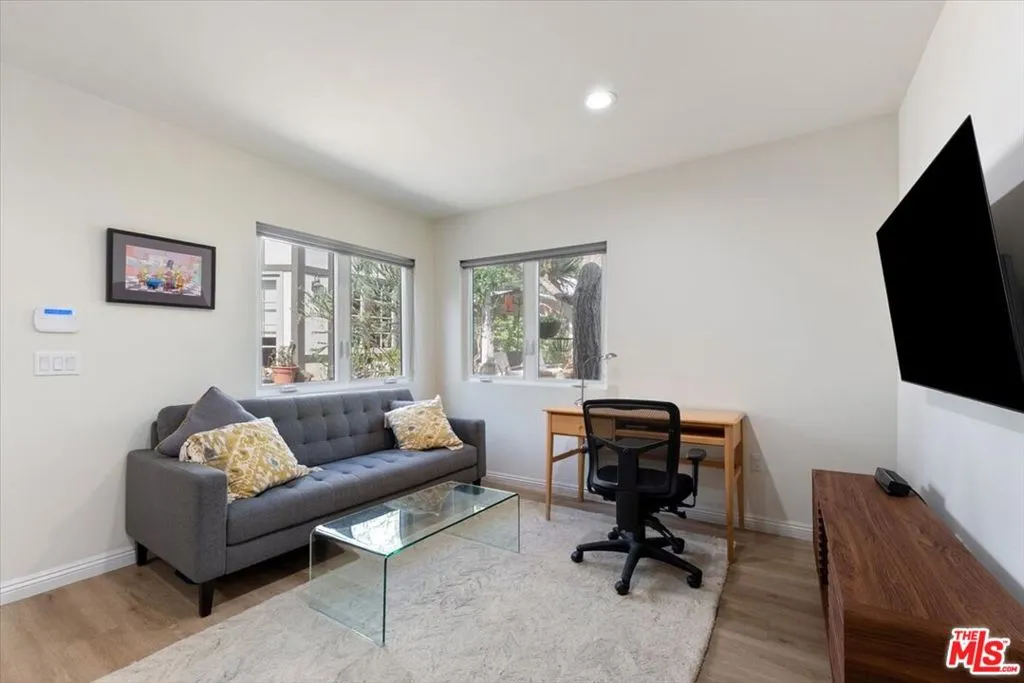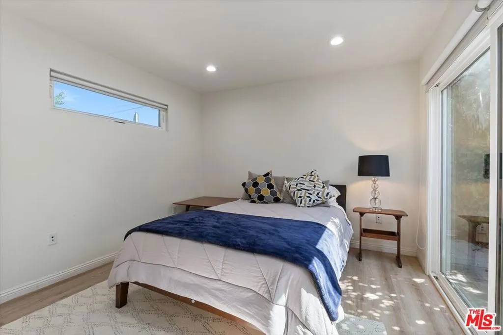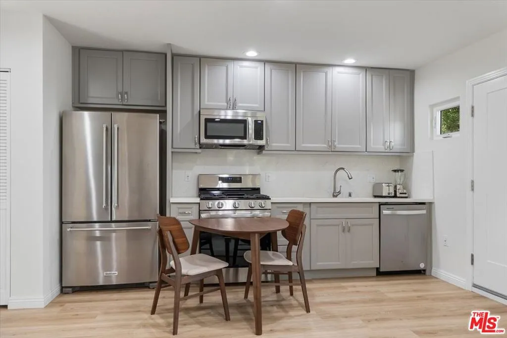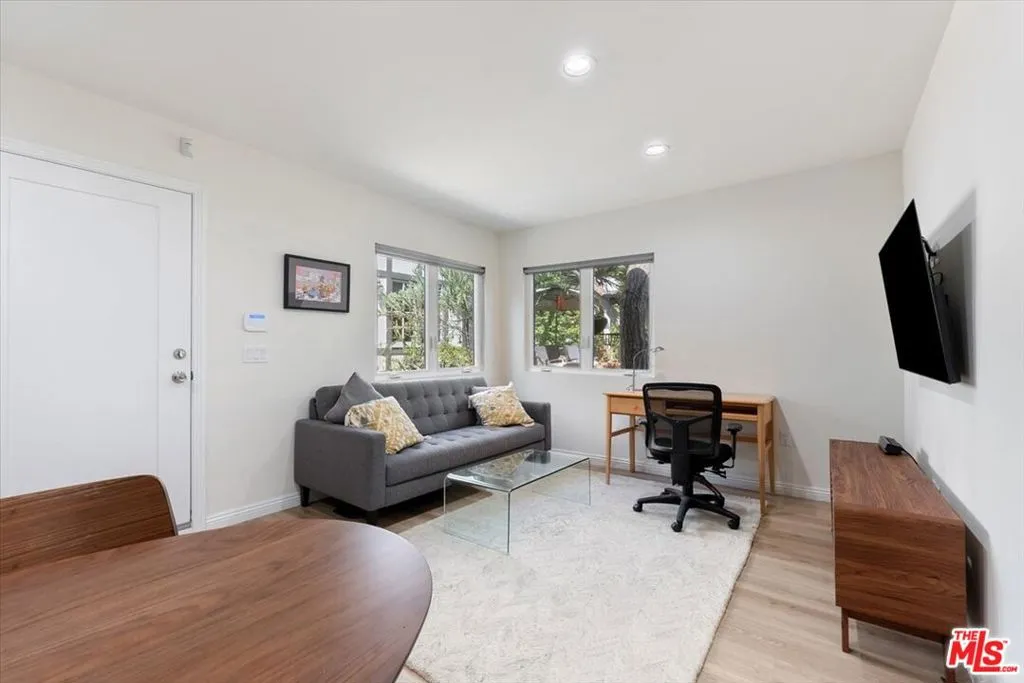 Rare beautiful fully furnished 1-bedroom, 1-bath Santa Monica ADU set within one of the most extraordinary private botanical gardens you'll find anywhere in West LA. This standalone California cottage offers the privacy and serenity of a secluded retreat while sitting just minutes from the beach, Main Street, and Montana Avenue's premier shops and dining. The open-concept living, dining, and kitchen area is bright and airy, anchored by wide-plank luxury vinyl flooring, recessed lighting, and oversized windows framing lush garden views on multiple sides. The living room is tastefully furnished with a gray tufted sofa, glass coffee table, wall-mounted flat screen TV, and a walnut media console. A dedicated workspace with desk and ergonomic chair makes this an ideal setup for remote professionals. The kitchen is fully equipped and beautifully appointed with floor-to-ceiling gray shaker cabinetry, quartz countertops, a marble-look backsplash, and a full suite of stainless steel appliances including a KitchenAid French door refrigerator, five-burner gas range, over-range microwave, and dishwasher. A round dining table with chairs sits adjacent to the kitchen for an easy everyday flow. The bedroom is comfortably sized with recessed lighting, LVP flooring, a mirrored sliding door closet, and a clerestory window for natural light and privacy. It opens directly to a private outdoor patio through a full-width sliding glass door a standout indoor-outdoor feature. The bath is spa-caliber, featuring floor-to-ceiling marble-look tile, a frameless glass-enclosed shower, white shaker vanity, quartz countertop, and brushed nickel fixtures throughout. The unit is equipped with a ductless mini-split HVAC system for year-round comfort, a smart home panel, and central HVAC. Fully furnished and move-in ready. The surrounding grounds are nothing short of remarkable! A mature, curated drought-tolerant botanical garden featuring rare cacti, towering aloes, succulents, paver pathways, and specimen trees cultivated over decades. Multiple outdoor seating areas on the private patio and throughout the garden create a sanctuary feel rarely found in any urban rental.