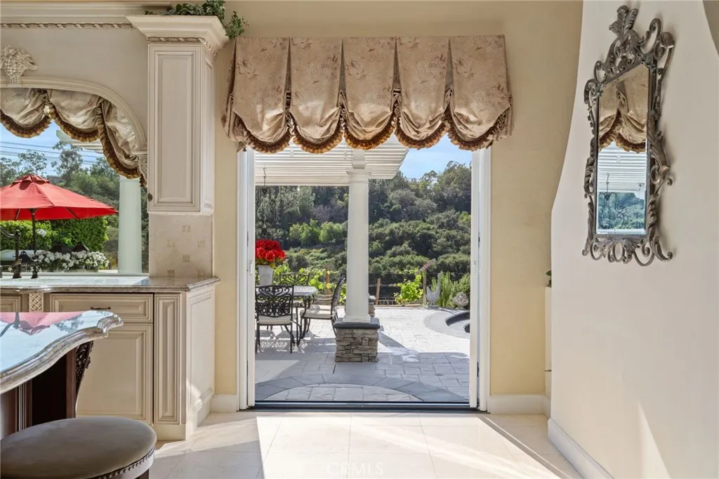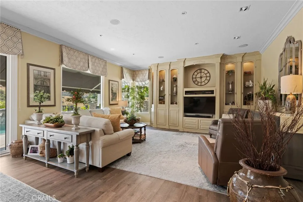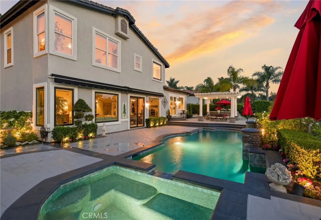 Stunning 5-Bedroom Estate with Pool, Vineyard Views & Luxury Upgrades in the coveted guard gated community of Belsomet. Make a grand entrance through exquisite wrought iron double doors into a breathtaking living room, where soaring vaulted ceilings and abundant natural light create a bright, airy, and sophisticated ambiance. This exceptional 5-bedroom home also features a spacious bonus room with the potential for a 6th bedroom, offering flexibility for growing households, guests, or a home office. The main level includes a highly desirable bedroom with a beautifully updated en suite bathroom—perfect for multigenerational living or visiting guests. At the heart of the home, the upgraded kitchen is a true showpiece, boasting gorgeous limestone with onyx inlay floors, granite countertops, an expansive island with breakfast bar seating, a dedicated eat-in dining area, and a premium Wolf 6-burner stove and oven—ideal for both everyday living and entertaining. The oversized family room provides a warm and inviting gathering space featuring a built-in media niche with storage and surround sound along with a custom wine cellar area and a hidden Viking dual-zone wine refrigerator, adding a unique touch of luxury and convenience. Upstairs, the primary suite has been tastefully remodeled into a private retreat, featuring a walk-in shower, freestanding soaking tub, a large vanity designed and custom closet built for comfort and style. In addition to the primary suite, the upstairs includes three additional bedrooms—one currently configured as a suite with an open layout that can easily be enclosed to create a separate bedroom, and another featuring its own en suite bathroom, offering added comfort and privacy for family or guests. Step outside into your own private Tuscan terrace. The resort-style backyard showcases a sparkling Pebble Tec pool and spa, a dramatic rock waterfall, and a fully equipped BBQ island. Relax or entertain under the pavillion while enjoying breathtaking views of the private canyon and surrounding vineyards. This one-of-a-kind property is situated on a single loaded street with no direct rear neighbors and offers the perfect blend of elegance, comfort, privacy and scenic beauty—an incredible opportunity you won’t want to miss.