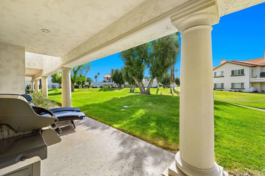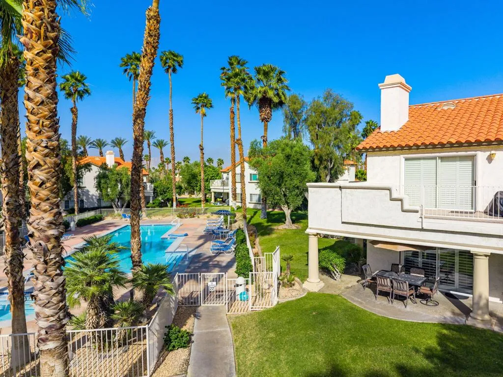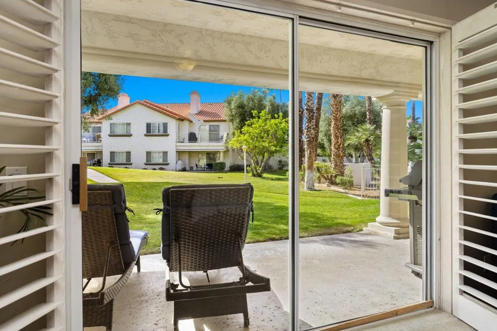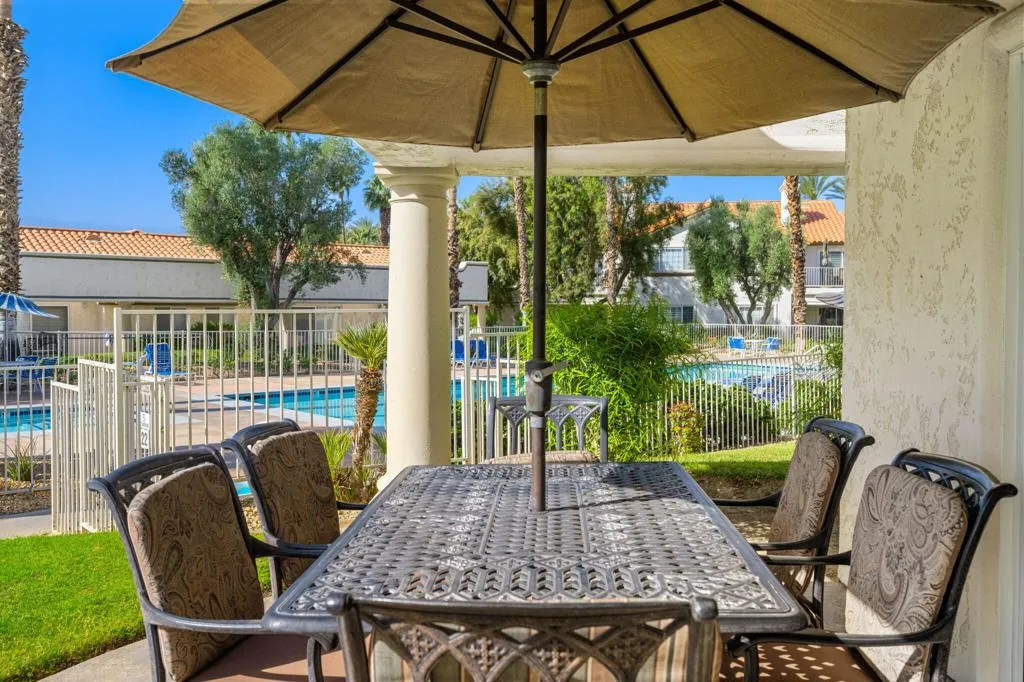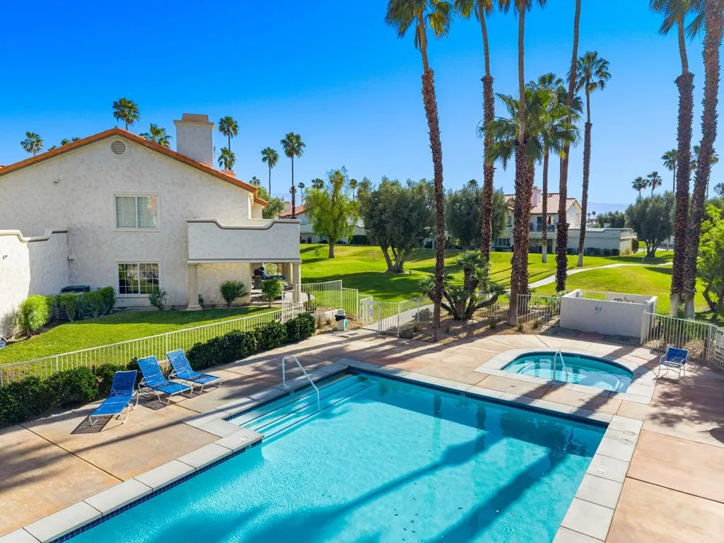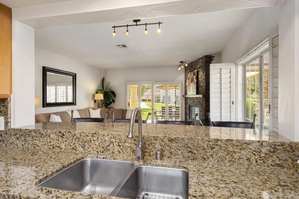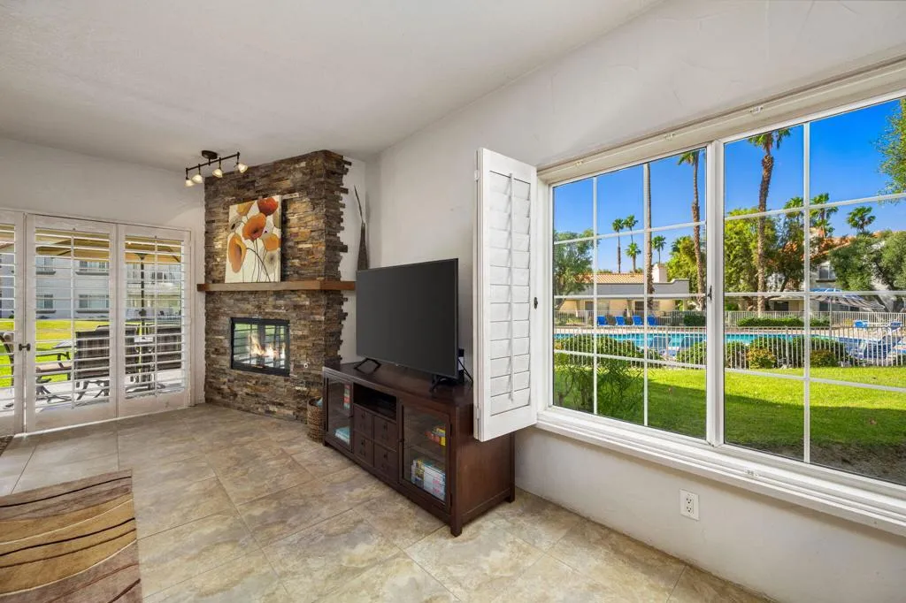 Beautifully remodeled downstairs 3 bedroom, 2 full bath plus powder room condo in guard-gated Desert Falls Country Club. Thoughtfully updated throughout, this inviting home blends stylish finishes with comfortable desert living and a functional indoor-outdoor floorplan.The remodeled kitchen features rich wood cabinetry, granite countertops and backsplash, stainless steel appliances, recessed lighting, and a generous breakfast bar that opens to the living areas, making it ideal for both everyday living and entertaining. The adjacent dining area is filled with natural light and framed by windows with plantation shutters.The spacious living room is highlighted by a dramatic floor-to-ceiling stacked stone fireplace and opens to a covered patio with lush greenbelt and pool views. This peaceful outdoor space is perfect for morning coffee, outdoor dining, or relaxing with friends and family.The primary suite is generously sized and offers direct patio access, plush carpeting, and a beautifully updated bath with dual vanities, a soaking tub, and separate walk-in shower. Two additional bedrooms provide flexibility for guests, office, or den space. The guest bath and powder room have also been tastefully updated, enhancing the home's cohesive remodeled feel.Additional features include updated lighting, neutral finishes, and a desirable downstairs location. Desert Falls Country Club is known for its beautiful grounds.Residents enjoy access to pickleball, tennis, fitness amenities, and an active social community. Ideally located in Palm Desert, the property is convenient to nearby groceries, dining, and retail--easily reached by foot, golf cart, or car. El Paseo's world-class shopping and Acrisure Arena--home to the Coachella Valley Firebirds, concerts, and headline entertainment--are just a short drive away.Whether you are looking for a full-time residence, seasonal retreat, or investment opportunity, this condo offers exceptional versatility. Short term rentals are allowed in Desert Falls, making this an appealing option for those seeking both personal enjoyment and income potential.