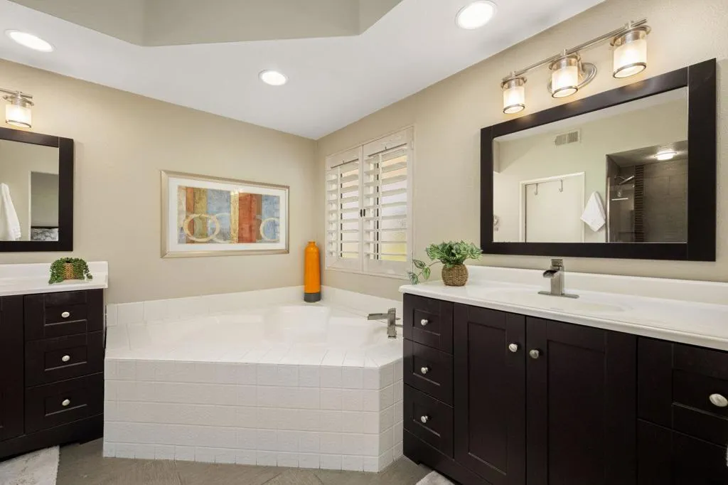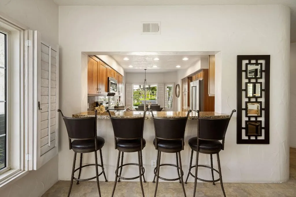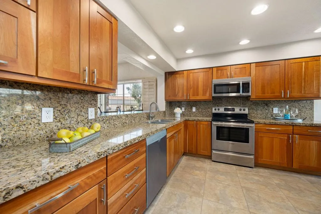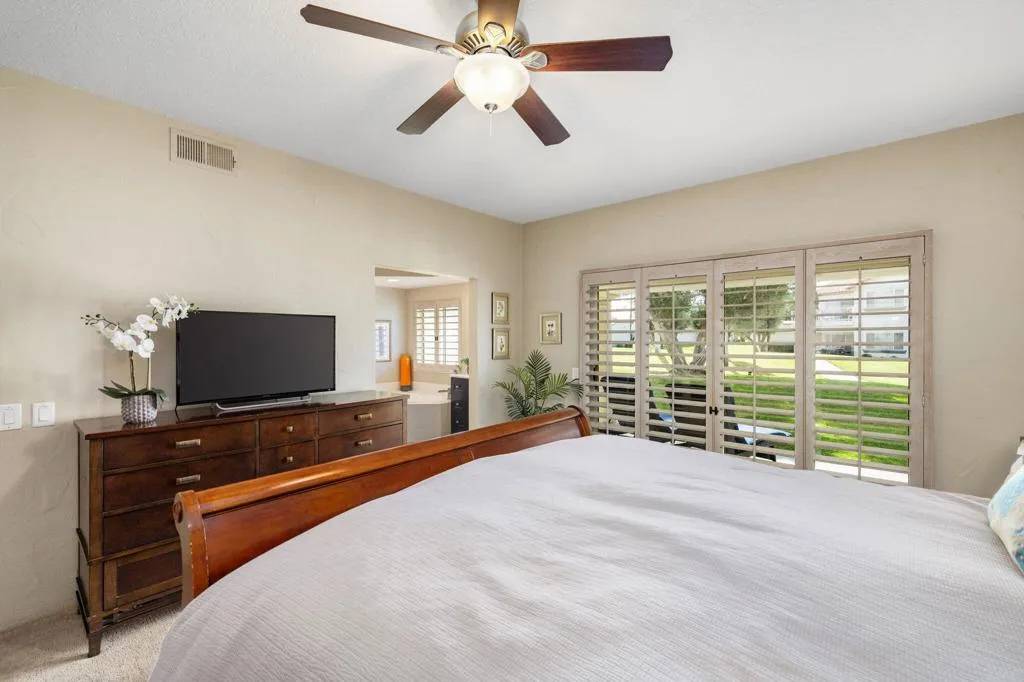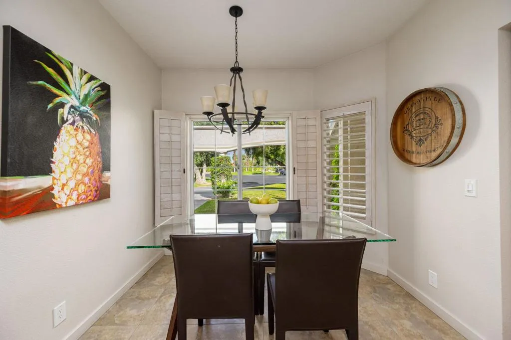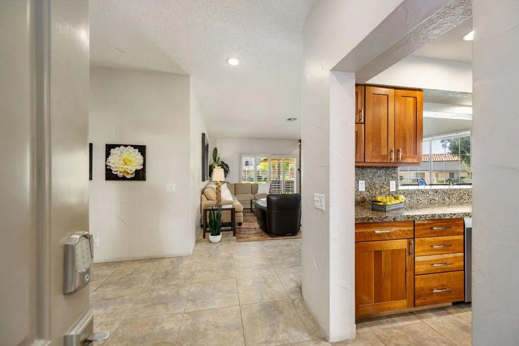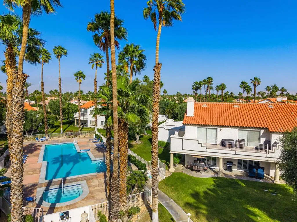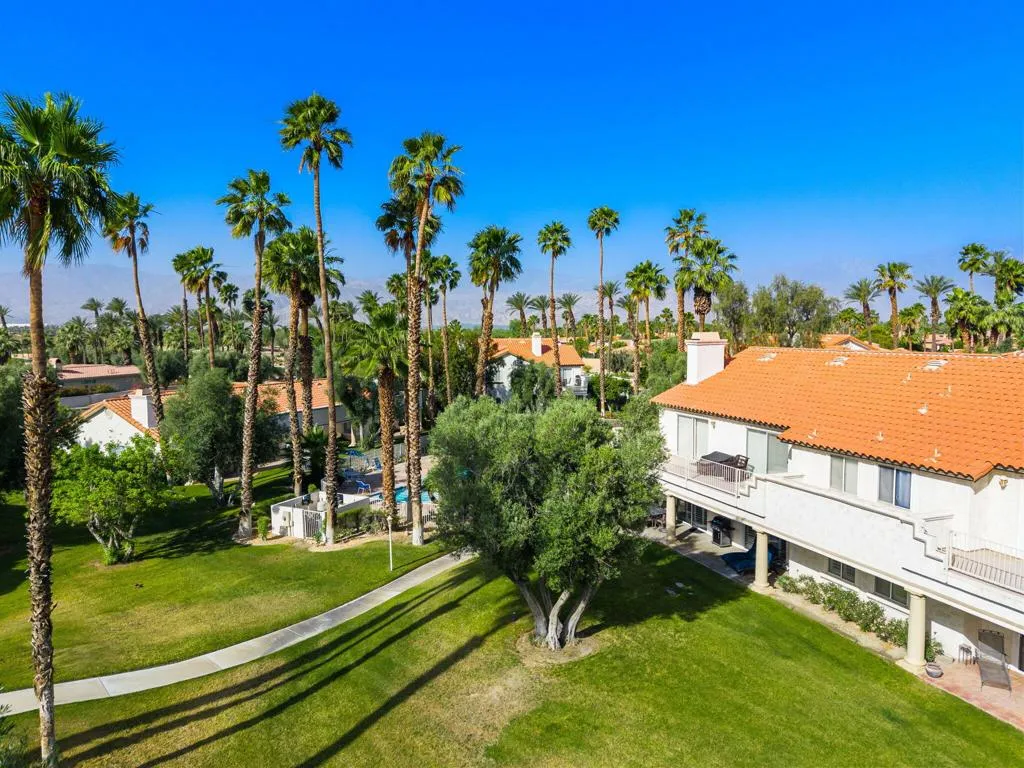 Beautifully remodeled downstairs 3 bedroom, 2 full bath plus powder room condo in guard-gated Desert Falls Country Club. Thoughtfully updated throughout, this inviting home blends stylish finishes with comfortable desert living and a functional indoor-outdoor floorplan.The remodeled kitchen features rich wood cabinetry, granite countertops and backsplash, stainless steel appliances, recessed lighting, and a generous breakfast bar that opens to the living areas, making it ideal for both everyday living and entertaining. The adjacent dining area is filled with natural light and framed by windows with plantation shutters.The spacious living room is highlighted by a dramatic floor-to-ceiling stacked stone fireplace and opens to a covered patio with lush greenbelt and pool views. This peaceful outdoor space is perfect for morning coffee, outdoor dining, or relaxing with friends and family.The primary suite is generously sized and offers direct patio access, plush carpeting, and a beautifully updated bath with dual vanities, a soaking tub, and separate walk-in shower. Two additional bedrooms provide flexibility for guests, office, or den space. The guest bath and powder room have also been tastefully updated, enhancing the home's cohesive remodeled feel.Additional features include updated lighting, neutral finishes, and a desirable downstairs location. Desert Falls Country Club is known for its beautiful grounds.Residents enjoy access to pickleball, tennis, fitness amenities, and an active social community. Ideally located in Palm Desert, the property is convenient to nearby groceries, dining, and retail--easily reached by foot, golf cart, or car. El Paseo's world-class shopping and Acrisure Arena--home to the Coachella Valley Firebirds, concerts, and headline entertainment--are just a short drive away.Whether you are looking for a full-time residence, seasonal retreat, or investment opportunity, this condo offers exceptional versatility. Short term rentals are allowed in Desert Falls, making this an appealing option for those seeking both personal enjoyment and income potential.