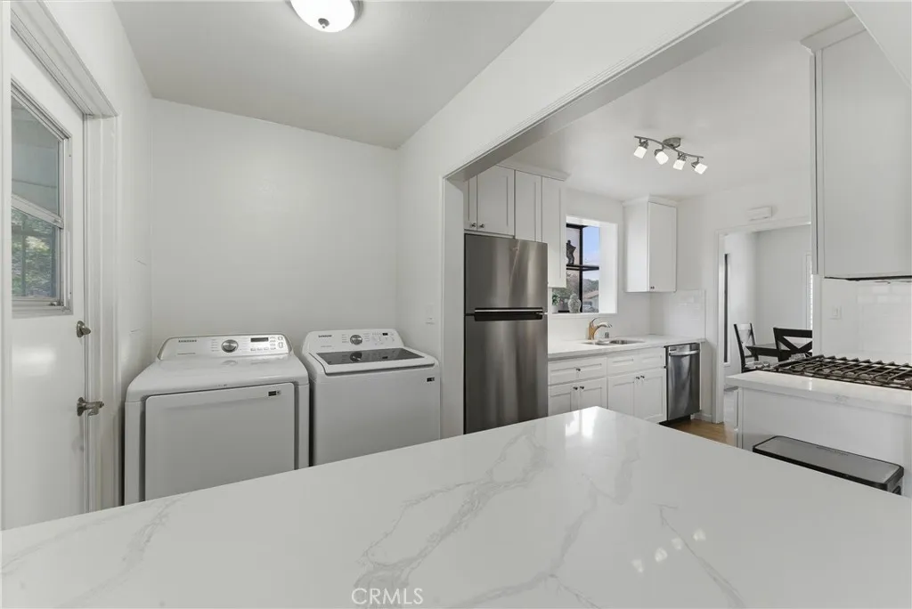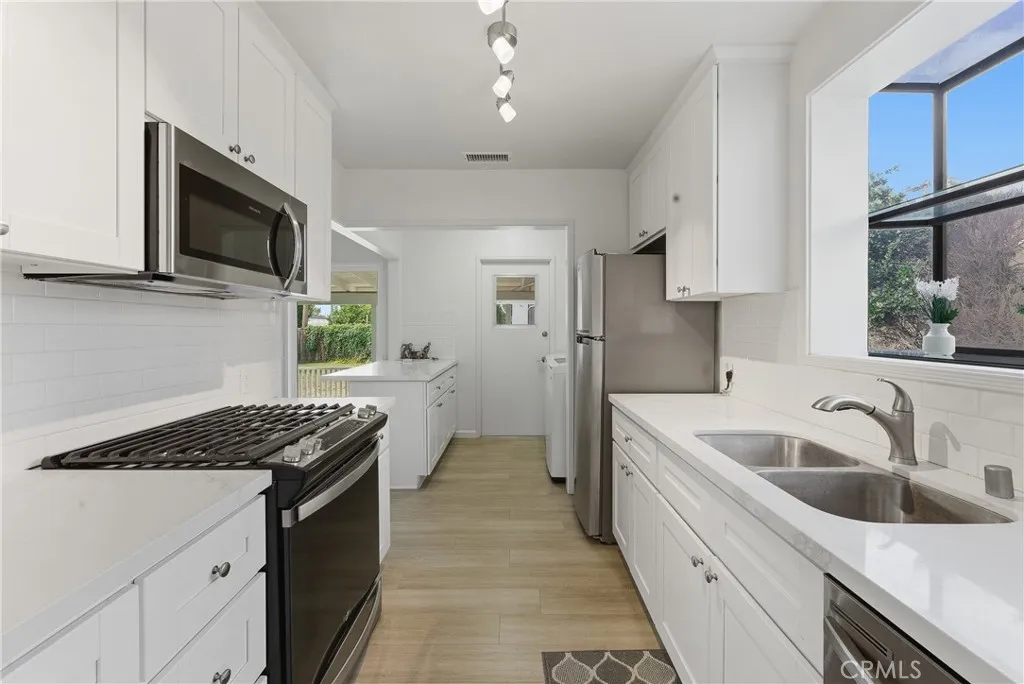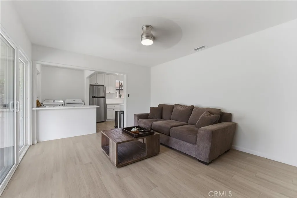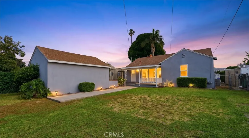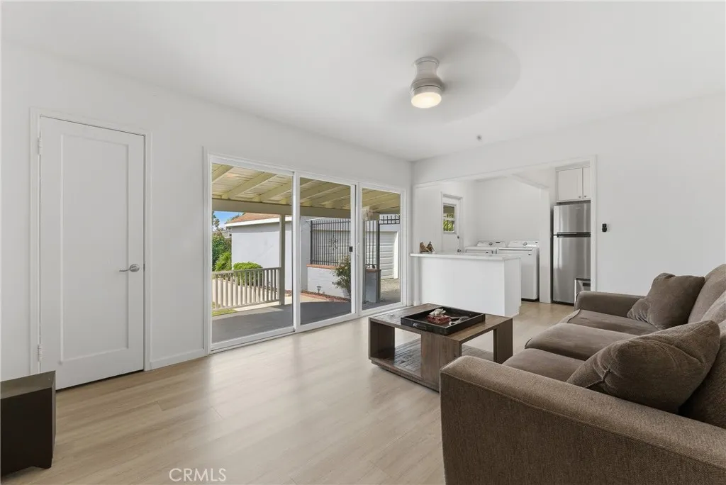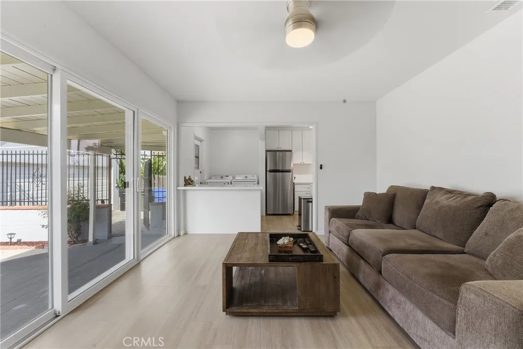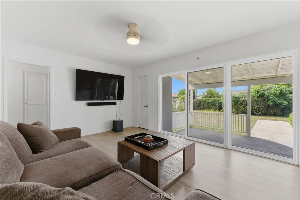 Ready to move-in! This beautifully charming home is ideally located in a great neighborhood, close to parks, schools, restaurants, shopping centers, and offers easy access to major freeways. The interior features laminated wood flooring throughout, a formal living room with a dining area, and multiple windows that bring in an abundance of natural light. Additional highlights include shutters and a unique painted glass window accent near the dining area. The updated kitchen is equipped with stainless steel appliances, including a dishwasher, and flows seamlessly into the main living spaces. Title reflects 3 bedrooms; however, the third room is currently utilized as a spacious family room with sliding glass doors that open to the kitchen area—perfect for entertaining or flexible living. The home also offers two generously sized guest bedrooms and an updated bathroom. Additional features include a convenient laundry area near the kitchen, central A/C, and water sprinklers. The long driveway leads to a detached rear garage with excellent potential for ADU conversion (buyer to verify). The expansive backyard includes a covered patio area and provides ample space to entertain family and friends or create your ideal outdoor retreat.