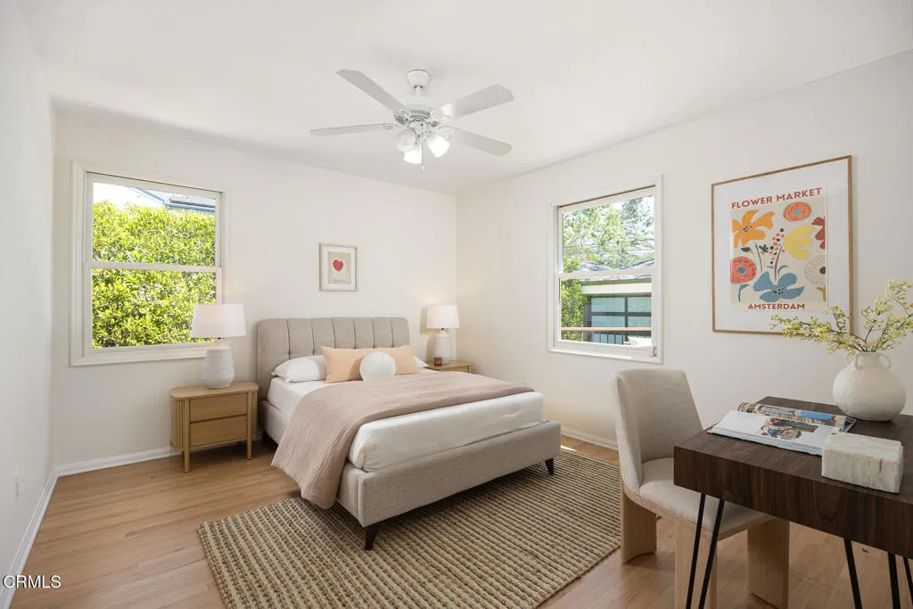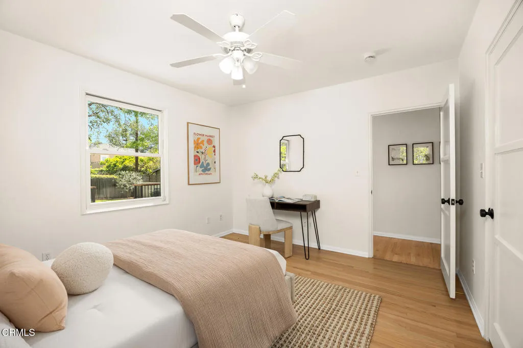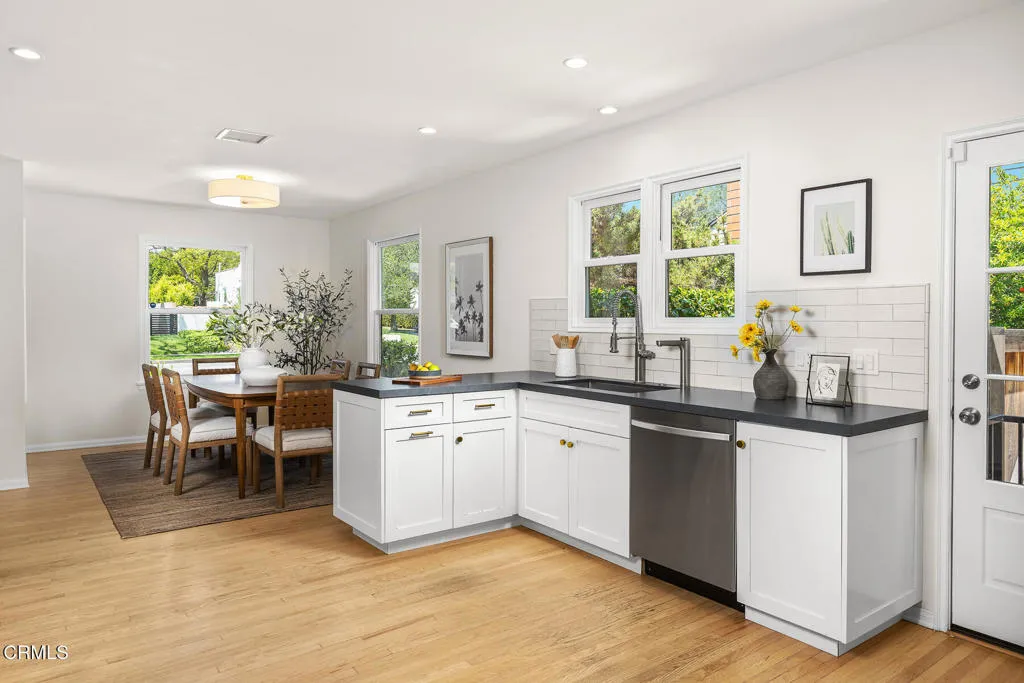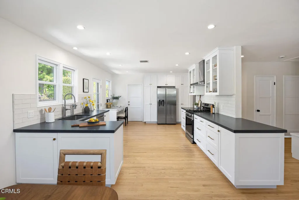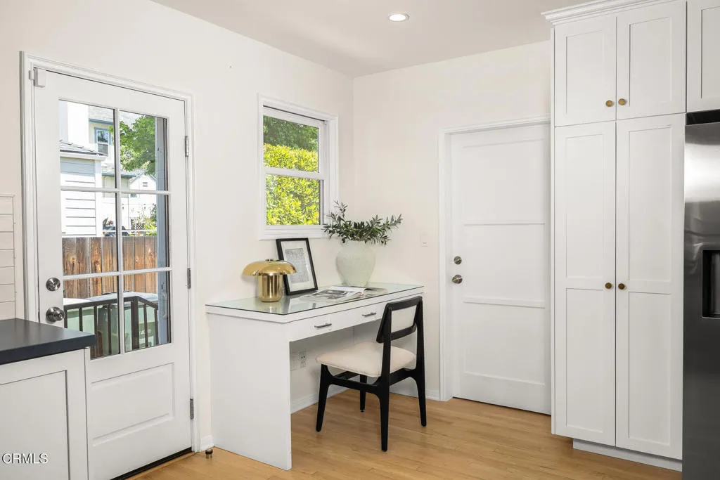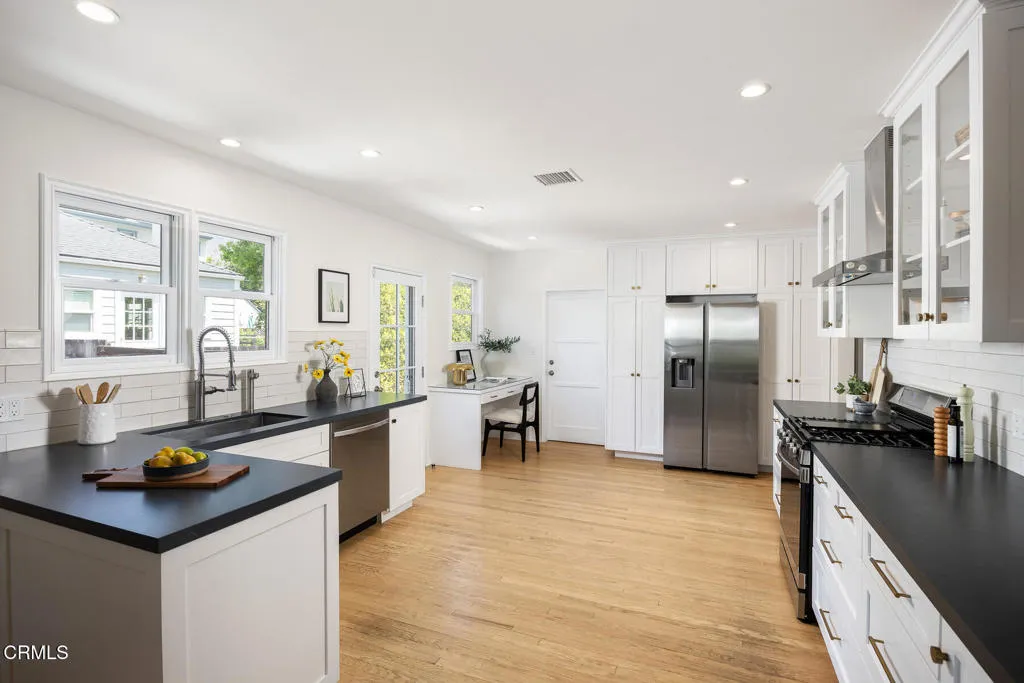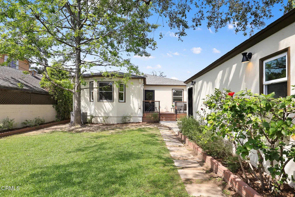 Tastefully Remodeled Pasadena Gem with Designer Touches. Beautifully updated Pasadena home, where timeless charm meets modern elegance. From the moment you step inside, you'll be drawn in by the open floor plan, thoughtfully designed to create a seamless flow between the living, dining, and kitchen spaces--perfect for entertaining and everyday living. At the heart of the home lies a chef's kitchen featuring Silestone quartz countertops, custom cabinetry adorned with Restoration Hardware finishes, and high-end appliances. The dining area and built-in shelving add both function and sophistication, while the living room is anchored by a stylish fireplace, creating a warm and inviting ambiance. This 3-bedroom, 2-bathroom home includes a tranquil primary suite with custom pocket door access to the attached nursery--ideal for growing families. Both bathrooms have been tastefully remodeled with modern finishes. You'll find dual pane windows throughout, complemented by updated, high-end Therma-Tru fiberglass doors at both the front and back entry points. Additional amenities include a newer HVAC system, newer water heater, convenient laundry closet with upper cabinets and a California basement ideal for additional storage space. Playful backyard offers a serene retreat with a cozy deck, lawn area, mature olive tree, and tall ficus hedges lining the property for added privacy. Detached garage has been fully finished and thoughtfully upgraded with plumbing, a sealed concrete floor, a barn door leading to bathroom, a mini-split AC system for year-round comfort, and a brand-new top-tier garage door. Perfect as a creative studio, guest suite, home office, or gym. This move-in ready Pasadena home is a rare find--blending elevated design, comfort, and function in one of the city's most desirable neighborhoods.