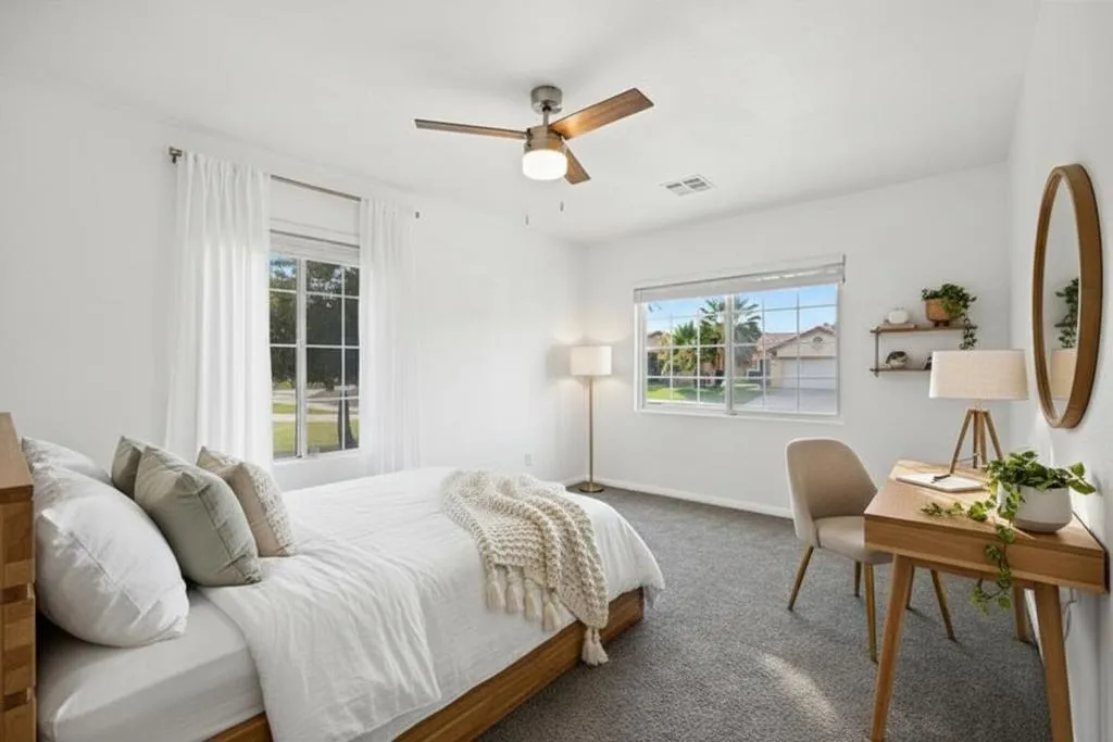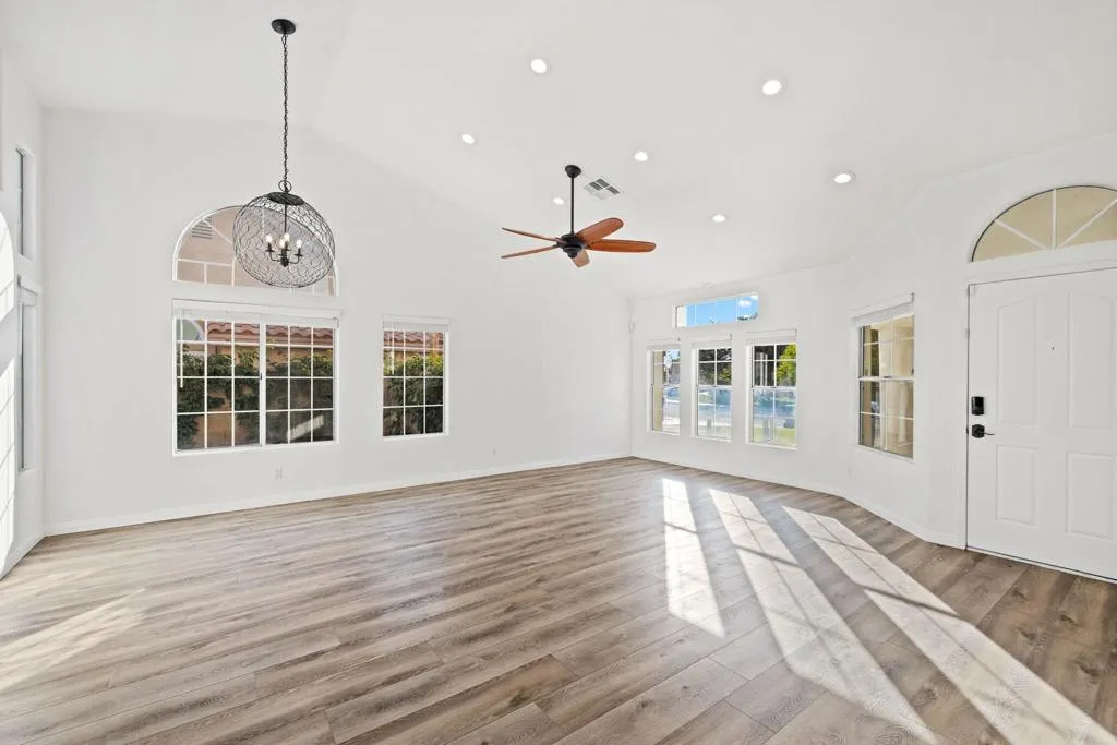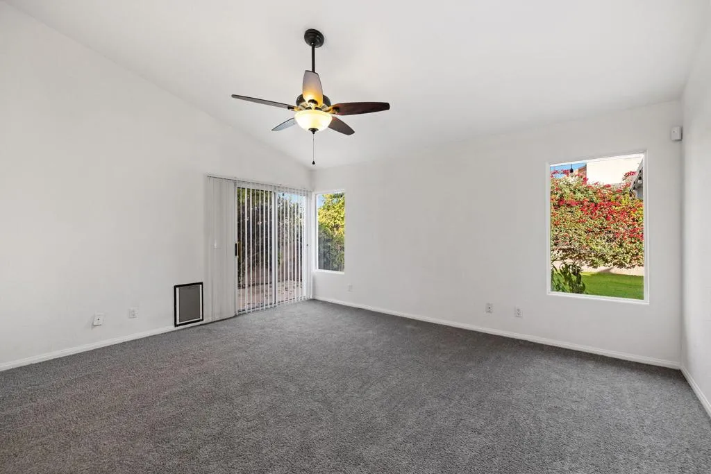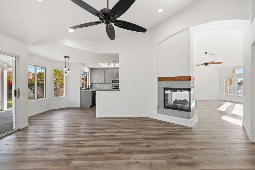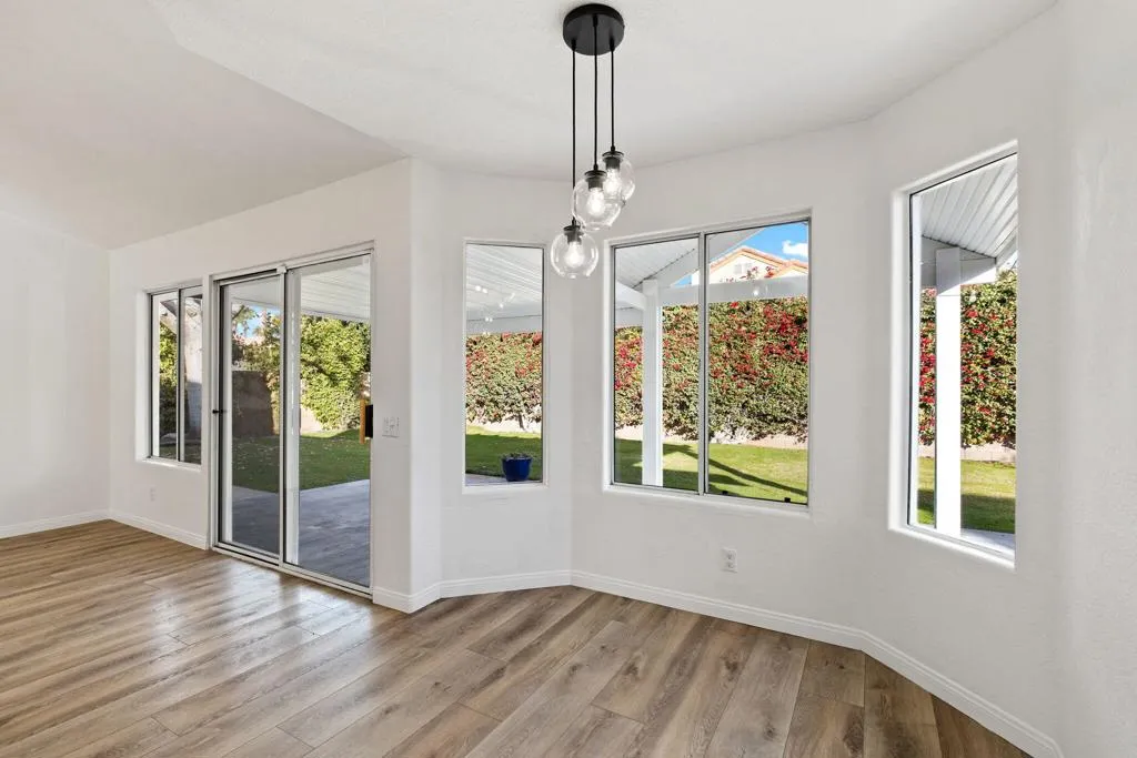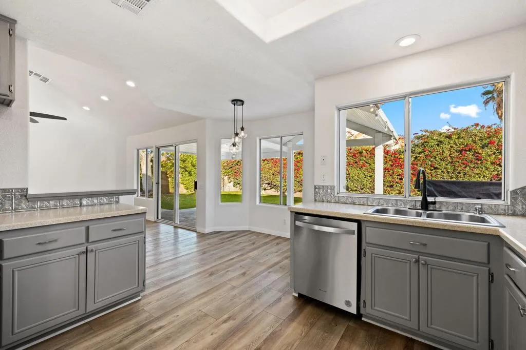 Welcome to this chic desert home in the highly sought-after La Quinta Vistas neighborhood. Step inside to a light-filled open concept living and dining area, beautifully appointed with wood-look flooring and stylish modern lighting throughout. A cozy fireplace creates a warm and inviting separation between the living and family rooms. The adjacent kitchen is both functional and welcoming, featuring contemporary gray cabinetry, newer stainless steel appliances, and a charming breakfast nook, perfect for casual mornings or relaxed gatherings. This home offers four generously sized bedrooms and a tastefully updated guest bathroom. The primary suite serves as a private retreat with dual sinks, a soaking tub, a walk-in closet, and direct access to the backyard. Enjoy the expansive backyard with mature landscaping, ideal for entertaining, complete with a built-in BBQ, a cozy side patio and ample space to design your dream pool and outdoor living area. Additional highlights include a two car garage and laundry room. Conveniently located near the Indian Wells Tennis Garden, dining, shopping, entertainment, world class golf, festivals, and highly rated schools. IID for lower cost electricity and NO HOA! A fantastic opportunity you won't want to miss! (Virtual pool and virtual staging)