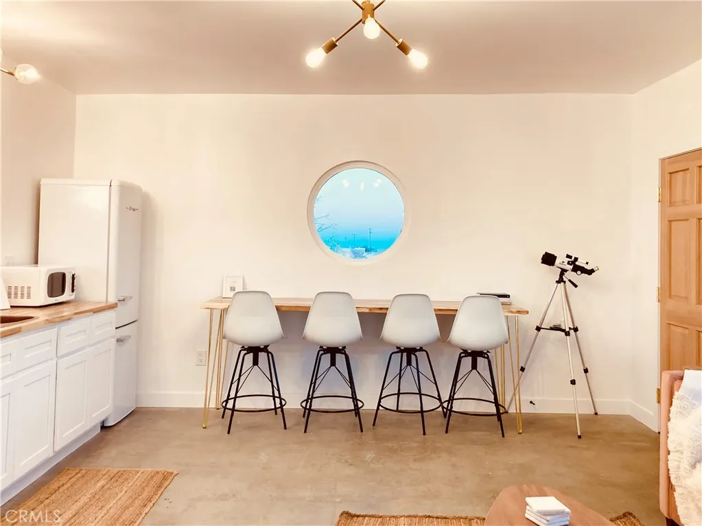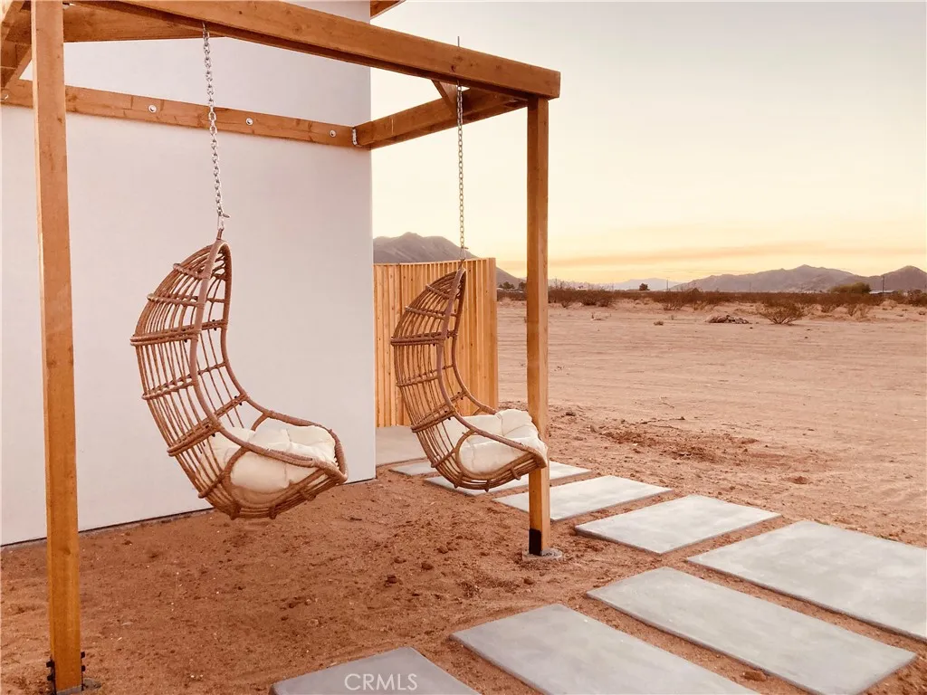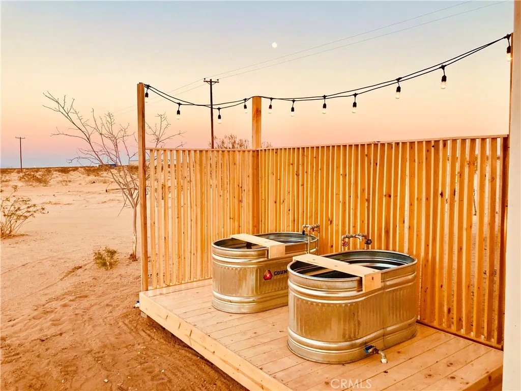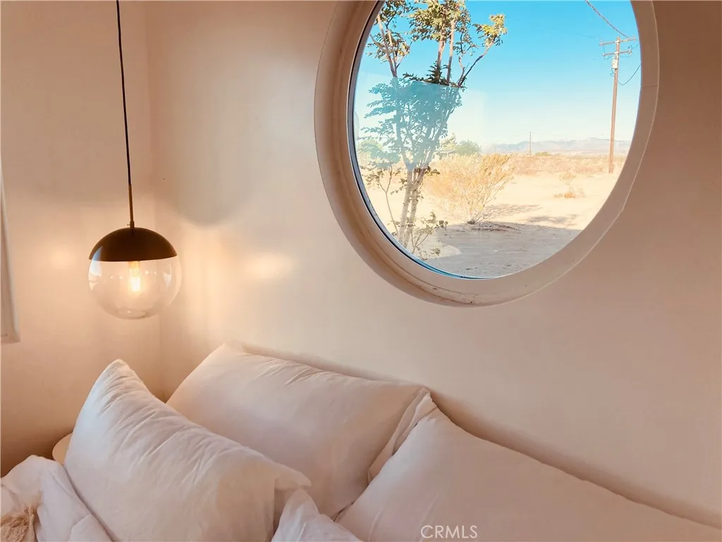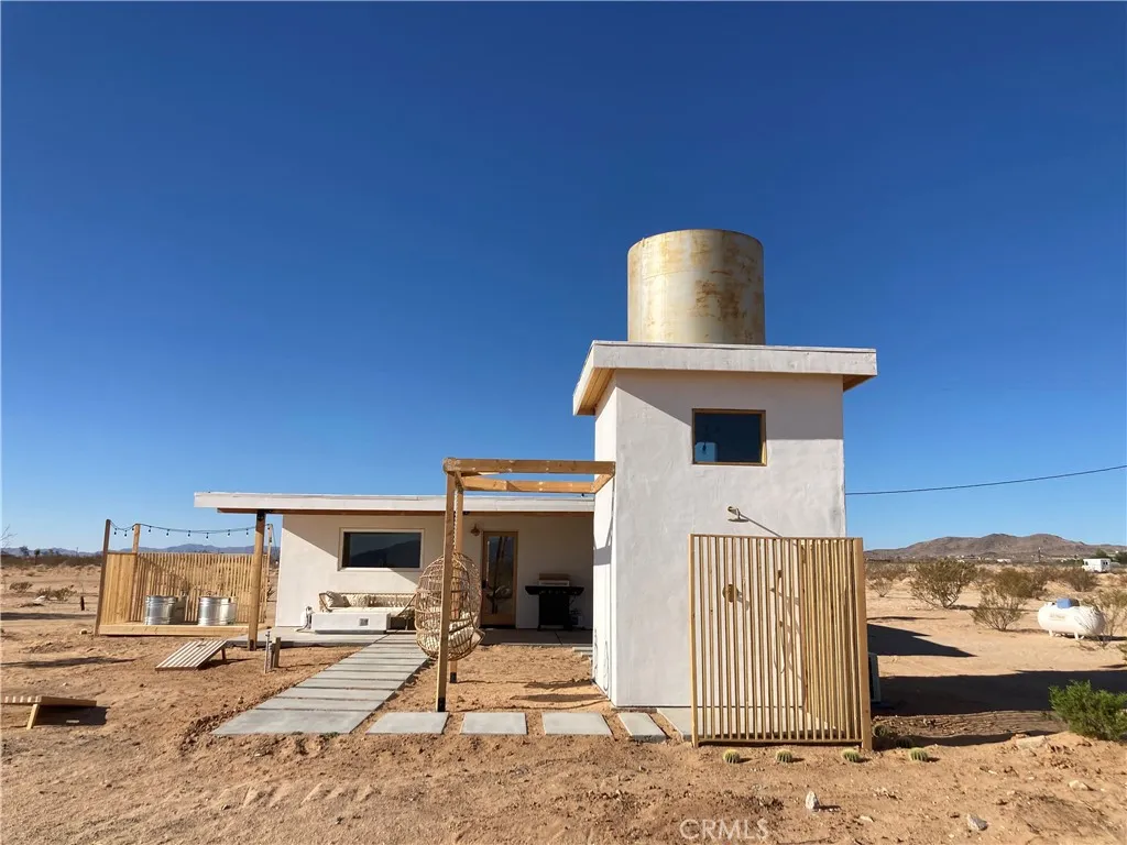 Looking for a fully turnkey, successful Airbnb to purchase and make your own... Introducing "The Luna Lookout - Double Tubs". This home's renovation was permitted including the conversation from a recreational cabin to an SFR home with a detached historic water tower and an upgraded electric panel. Experience incredible desert views, huge harvest moons and star filled nights. Nestled on a vast 5-acre property, this custom redesigned 1 bedroom, 1 bath residence offers stylish designer finishes and panoramic desert views. Designer touches include: gorgeous modern tiling, a walk out shower with French doors, oversized round windows, real copper sinks, pot filler, butcher block countertops, a high bar that flexes as an office space, wood mid century paneling and the original concrete floors. With wifi, city water, and fully on grid electric this house gives popular off grid vibes while being fully on grid. It has a tankless "on demand" water heater and new appliances. Zero details have been overlooked. Amenities include: hammocks, an outdoor shower, outdoor concrete firepit with a shaded lounge area, grill, and double hot or cold plunge tubs that are a huge hit with guests. The property converted the historic water tower to a fully heated and cooled laundry and storage room with a "lookout tower" for stargazing or watching wild life. Its thoughtful layout integrates the inside with the outside optimizing this tiny home into a luxurious space. Come experience why Joshua Tree is world renowned for its fusion of modern luxury and natural beauty and discover why guests consistently rate this Airbnb destination as a perfect 5-star escape. All furniture, furnishings, and supplies are negotiable and can convey with no value or warranty. Can be Sold Fully Furnished: All furniture, furnishings, and supplies are negotiable and can convey with no value or warranty. Permitted renovation and conversion from Rec Cabin to SFR is complete. No seller Carry.