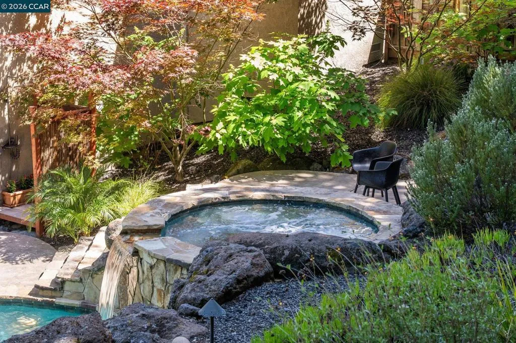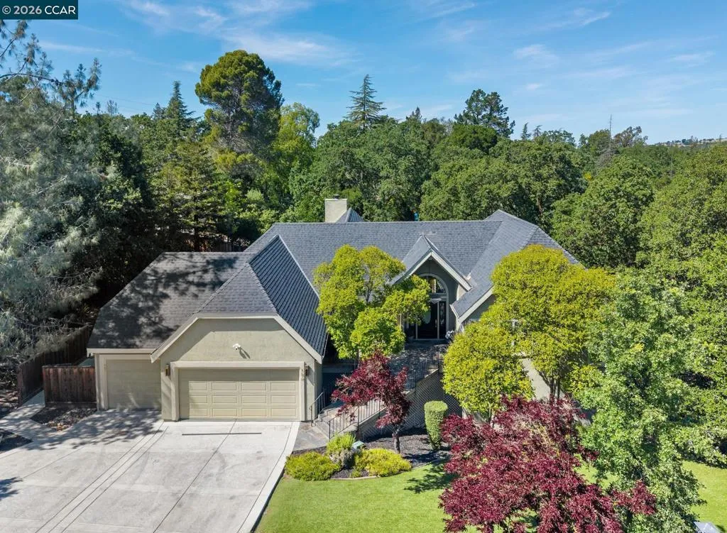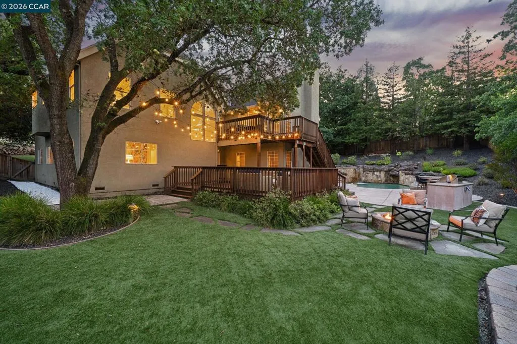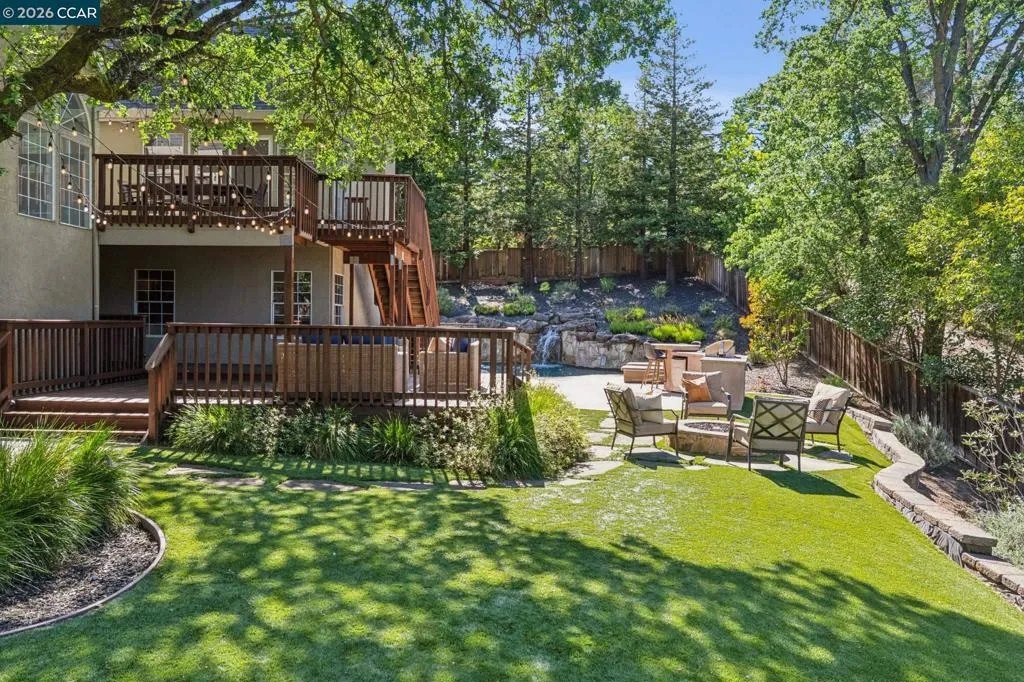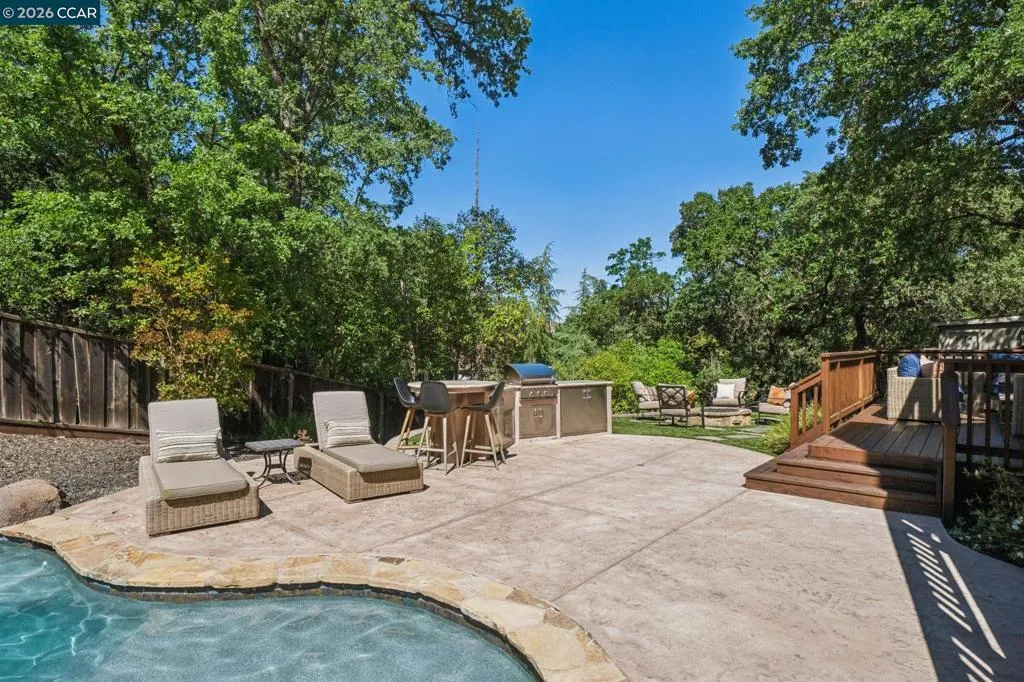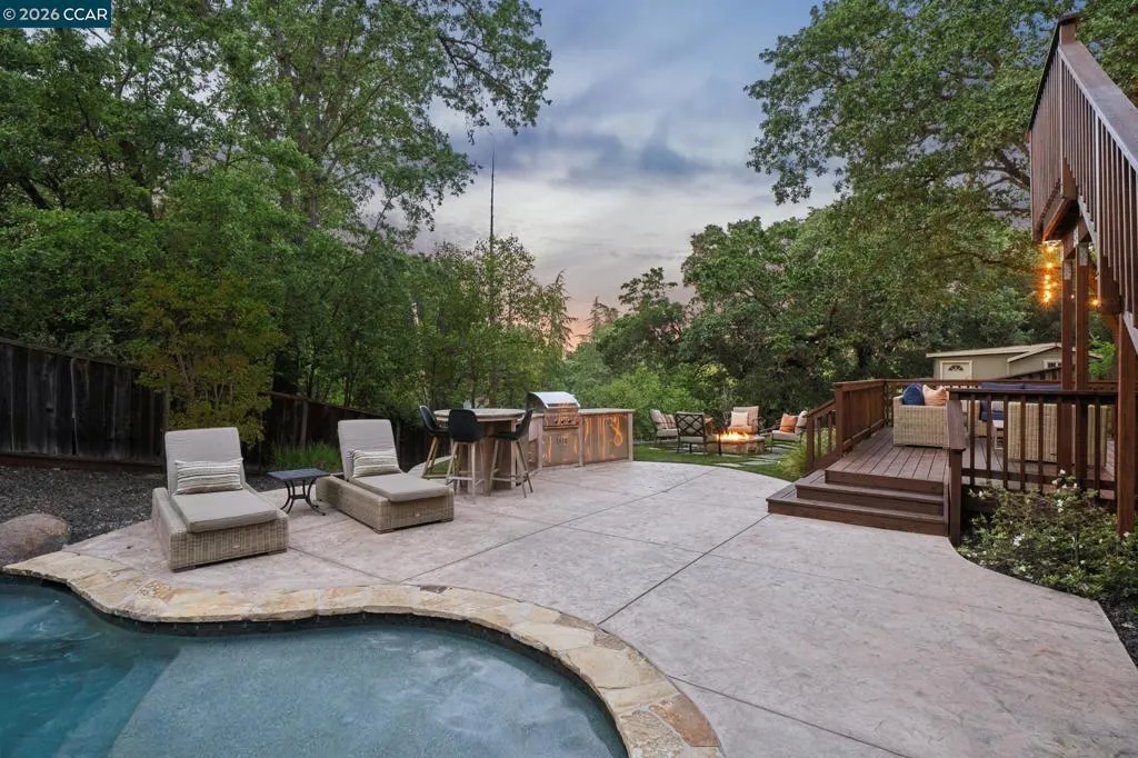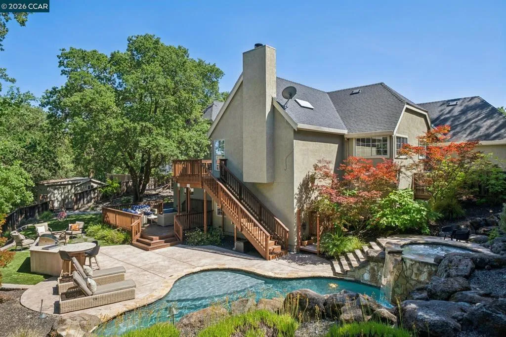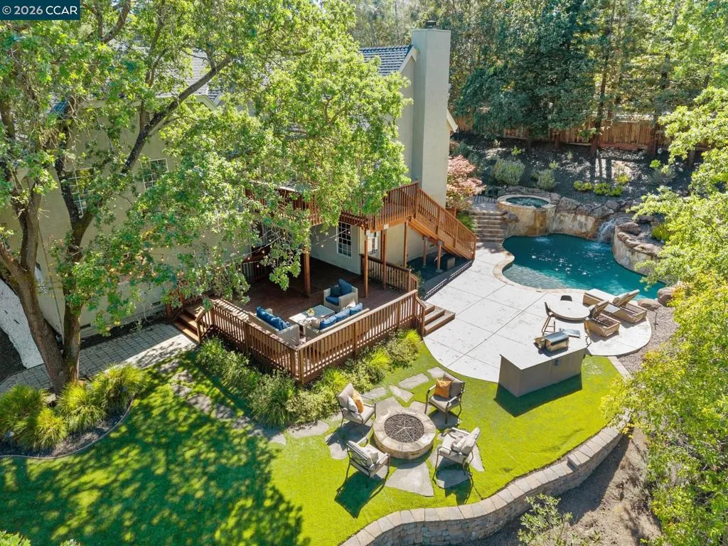Tucked along a private lane on an expansive half-acre lot in the premier pocket of Westside Alamo, this beautifully updated 3,430-square-foot residence offers an exceptional blend of privacy, space, and resort-style living. Location highlights include: private seclusion with your own backyard oasis, minutes to the shops/dining of downtown WC, and a commuter’s dream to HW24/BART. Additionally, the house is minutes to favorite East Bay trails and accessible to the Iron Horse Trail, perfect for exercise, or a stroll to amenities in downtown Alamo/WC. The Backyard Oasis: The true soul of this home is the backyard, a resort-style sanctuary framed by towering Redwoods and mature oaks for total privacy. • Pool and hot tub: Natural rock-accented PebbleTec heated pool with a sun shelf, waterfalls, and a huge hot tub—Wi-Fi controlled. • Outdoor kitchen: Fully equipped high-end kitchen with a natural gas BBQ, fridge, and bar seating. • Natural gas fire pit: Perfect for evening drinks or s'mores under the stars. • Double decks: String lights cast an enchanting glow over the yard. • Heated outdoor shower: For ultimate resort-style living. • Detached studio: Flexible space for an office, gym, or workshop. • Level backyard: Low-maintenance turf for play and recreation. The Residence: The open-concept plan is enhanced by vaulted ceilings and abundant light, with greenery visible from every window. The updated kitchen features a quartz island, stainless appliances, and a charming eat-in nook overlooking the stunning pool. It flows into the family room, where French doors open to an expansive deck—creating the perfect indoor-outdoor connection. The home also includes an elegant formal dining room and a large living room for entertaining. The main level primary suite provides a peaceful retreat, complete with a spacious walk-in closet and a beautifully updated bathroom featuring a jetted tub and a double-headed shower. Hardwood flooring extends through main living areas, while secondary bedrooms offer new carpeting. A generous bonus room with a media projector presents a versatile option for a fifth bedroom or theater. Both secondary bathrooms are beautifully updated. With a low-maintenance front yard, an expansive driveway, and a three-car garage—complete with built-in cabinetry and EV charging—this home is as efficient as it is beautiful. This is a unique opportunity to own a piece of Alamo where your daily transit is simplified and your home feels like a vacation.