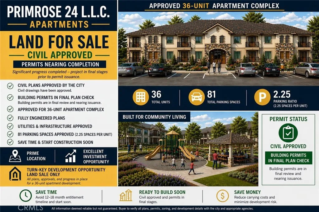 Prime development opportunity – 36-unit apartment project with civil plans approved and building permits in final plan check. Rare chance to acquire a nearly shovel-ready multifamily site with significant progress completed, allowing a developer to bypass much of the typical 12–18 month entitlement and approval process. Project includes approved plans for a 36-unit apartment complex with 81 parking spaces (approx. 2.25 spaces per unit), along with completed architectural, structural, and engineering work. Civil drawings have been approved, and building permits are in the final stages of review and nearing issuance, substantially reducing development timeline, risk, and carrying costs. Utilities and infrastructure approvals are in place, positioning the project for a streamlined path to construction. Ideal for developers seeking a high-upside opportunity with major pre-development milestones already achieved in a market where entitlement timelines and uncertainty can delay projects. This offering provides immediate value with the ability to close and move toward construction in the near term. Perfect for investors, builders, or developers looking to capitalize on a near-ready multifamily development. Buyer to verify all plans, permits, zoning, and development details with the city.