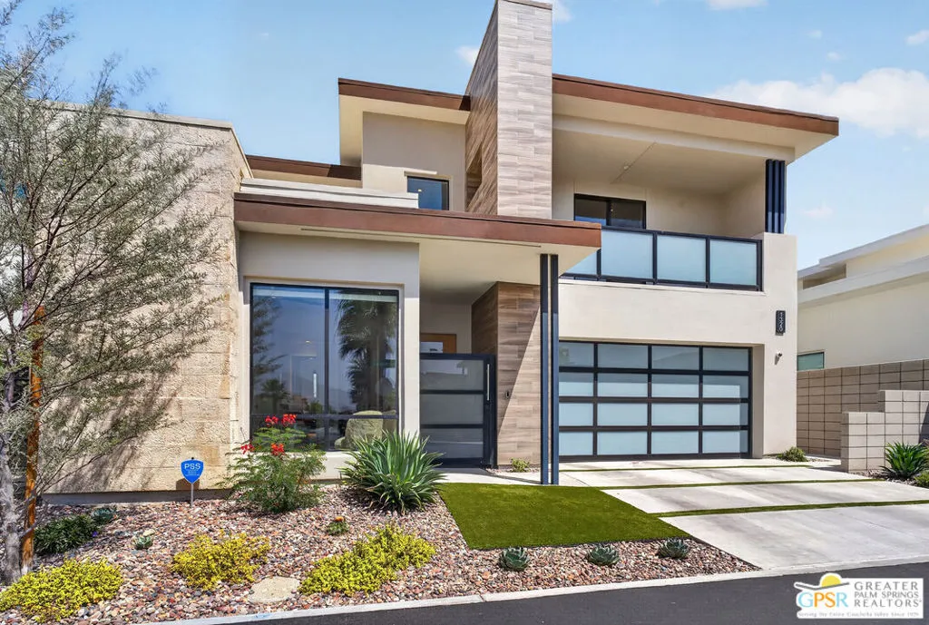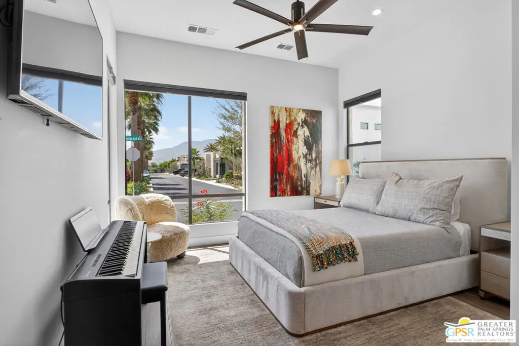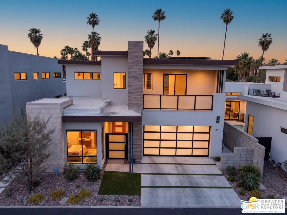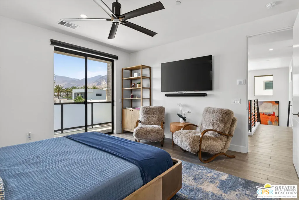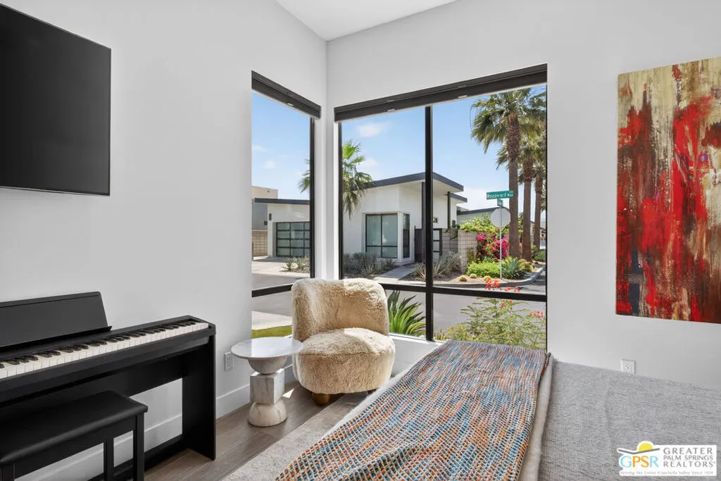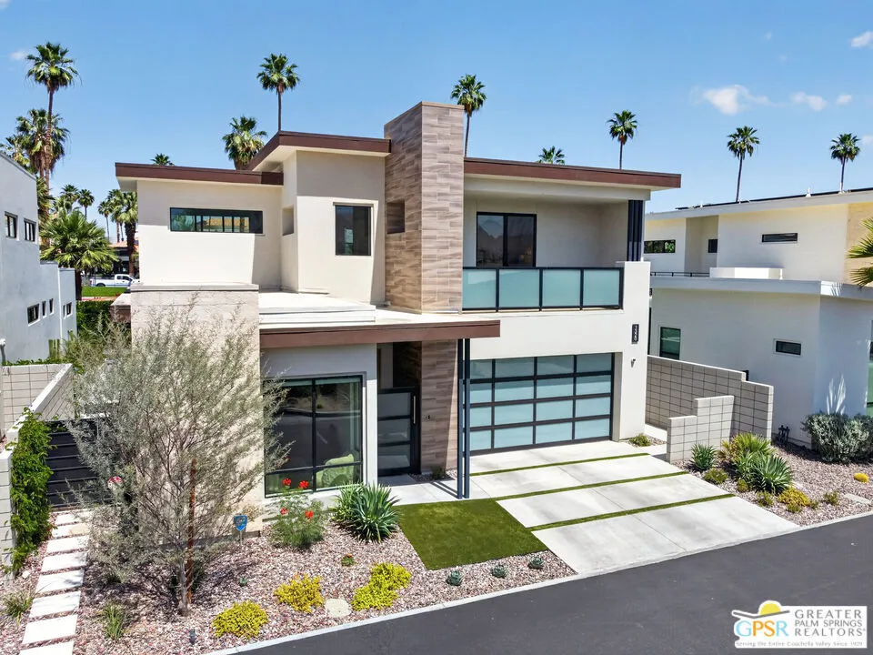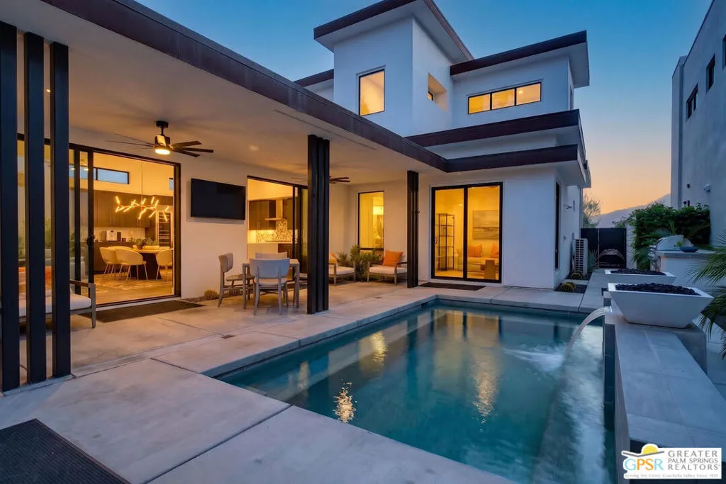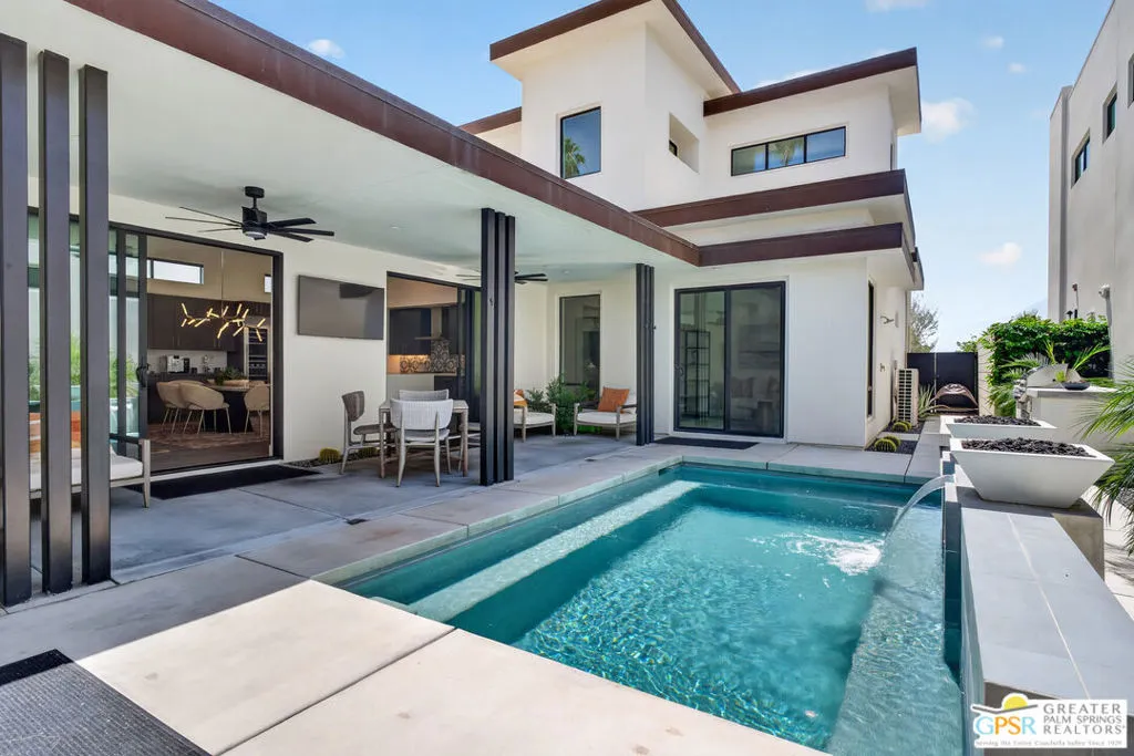 Welcome to 1320 Woodward at VUE, Where striking modern architecture pairs with laid-back desert living in one of Palm Springs' most visually compelling neighborhoods. This is more than a home; it's a statement of style, sophistication, and intentional design, where dramatic scale, clean lines, and walls of glass create a seamless connection between indoors and out. Offering the largest floor plan in VUE at an impressive 2,693 sq. ft., this 4-bedroom, 3.5-bath residence (with the 4th bedroom currently styled as a chic office/den) delivers both flexibility and privacy. A smart, modern layout places a guest retreat on the second level, ideal for visitors or multigenerational living. Every element has been thoughtfully elevated with designer finishes and premium upgrades, including a top-tier Thermador appliance suite with integrated wine refrigeration, EV charging, and an expanded OWNED solar system with 41 panels for optimal efficiency. Step outside to your own private resort. The reimagined pool is a showpiece, featuring a dramatic waterfall, fire bowls, outdoor shower, and built-in BBQ perfect for unforgettable evenings under the desert sky. Bold architecture, refined materials, and an unbeatable Palm Springs setting this is VUE living at its finest, crafted for those who demand exceptional design and elevated everyday living.