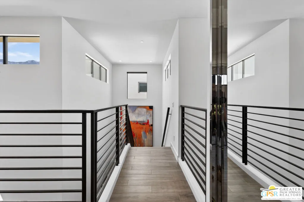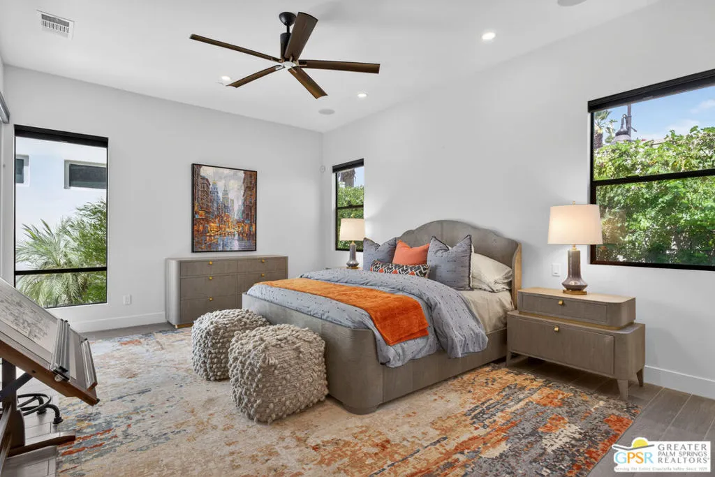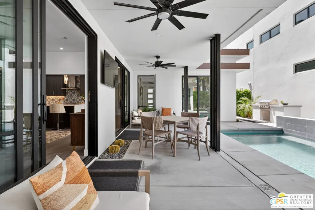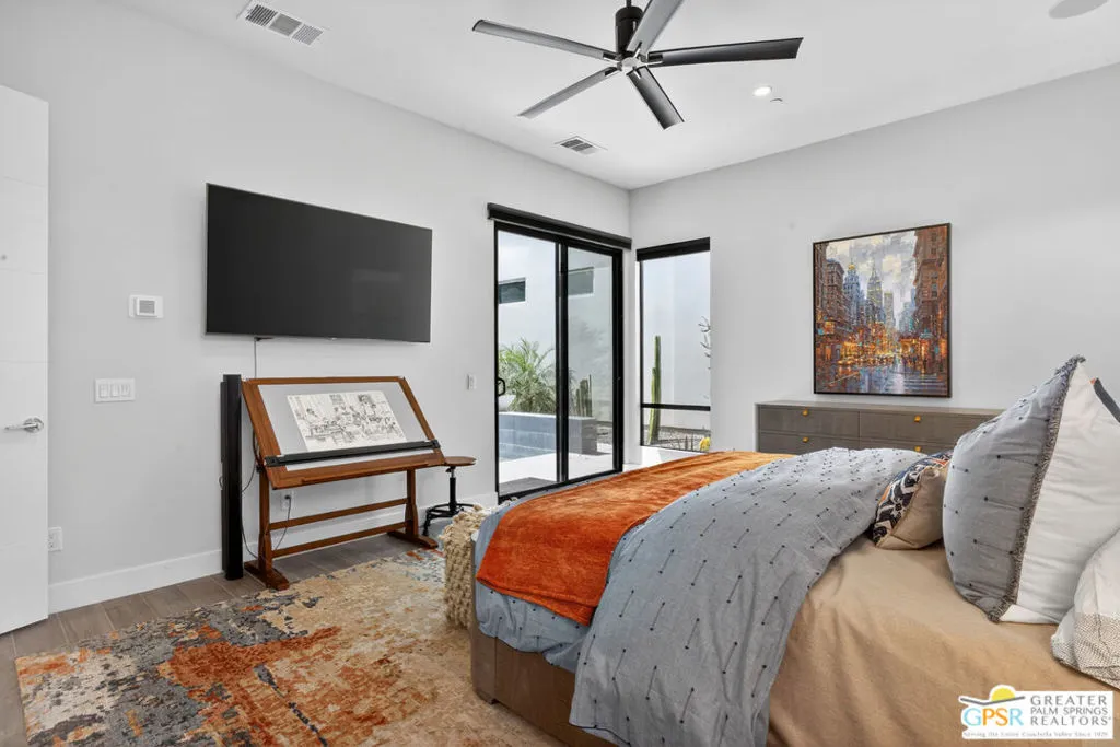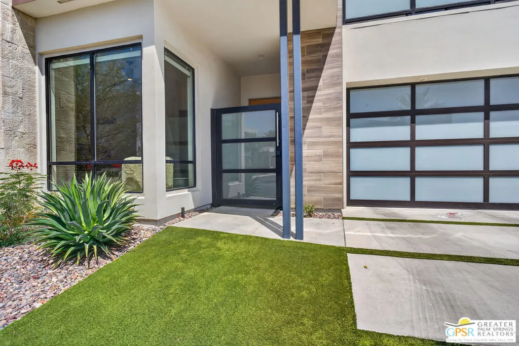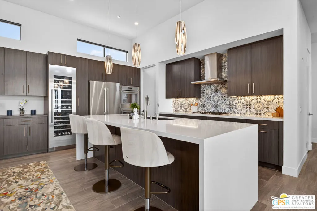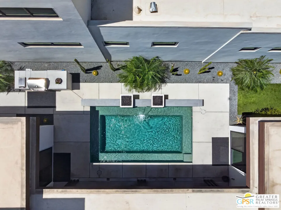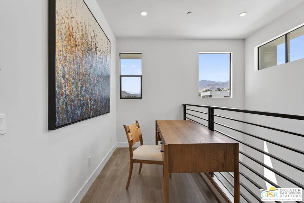 Welcome to 1320 Woodward at VUE, Where striking modern architecture pairs with laid-back desert living in one of Palm Springs' most visually compelling neighborhoods. This is more than a home; it's a statement of style, sophistication, and intentional design, where dramatic scale, clean lines, and walls of glass create a seamless connection between indoors and out. Offering the largest floor plan in VUE at an impressive 2,693 sq. ft., this 4-bedroom, 3.5-bath residence (with the 4th bedroom currently styled as a chic office/den) delivers both flexibility and privacy. A smart, modern layout places a guest retreat on the second level, ideal for visitors or multigenerational living. Every element has been thoughtfully elevated with designer finishes and premium upgrades, including a top-tier Thermador appliance suite with integrated wine refrigeration, EV charging, and an expanded OWNED solar system with 41 panels for optimal efficiency. Step outside to your own private resort. The reimagined pool is a showpiece, featuring a dramatic waterfall, fire bowls, outdoor shower, and built-in BBQ perfect for unforgettable evenings under the desert sky. Bold architecture, refined materials, and an unbeatable Palm Springs setting this is VUE living at its finest, crafted for those who demand exceptional design and elevated everyday living.