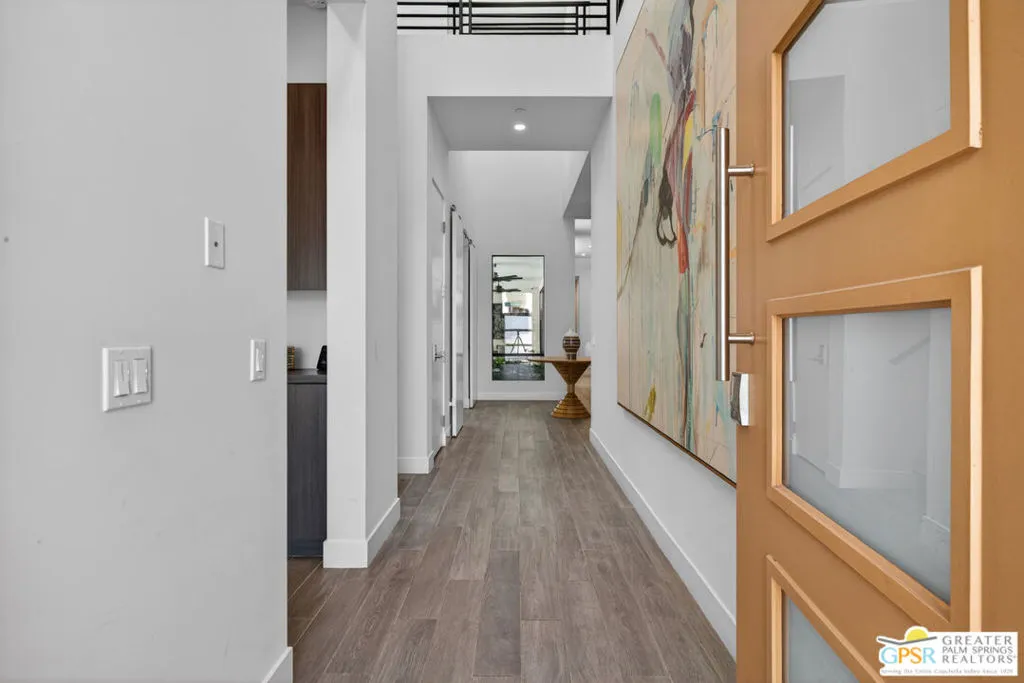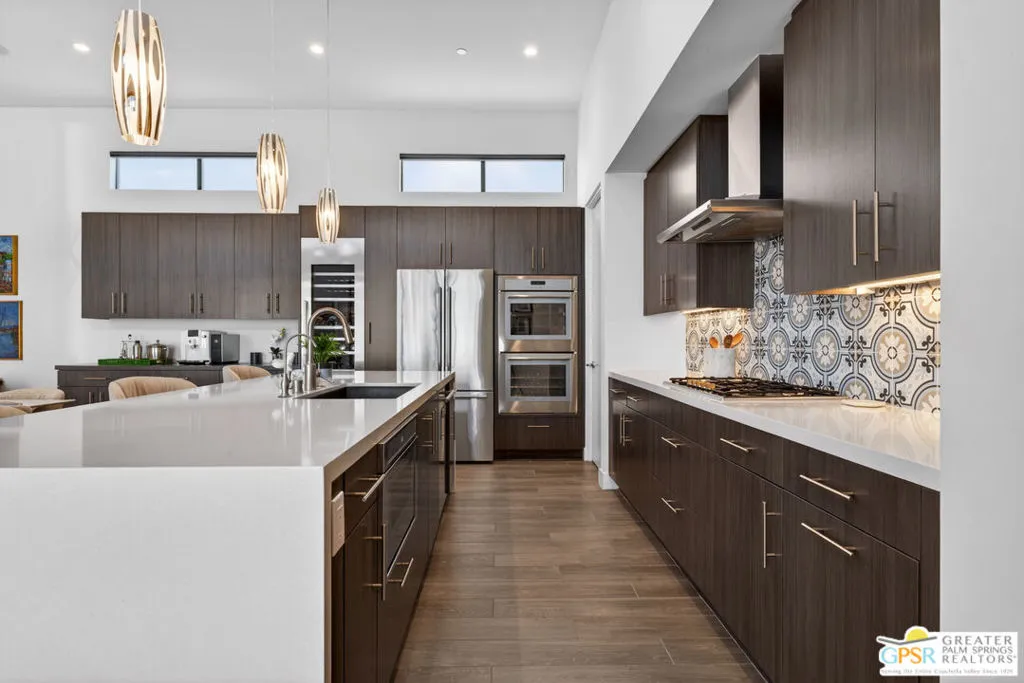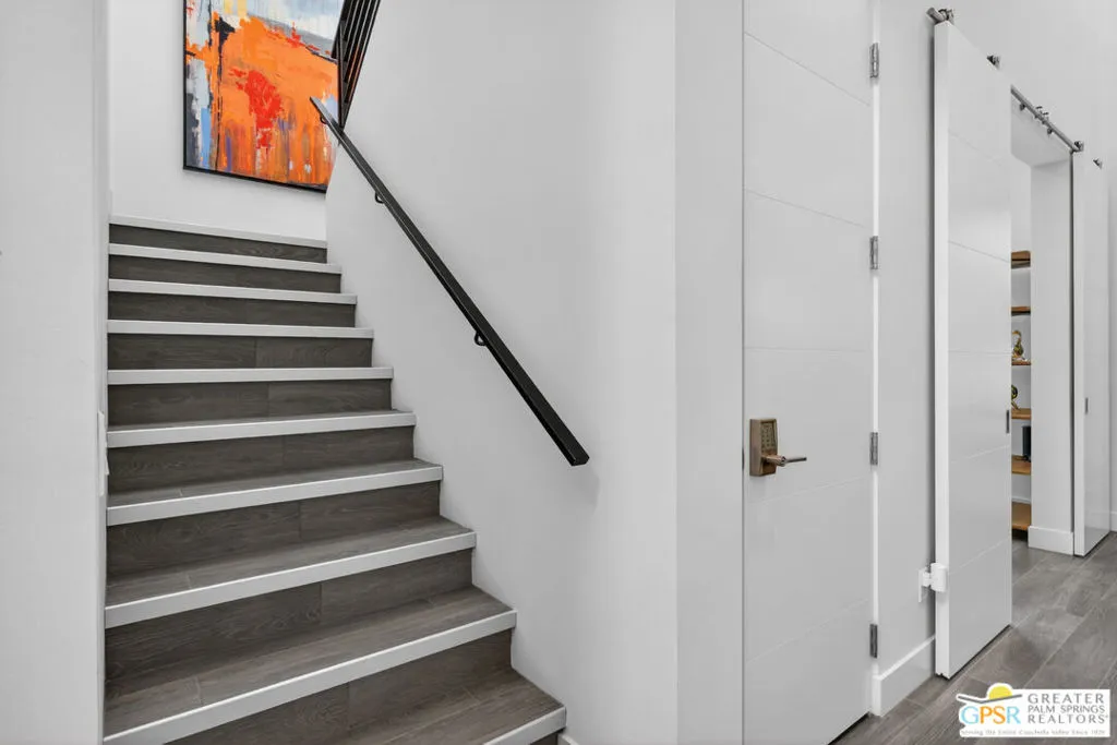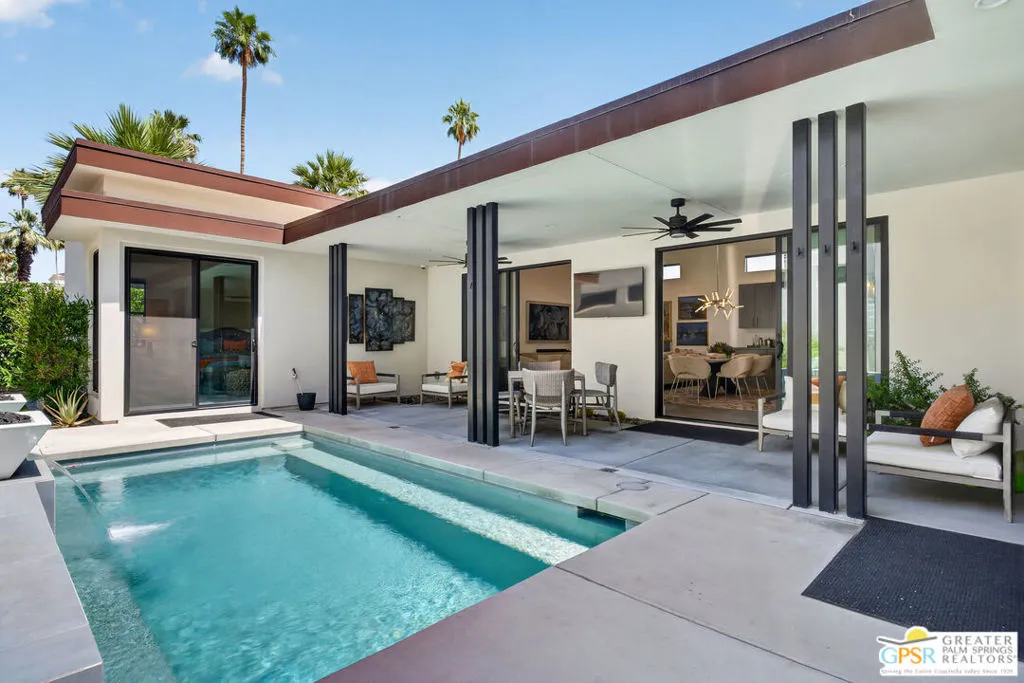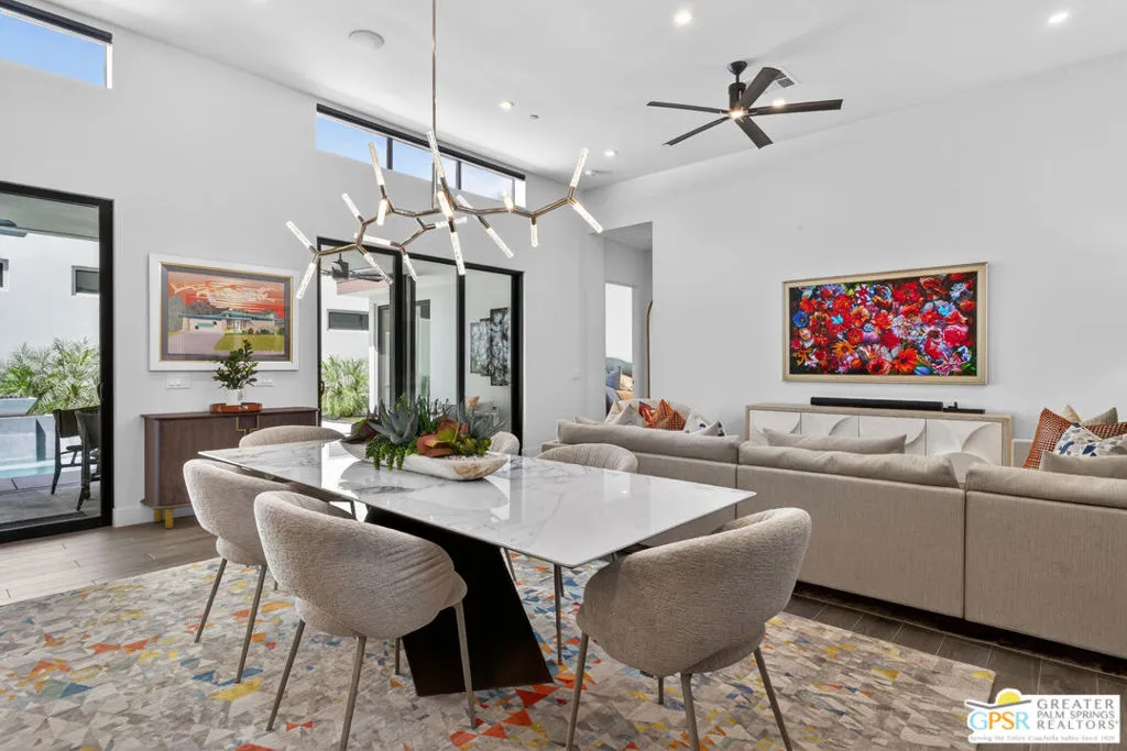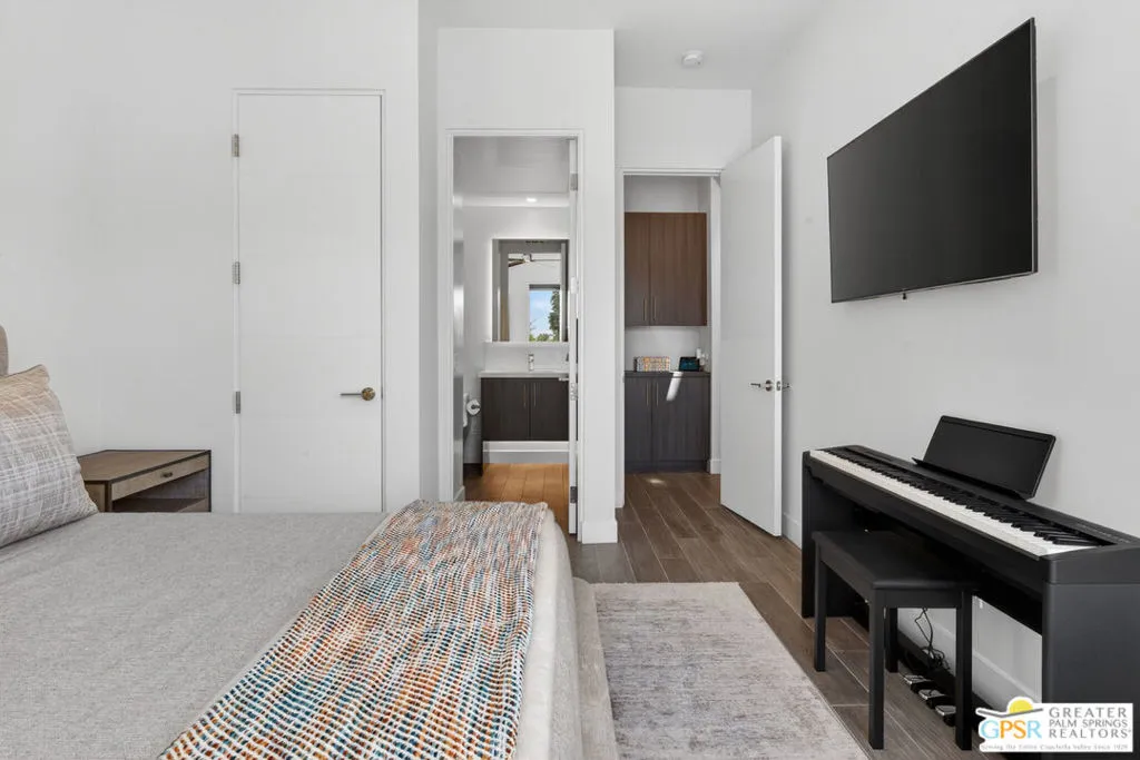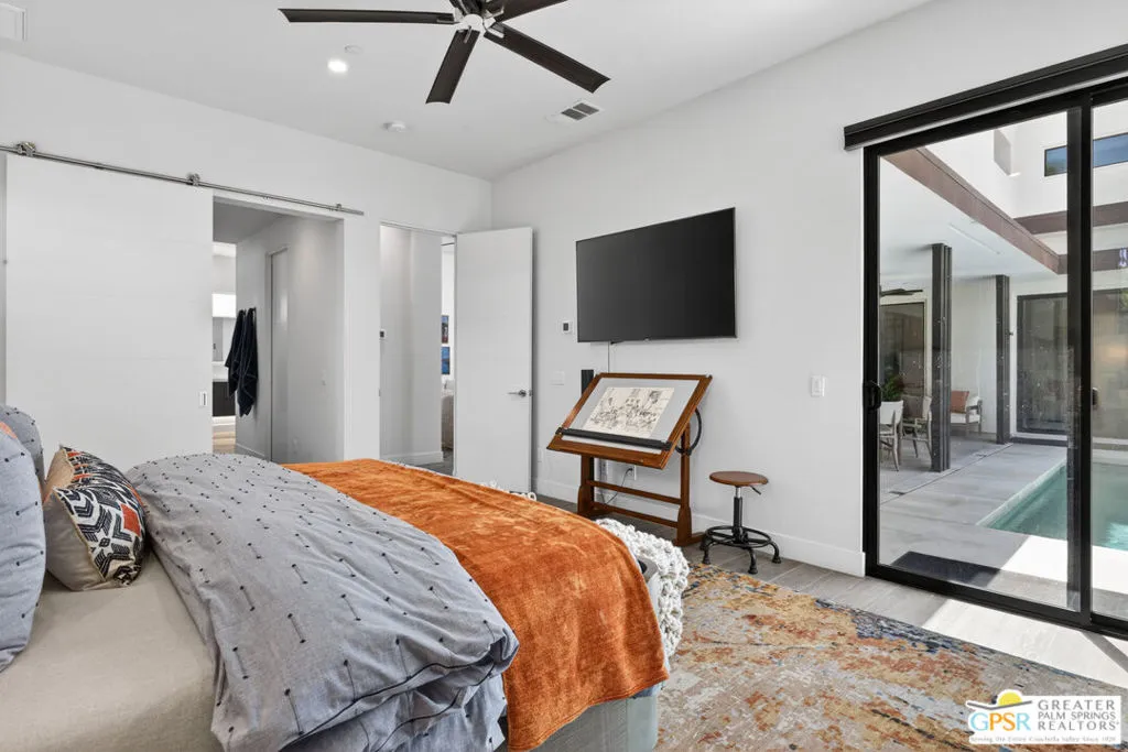 Welcome to 1320 Woodward at VUE, Where striking modern architecture pairs with laid-back desert living in one of Palm Springs' most visually compelling neighborhoods. This is more than a home; it's a statement of style, sophistication, and intentional design, where dramatic scale, clean lines, and walls of glass create a seamless connection between indoors and out. Offering the largest floor plan in VUE at an impressive 2,693 sq. ft., this 4-bedroom, 3.5-bath residence (with the 4th bedroom currently styled as a chic office/den) delivers both flexibility and privacy. A smart, modern layout places a guest retreat on the second level, ideal for visitors or multigenerational living. Every element has been thoughtfully elevated with designer finishes and premium upgrades, including a top-tier Thermador appliance suite with integrated wine refrigeration, EV charging, and an expanded OWNED solar system with 41 panels for optimal efficiency. Step outside to your own private resort. The reimagined pool is a showpiece, featuring a dramatic waterfall, fire bowls, outdoor shower, and built-in BBQ perfect for unforgettable evenings under the desert sky. Bold architecture, refined materials, and an unbeatable Palm Springs setting this is VUE living at its finest, crafted for those who demand exceptional design and elevated everyday living.
