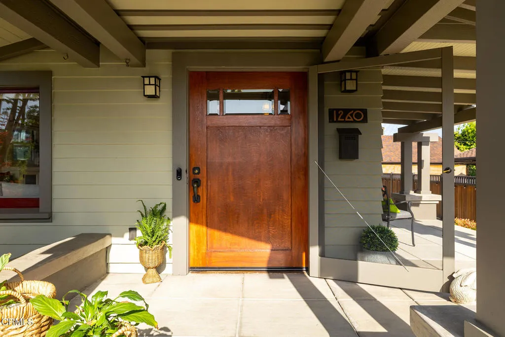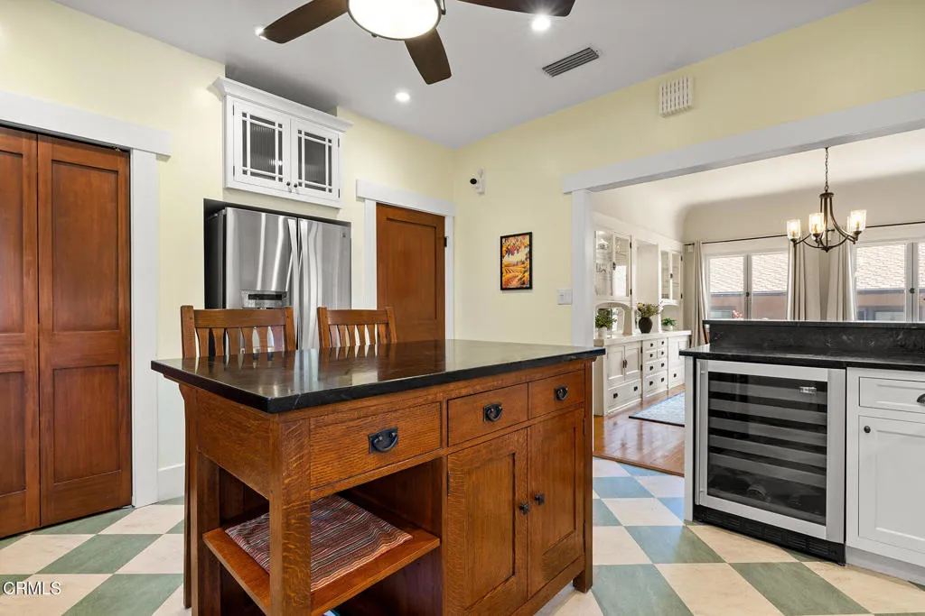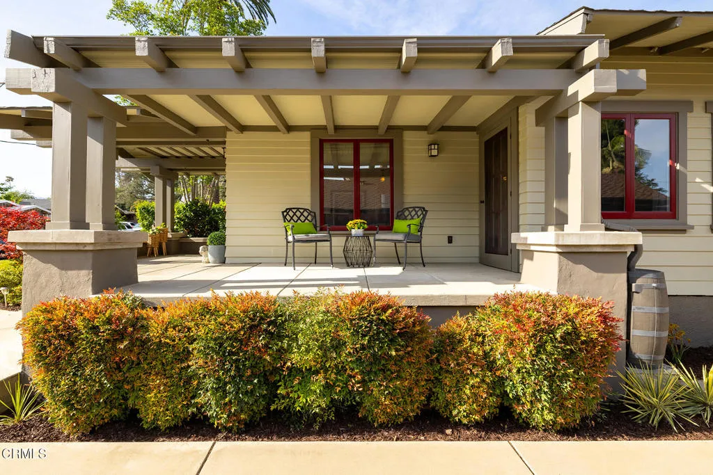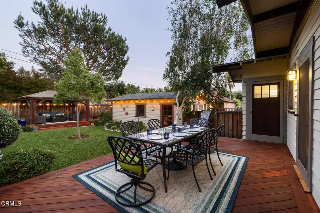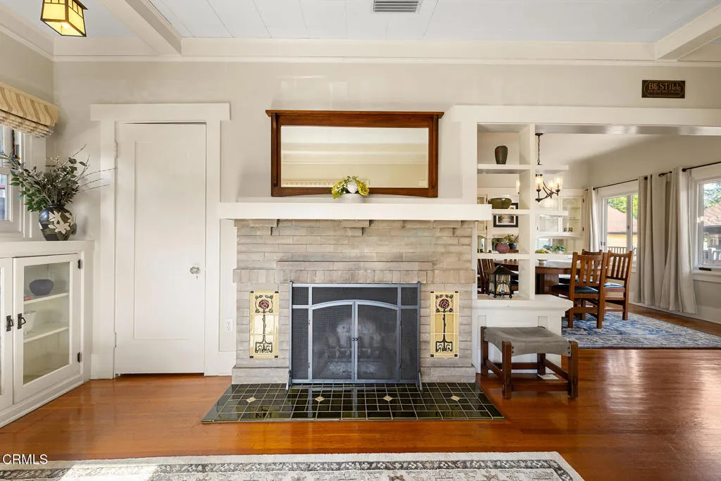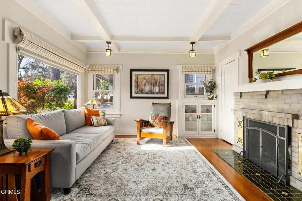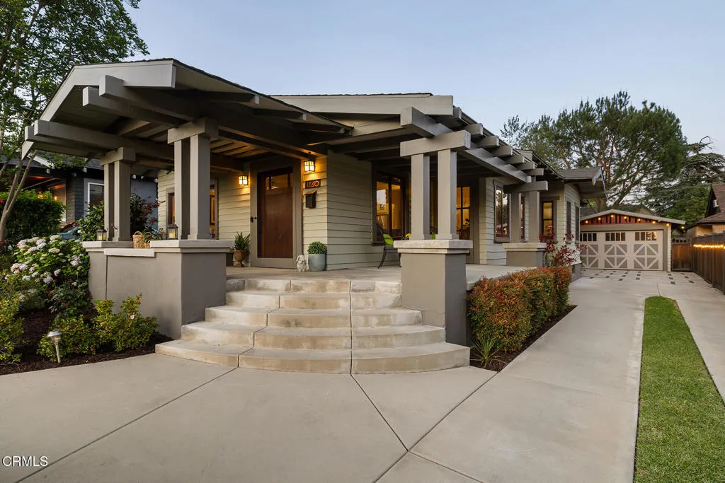 Impressive Craftsman Bungalow in Pasadena's coveted Bungalow Heaven Landmark District, known for its timeless architecture, historic charm, and tree-lined streets. This pristine, updated home welcomes you with a wraparound front porch, architectural double columns, classic beams, and professionally landscaped grounds. Step through the stately, oversized front door into a bright, sunlit living room with box-beamed ceilings, centered around a distinctive fireplace with botanical tiles flanking the firebox. The formal dining room, detailed with coved ceilings and a built-in hutch, opens to the fully renovated kitchen. Here you'll find soapstone counters with a breakfast bar, dedicated pantry, laundry closet with storage, an island with additional seating, vintage Wedgewood stove, wine fridge, and a farmhouse apron-front sink. A central hallway leads to two bedroom suites and a powder bath. The primary suite spoils you with a spacious bath featuring a double-sink vanity with marble counters, oversized walk-in shower, separate tub, and access to the backyard. The second bedroom suite includes a beautifully updated bath and direct access to the rear deck. The manicured backyard oasis includes two entertaining decks, a standalone spa, tranquil fountain, and grassy spaces. A long driveway leads to a detached garage with an integrated workspace providing ample room for parking and storage. Additional highlights include oak wood floors, central air/heat, updated electrical and plumbing systems, and a fully fenced rear yard. This exquisite Craftsman presents a rare opportunity to own a piece of history in a neighborhood with a strong sense of community, preservation, and architectural heritage. Welcome home!