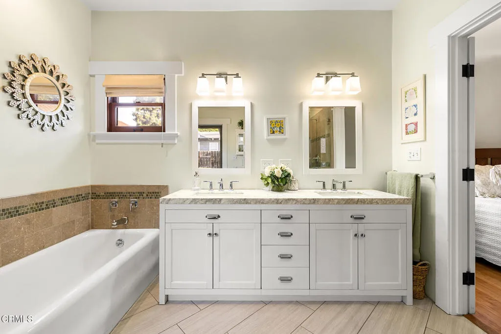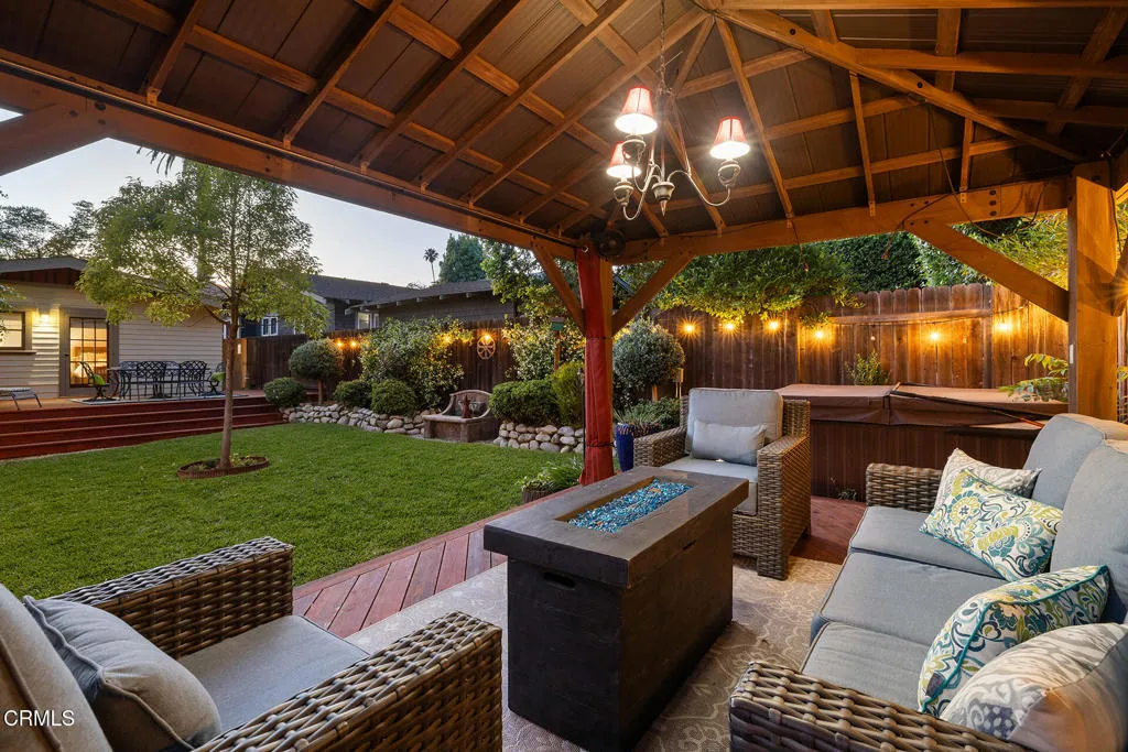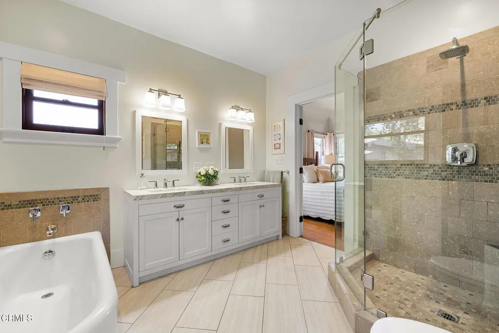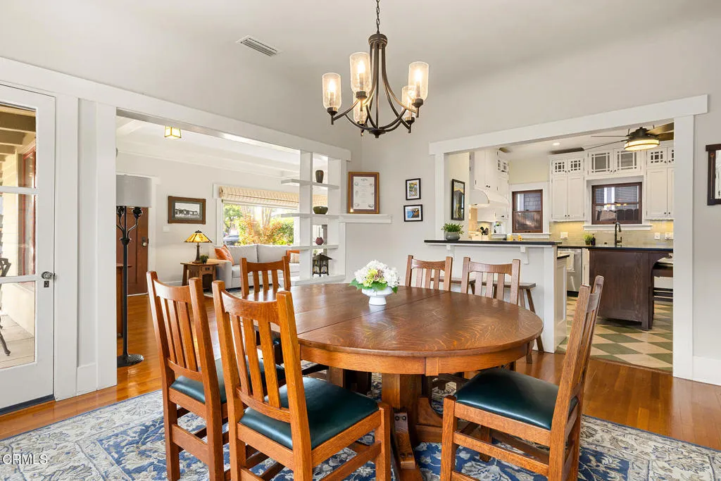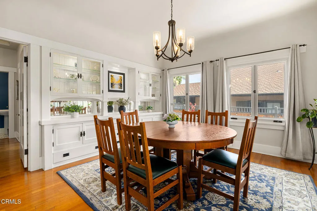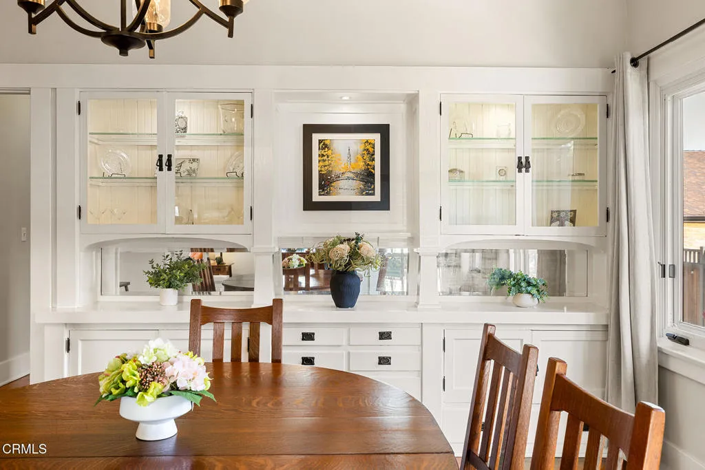 Impressive Craftsman Bungalow in Pasadena's coveted Bungalow Heaven Landmark District, known for its timeless architecture, historic charm, and tree-lined streets. This pristine, updated home welcomes you with a wraparound front porch, architectural double columns, classic beams, and professionally landscaped grounds. Step through the stately, oversized front door into a bright, sunlit living room with box-beamed ceilings, centered around a distinctive fireplace with botanical tiles flanking the firebox. The formal dining room, detailed with coved ceilings and a built-in hutch, opens to the fully renovated kitchen. Here you'll find soapstone counters with a breakfast bar, dedicated pantry, laundry closet with storage, an island with additional seating, vintage Wedgewood stove, wine fridge, and a farmhouse apron-front sink. A central hallway leads to two bedroom suites and a powder bath. The primary suite spoils you with a spacious bath featuring a double-sink vanity with marble counters, oversized walk-in shower, separate tub, and access to the backyard. The second bedroom suite includes a beautifully updated bath and direct access to the rear deck. The manicured backyard oasis includes two entertaining decks, a standalone spa, tranquil fountain, and grassy spaces. A long driveway leads to a detached garage with an integrated workspace providing ample room for parking and storage. Additional highlights include oak wood floors, central air/heat, updated electrical and plumbing systems, and a fully fenced rear yard. This exquisite Craftsman presents a rare opportunity to own a piece of history in a neighborhood with a strong sense of community, preservation, and architectural heritage. Welcome home!