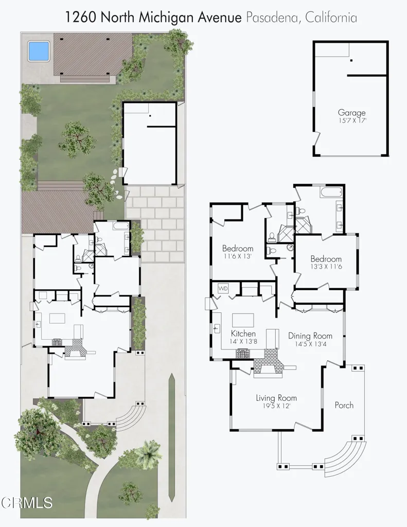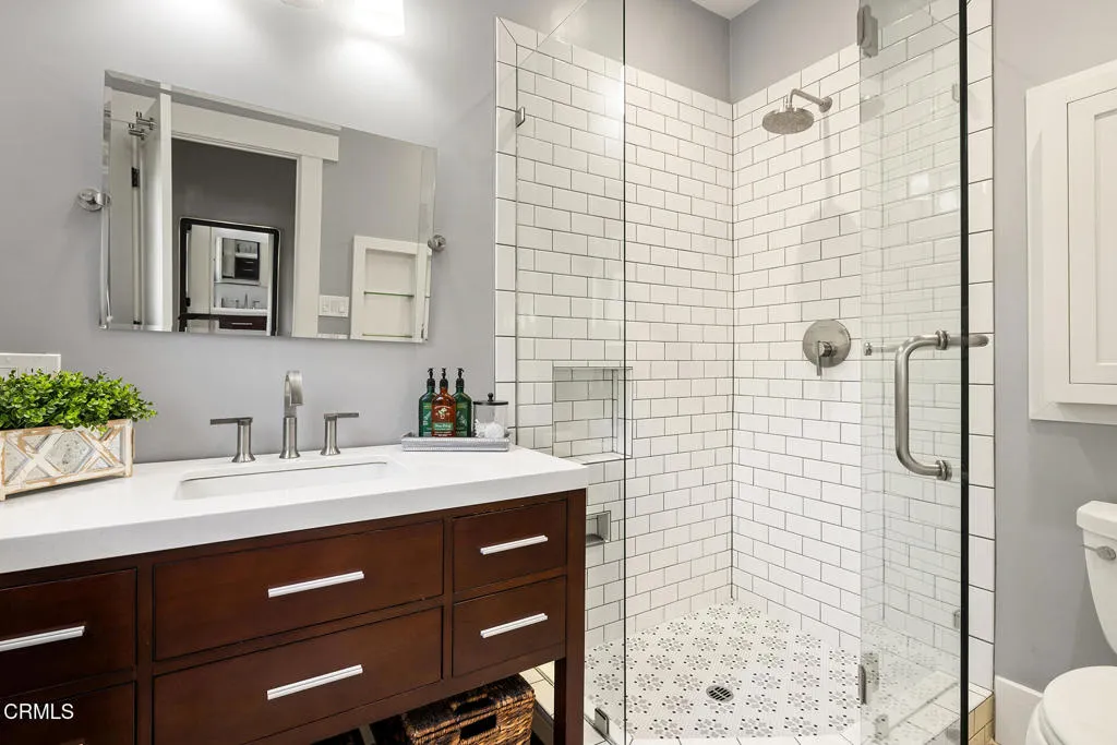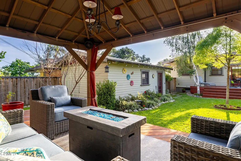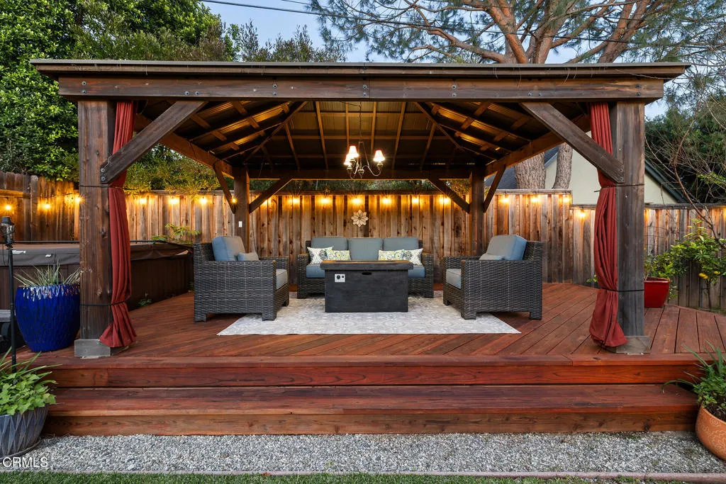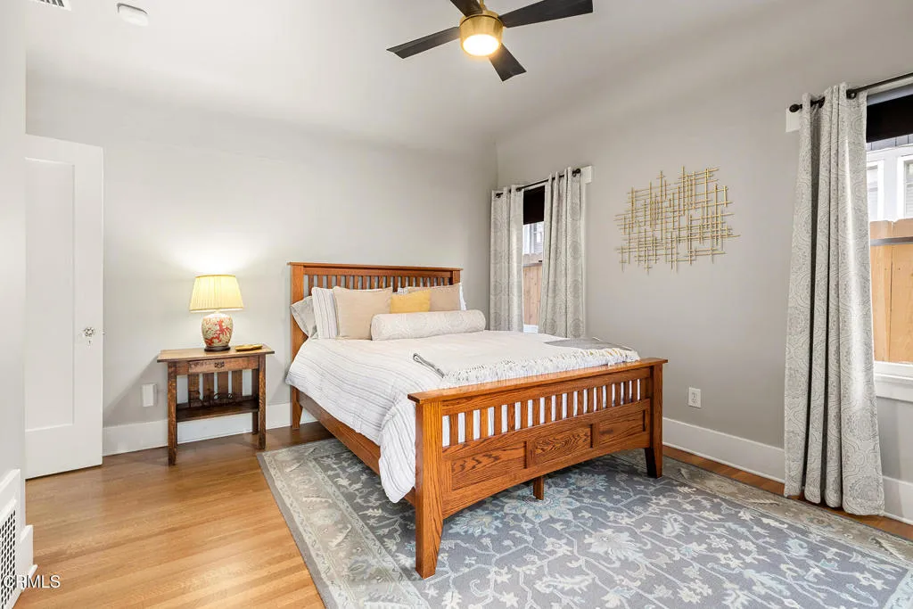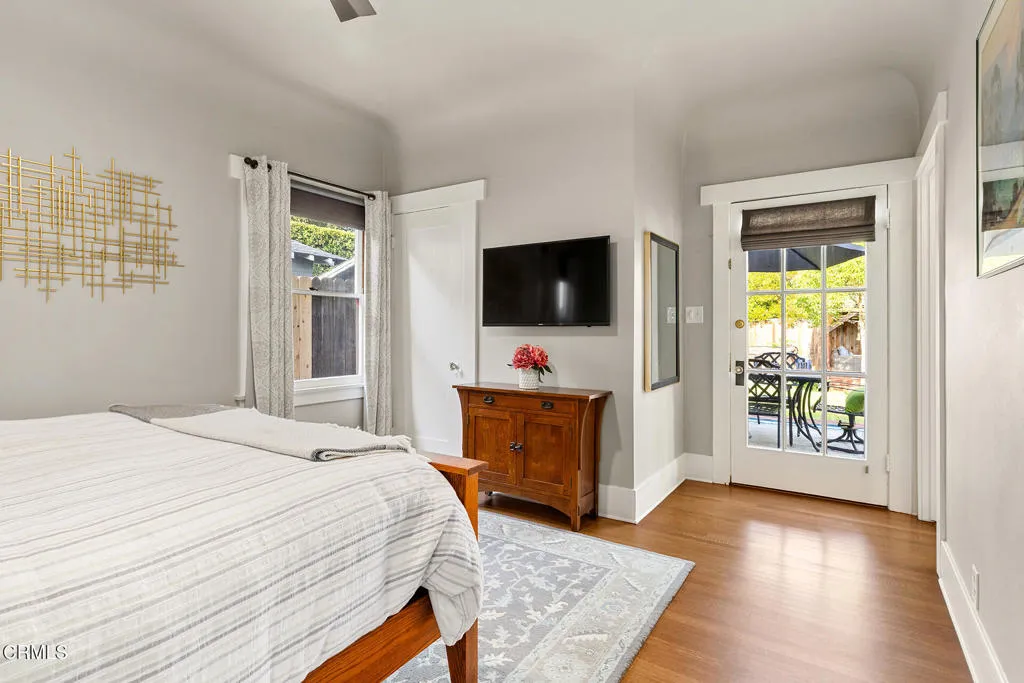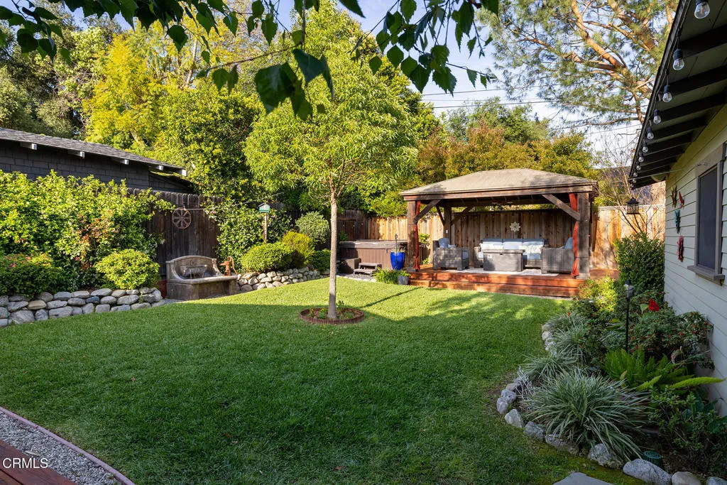 Impressive Craftsman Bungalow in Pasadena's coveted Bungalow Heaven Landmark District, known for its timeless architecture, historic charm, and tree-lined streets. This pristine, updated home welcomes you with a wraparound front porch, architectural double columns, classic beams, and professionally landscaped grounds. Step through the stately, oversized front door into a bright, sunlit living room with box-beamed ceilings, centered around a distinctive fireplace with botanical tiles flanking the firebox. The formal dining room, detailed with coved ceilings and a built-in hutch, opens to the fully renovated kitchen. Here you'll find soapstone counters with a breakfast bar, dedicated pantry, laundry closet with storage, an island with additional seating, vintage Wedgewood stove, wine fridge, and a farmhouse apron-front sink. A central hallway leads to two bedroom suites and a powder bath. The primary suite spoils you with a spacious bath featuring a double-sink vanity with marble counters, oversized walk-in shower, separate tub, and access to the backyard. The second bedroom suite includes a beautifully updated bath and direct access to the rear deck. The manicured backyard oasis includes two entertaining decks, a standalone spa, tranquil fountain, and grassy spaces. A long driveway leads to a detached garage with an integrated workspace providing ample room for parking and storage. Additional highlights include oak wood floors, central air/heat, updated electrical and plumbing systems, and a fully fenced rear yard. This exquisite Craftsman presents a rare opportunity to own a piece of history in a neighborhood with a strong sense of community, preservation, and architectural heritage. Welcome home!