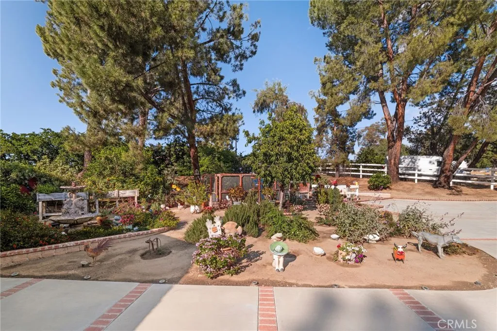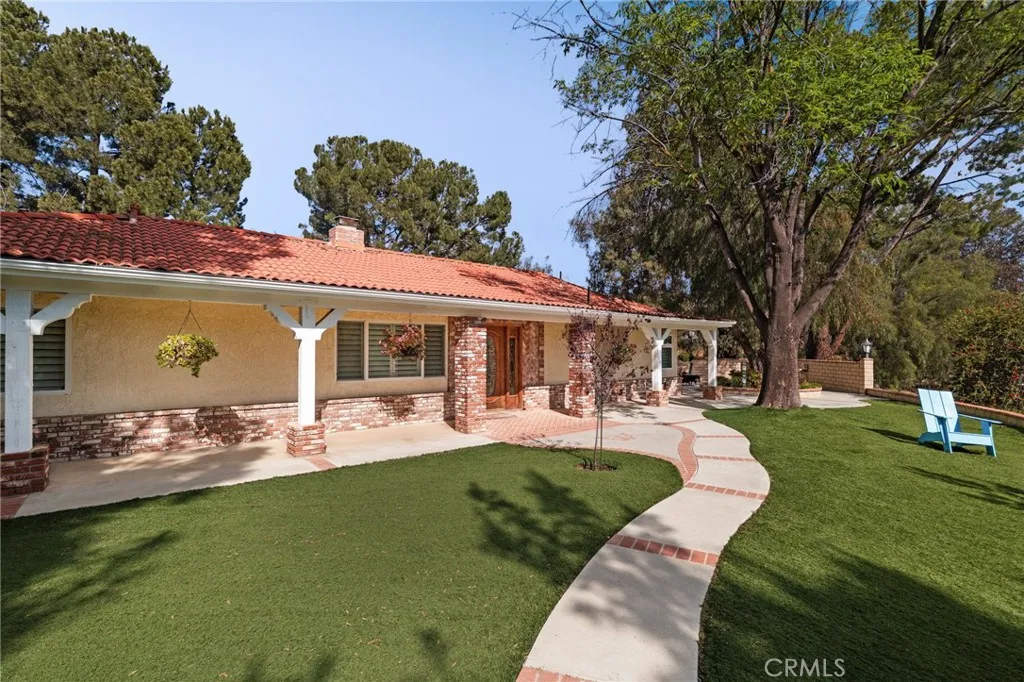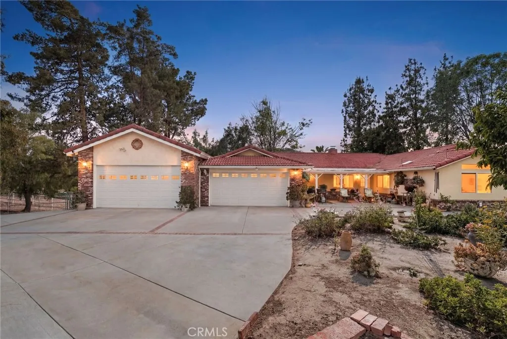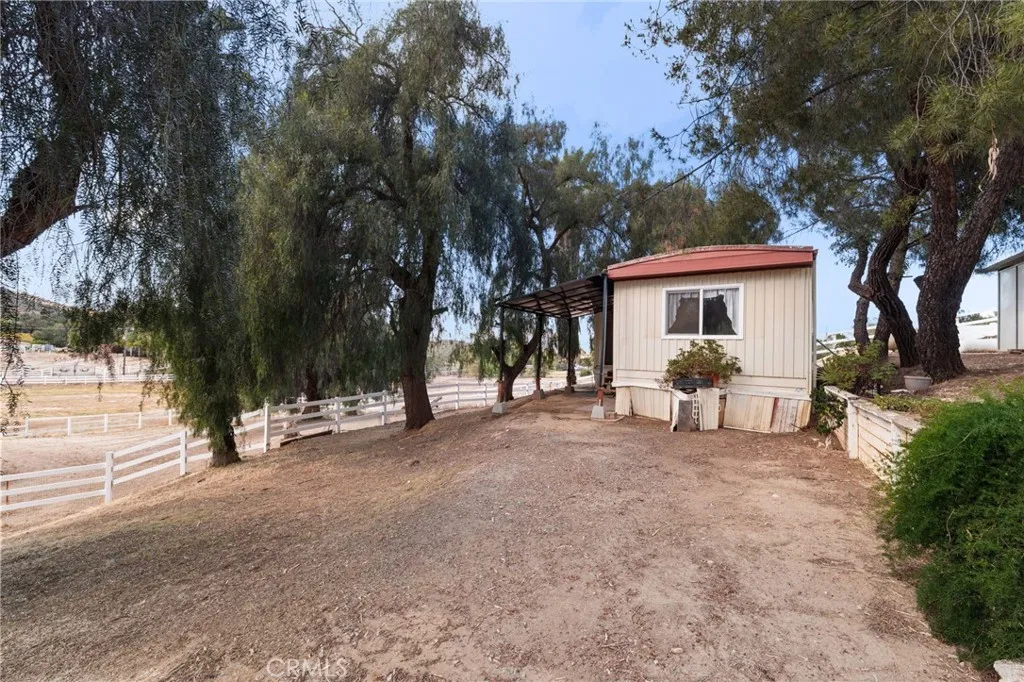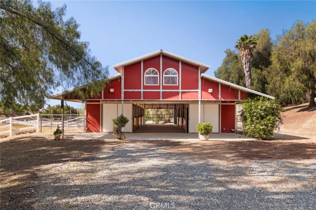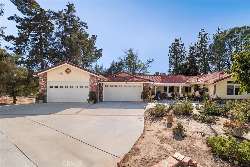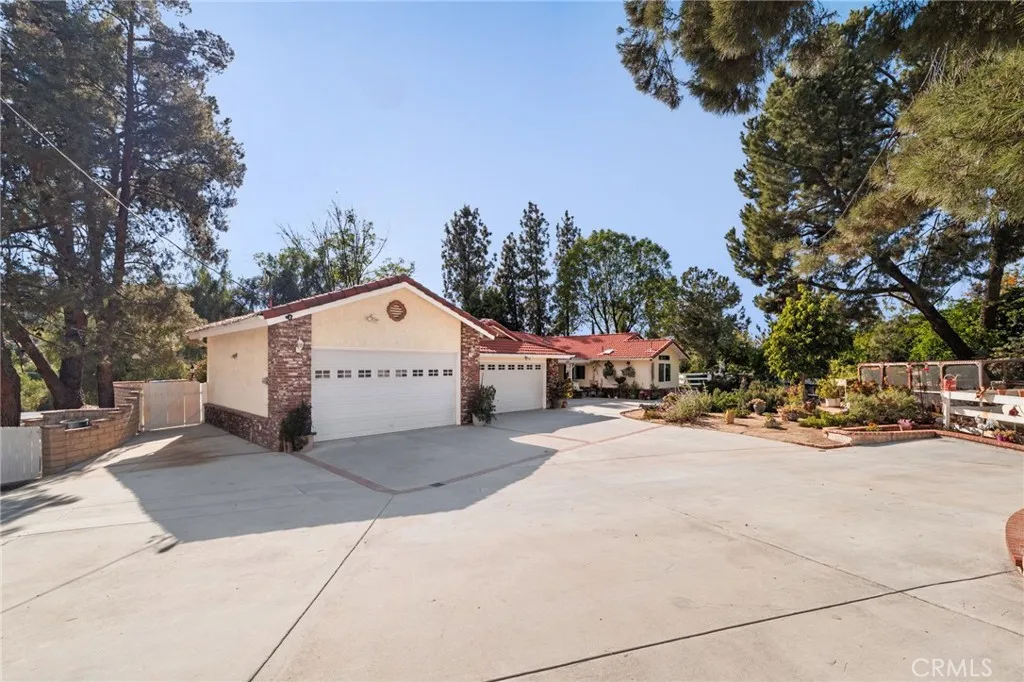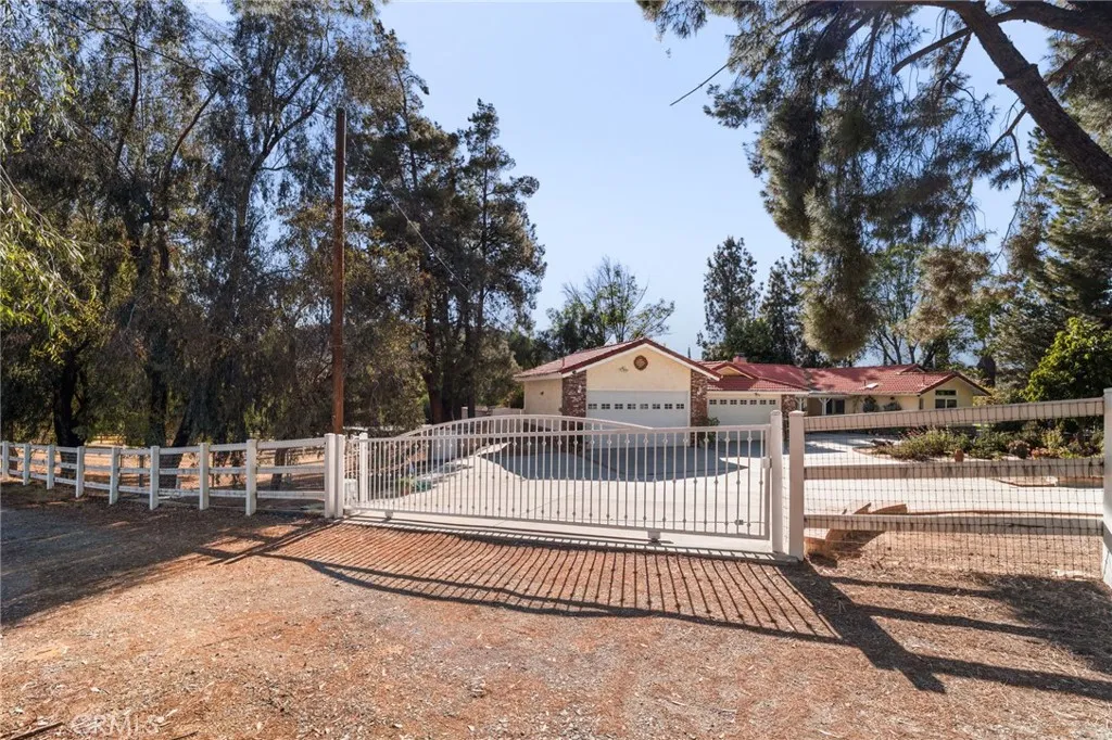 Welcome to 16620 Rocky Glen Road, a private, gated 5-acre ranch-style property offering exceptional versatility, functionality, and peaceful surroundings. This beautifully maintained estate features a 4-bedroom, 2-bath home with upgraded hickory wood plank flooring, crown molding, plantation shutters, and a double-sided brick fireplace with custom mantels. The remodeled kitchen showcases custom hickory cabinetry with roll-out shelving, granite countertops, porcelain farmhouse sink, and high-end appliances including a Thermador 6-burner range, built-in refrigerator, warming drawer, and trash compactor. A large center island with additional sink and seating makes it ideal for entertaining. The spacious primary suite includes French doors to the patio, dual walk-in closets, and a remodeled bathroom with marble finishes, jetted soaking tub, and oversized walk-in shower. Designed for outdoor living, the property features two patios, an outdoor fireplace, and a BBQ island complete with refrigerator, sink, and side burner. The grounds are enhanced by over 100 mature trees, fruit and citrus trees, flowering plants, and irrigation throughout. Ideal for equestrian or multi-use living, the property includes a 7-stall barn with wash stall, tack room, fly misting system, and attached pastures, as well as a separate 5-stall mare motel with additional pastures and tack space. The fully fenced acreage offers white vinyl fencing and multiple pasture areas. Additional improvements include a 30x40 RV barn with roll-up door and 30-amp hookup, a 1-bedroom ADU/mobile home with separate utilities, two garages (including oversized) with epoxy flooring, and dual remote-controlled gated entrances. A rare opportunity to own a private, fully improved ranch property with space for animals, vehicles, and recreational use.
