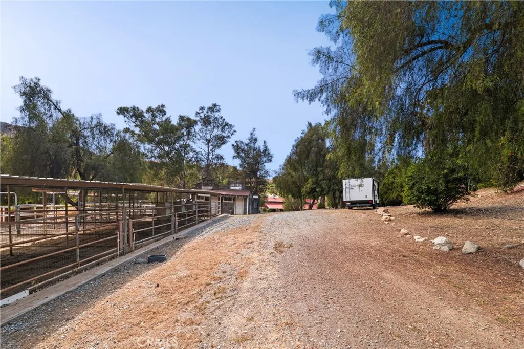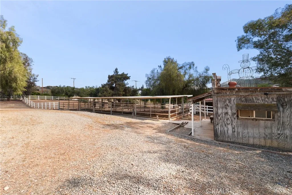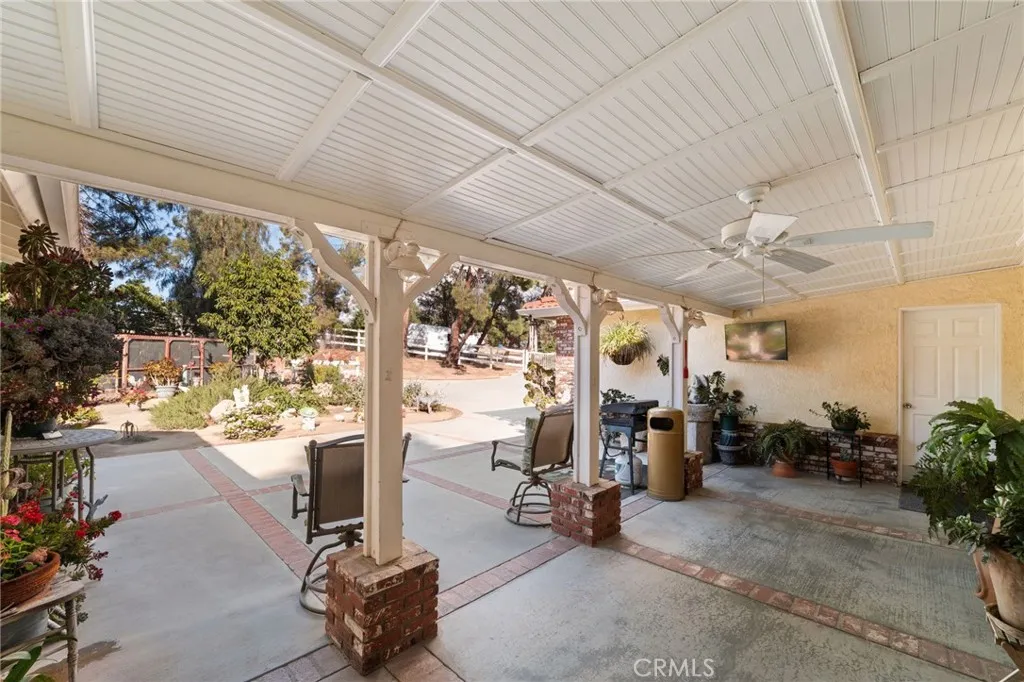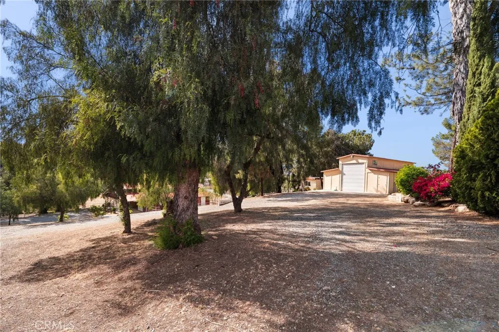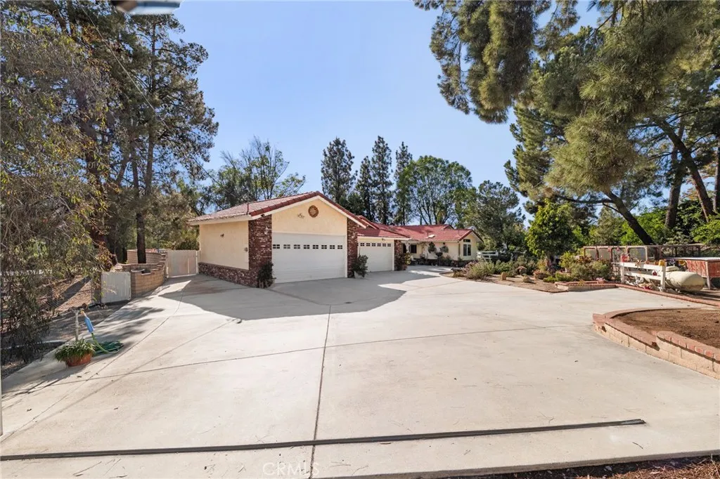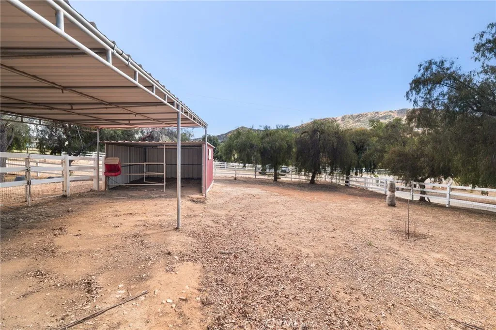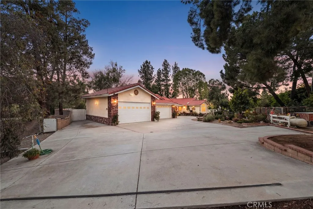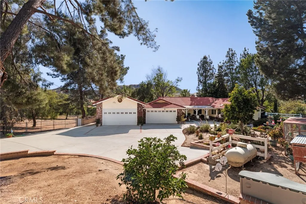 Welcome to 16620 Rocky Glen Road, a private, gated 5-acre ranch-style property offering exceptional versatility, functionality, and peaceful surroundings. This beautifully maintained estate features a 4-bedroom, 2-bath home with upgraded hickory wood plank flooring, crown molding, plantation shutters, and a double-sided brick fireplace with custom mantels. The remodeled kitchen showcases custom hickory cabinetry with roll-out shelving, granite countertops, porcelain farmhouse sink, and high-end appliances including a Thermador 6-burner range, built-in refrigerator, warming drawer, and trash compactor. A large center island with additional sink and seating makes it ideal for entertaining. The spacious primary suite includes French doors to the patio, dual walk-in closets, and a remodeled bathroom with marble finishes, jetted soaking tub, and oversized walk-in shower. Designed for outdoor living, the property features two patios, an outdoor fireplace, and a BBQ island complete with refrigerator, sink, and side burner. The grounds are enhanced by over 100 mature trees, fruit and citrus trees, flowering plants, and irrigation throughout. Ideal for equestrian or multi-use living, the property includes a 7-stall barn with wash stall, tack room, fly misting system, and attached pastures, as well as a separate 5-stall mare motel with additional pastures and tack space. The fully fenced acreage offers white vinyl fencing and multiple pasture areas. Additional improvements include a 30x40 RV barn with roll-up door and 30-amp hookup, a 1-bedroom ADU/mobile home with separate utilities, two garages (including oversized) with epoxy flooring, and dual remote-controlled gated entrances. A rare opportunity to own a private, fully improved ranch property with space for animals, vehicles, and recreational use.
