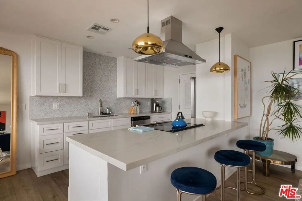 Penthouse Twelve. There is only one 12. Rarely offered and highly coveted, this top-floor residence crowns one of the most recognized full-service buildings on the Doheny corridor. Reimagined with a refined, contemporary sensibility, Penthouse Twelve delivers a level of finish, light, and privacy seldom available in this location.Western exposures frame sweeping, unobstructed vistaslayered mountain silhouettes, watercolor sunsets, and the evolving glow of Los Angeles at nightvisible from every room. The open-concept living and dining spaces are expansive yet intentional, designed for both large-scale entertaining and quiet daily living. Clean architectural lines, curated materials, and a restrained palette create a timeless interior that prioritizes volume, proportion, and natural light.The two-bedroom layout is thoughtfully separated, each with dedicated baths, complemented by a guest powder room. One bedroom has a full walk in closet, and there are ample additional closets throughout for storage.Residents enjoy the full-service lifestyle that defines 100 S. Doheny: 24-hour security and concierge, a resort-style pool, tennis court, fitness center, and private resident spacesall moments from Beverly Hills, the Sunset Strip, and the city's most established retail and dining destinations.Two side-by-side parking spaces and additional storage complete the offering.