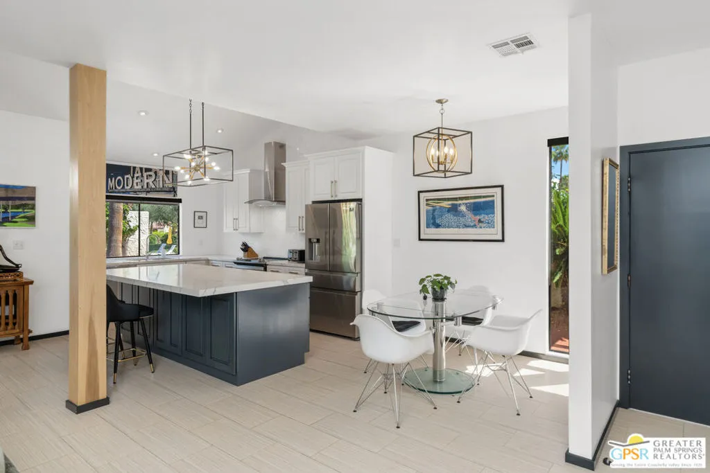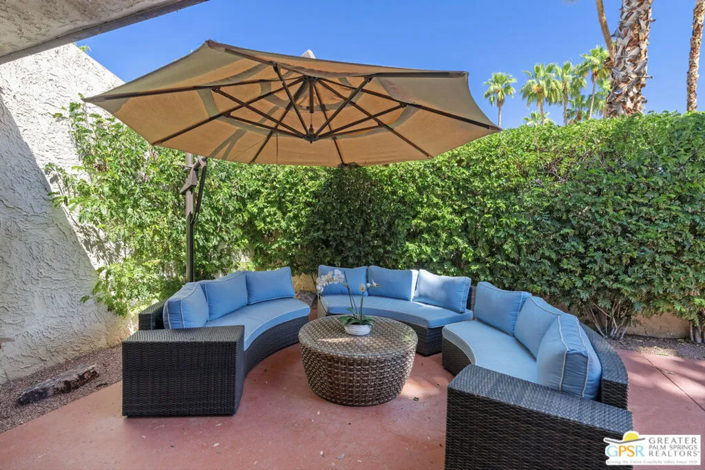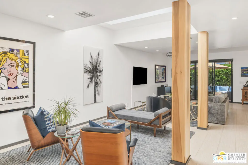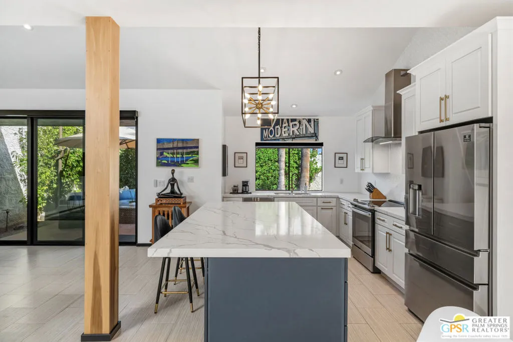 Here it is! This stunningly remodeled unit was taken down to the studs and re-imagined for your modern lifestyle. 1,839 square feet of high end finishes surround you in this 2 bedroom, 2.5 bath home. The large open concept is perfect for entertaining large or intimate gatherings. The light and bright gourmet kitchen features a large center island, stainless appliances and ample storage. The luxurious primary suite features a walk-in closet, dressing area, bar fridge and a spectacular en-suite spa-like bath. Your guests will also feel like they are staying in a resort in the guest room and bath. This beautiful unit also features a very stylish powder room, an extra flex space that can be used as an office, gym, yoga, art studio, library or den. The large wrap around walled in private patio is perfect for that the Palm Springs indoor-outdoor lifestyle and is just steps from the pool. There is also a 2 car garage with direct access. The Palm Regency amenities include 2 pools, 2 spas, 2 tennis courts, clubhouse and stunning mountain views all around. The ideal central PS location is close to everything! You will not find another unit of this quality in this price range. This one is priced to sell and ready to go!