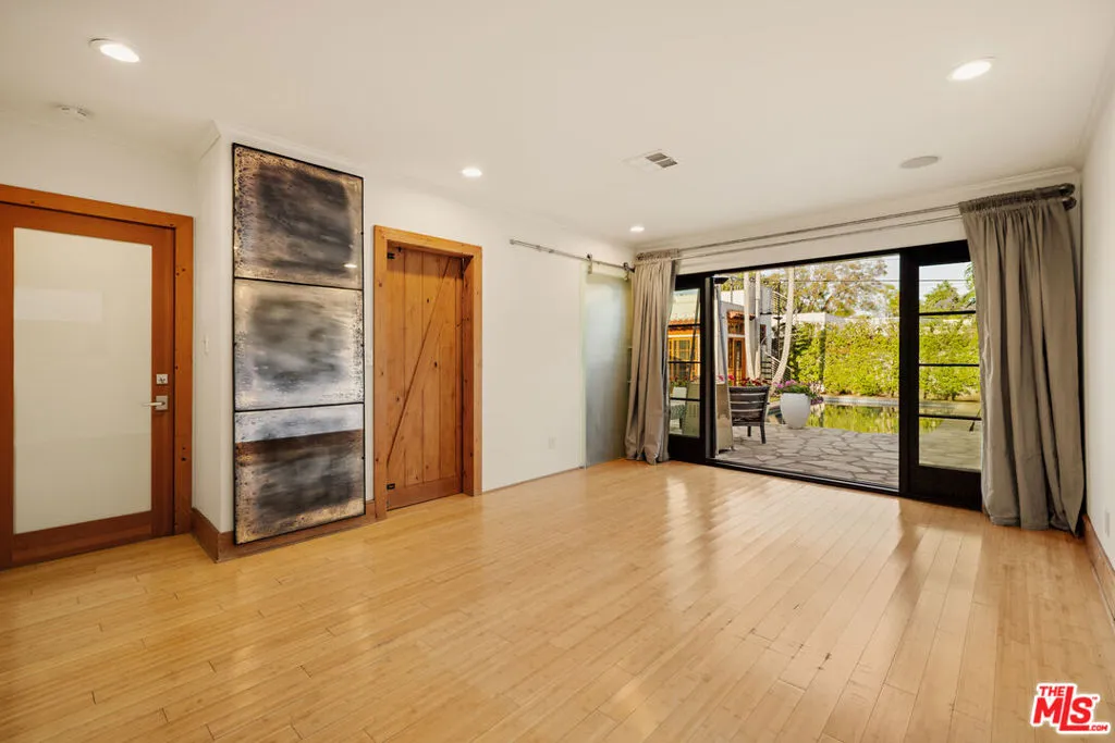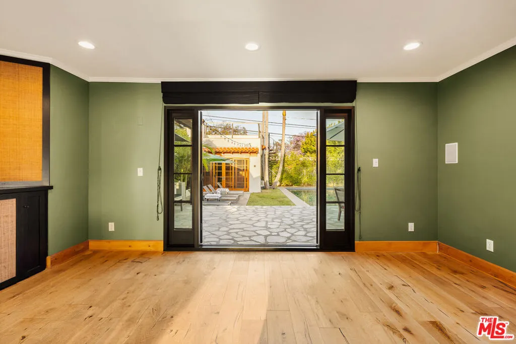 Gated Redone Spanish on a prime WeHo-adjacent block. Single-level with arched windows, barreled ceilings, and hardwood floors throughout. Remodeled kitchen with high-end appliances, marble counters, and polished concrete floors. Private front patio with fire pit; den opens to a resort-style pool and dining area for true indoor/outdoor living. Both baths fully updated. Certified by renowned feng shui consultant Angi Ma Wong. Walkable to Melrose Design District, Croft Alley, and the best of West Hollywood.