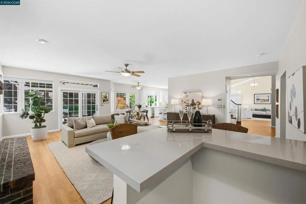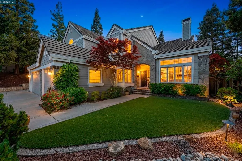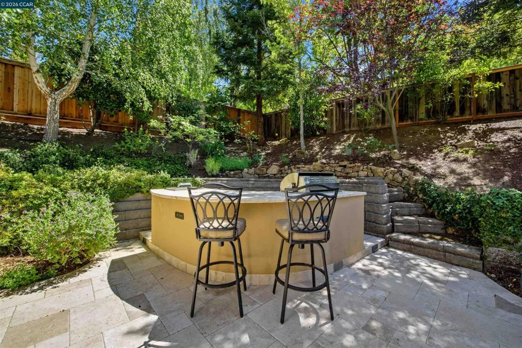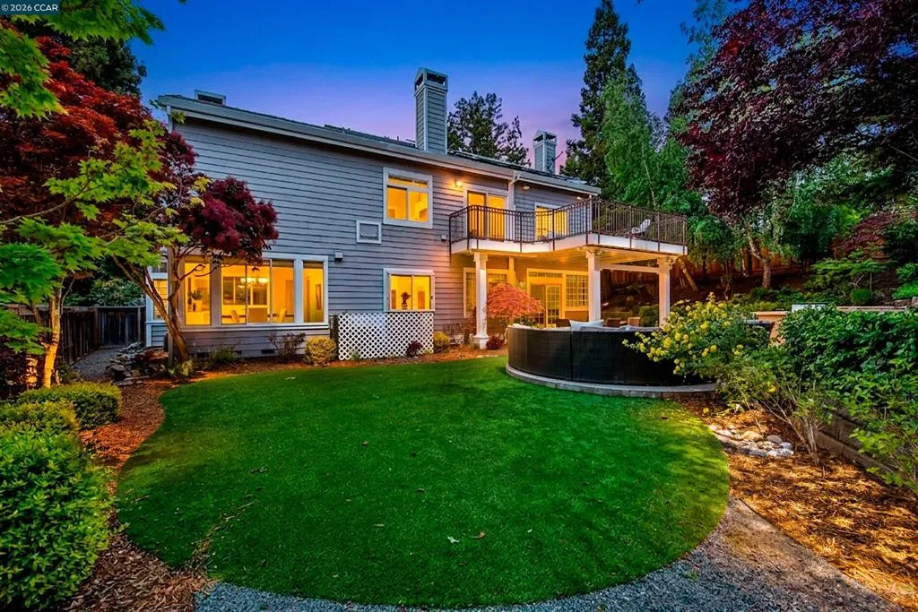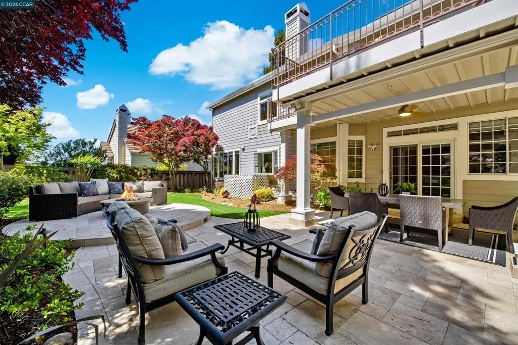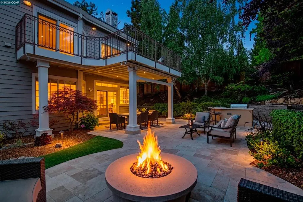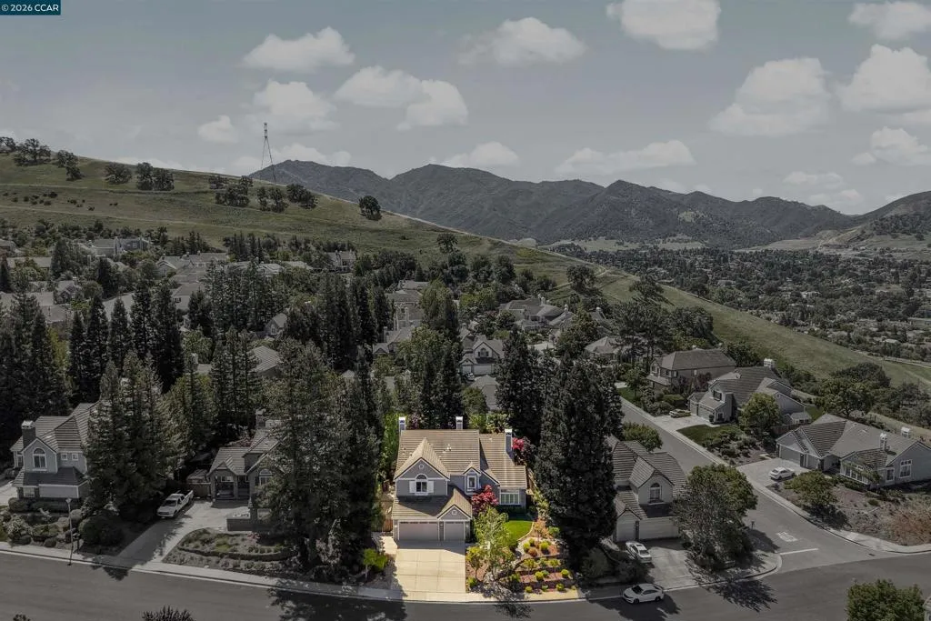 Beautifully updated throughout, this 5-bed, 3-bath home offers 3,606 sq ft of living space. A light-filled entry with a curved staircase leads into a formal living room with soaring ceilings, plantation shutters and a two-sided fireplace shared with the dining room, where a bank of tall windows enhances the natural light. The remodeled kitchen features quartz countertops, a large island, walk-in pantry, dual sinks, wine cooler, Dacor cooktop and double Electrolux ovens, flowing into a spacious family room with hardwood floors, brick fireplace and backyard access. A remodeled bar with seating and two wine coolers enhances entertaining. Main level includes a guest bedroom, remodeled laundry room and bath with walk-in shower. Upstairs, the primary suite offers a sitting area, private deck with valley views, and a two-way fireplace into the spa-like bath with soaking tub, walk-in shower, dual vanities and large closet. Additional bedrooms are bright and spacious with views of Clayton and Suisun Bay. Enjoy a private resort style backyard with travertine hardscape, built-in BBQ/bar, firepit, fountain, covered patio and synthetic turf. Upgraded garage with epoxy floors and cabinetry, plus solar. Minutes to trails, shopping and dining, this elegant home offers space and thoughtful upgrades.
