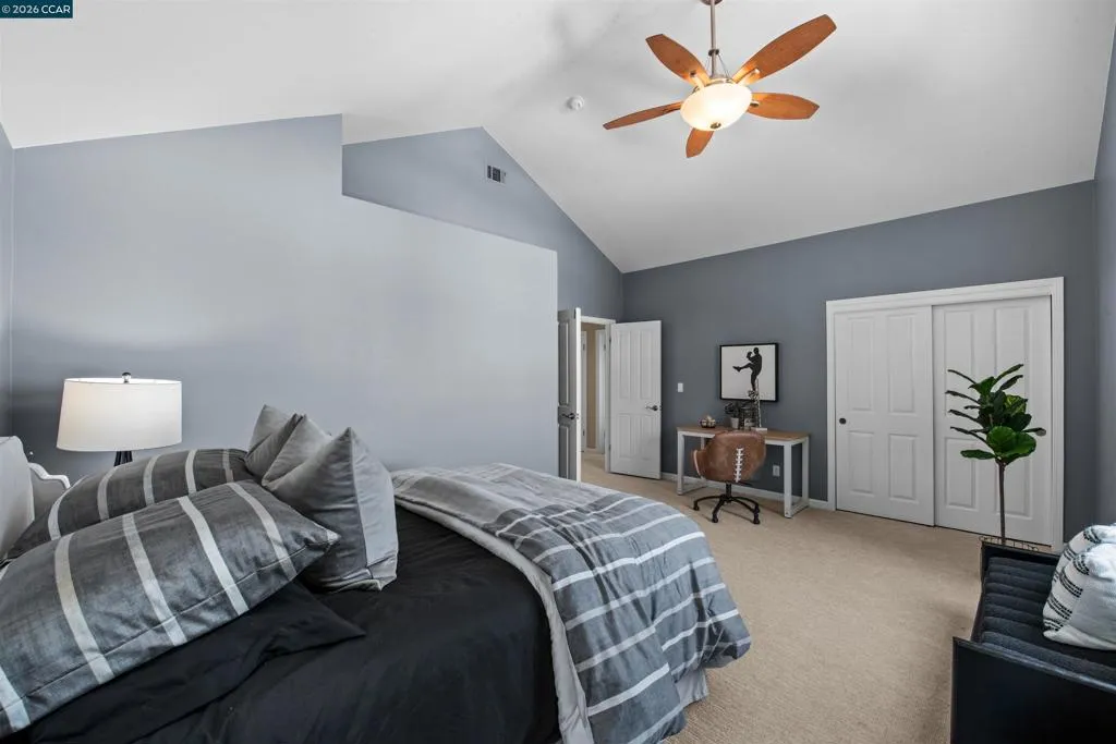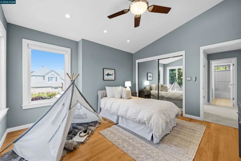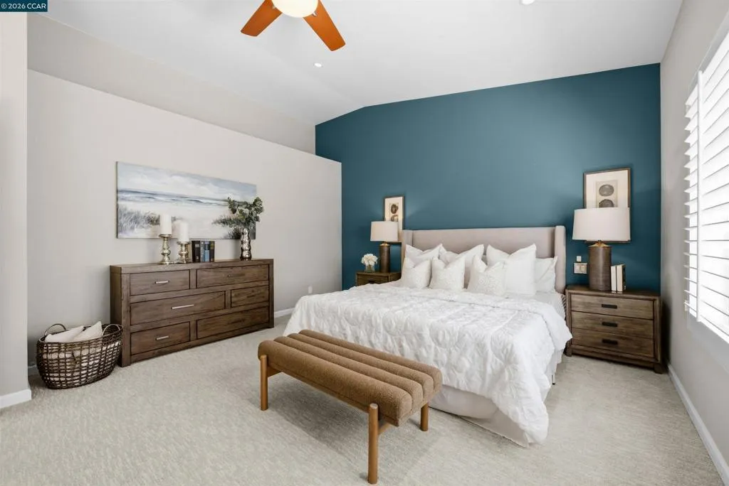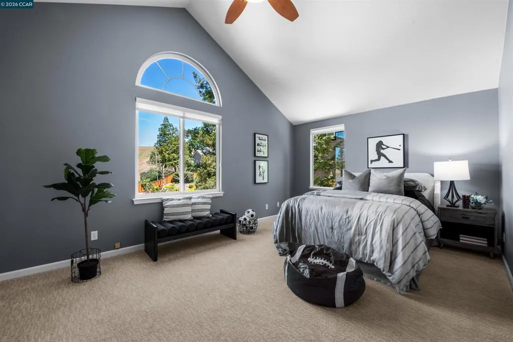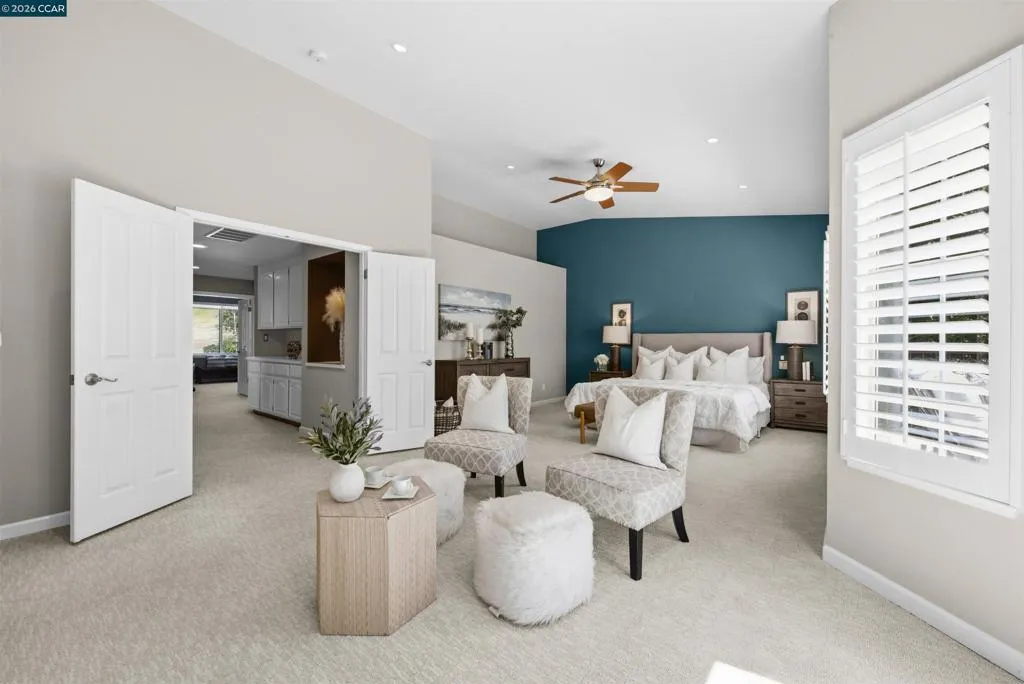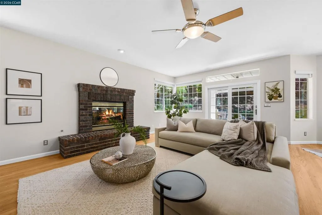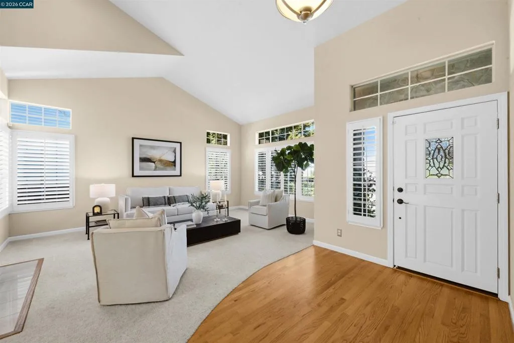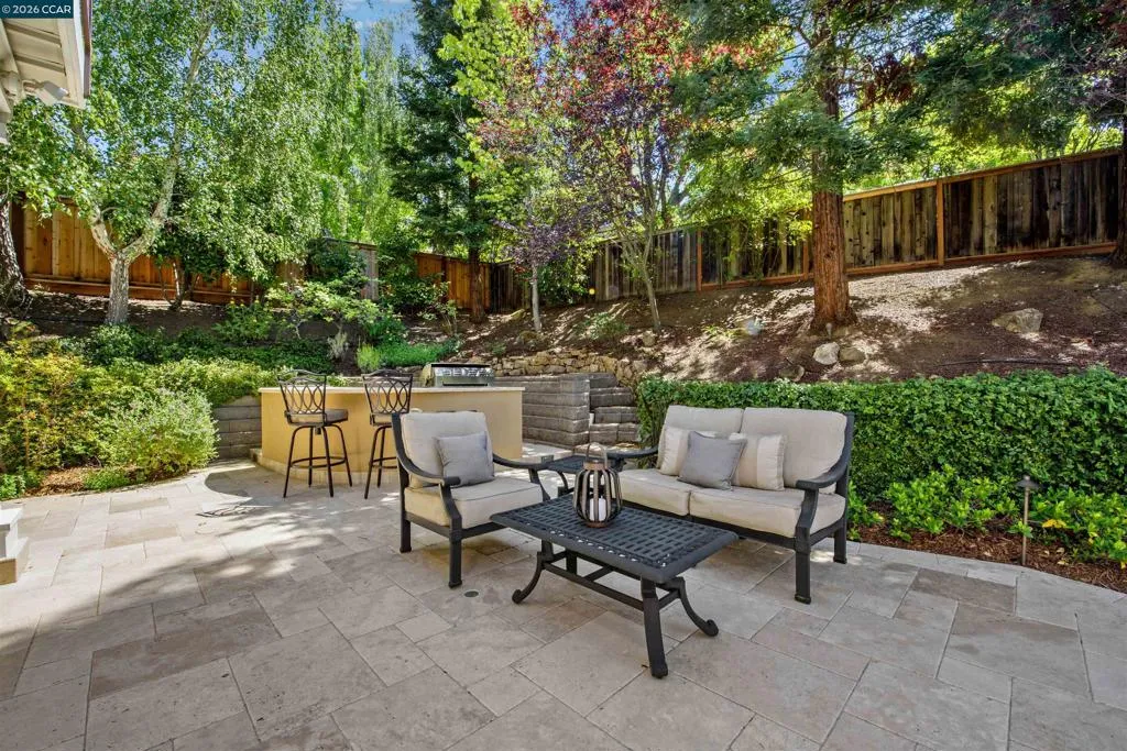 Beautifully updated throughout, this 5-bed, 3-bath home offers 3,606 sq ft of living space. A light-filled entry with a curved staircase leads into a formal living room with soaring ceilings, plantation shutters and a two-sided fireplace shared with the dining room, where a bank of tall windows enhances the natural light. The remodeled kitchen features quartz countertops, a large island, walk-in pantry, dual sinks, wine cooler, Dacor cooktop and double Electrolux ovens, flowing into a spacious family room with hardwood floors, brick fireplace and backyard access. A remodeled bar with seating and two wine coolers enhances entertaining. Main level includes a guest bedroom, remodeled laundry room and bath with walk-in shower. Upstairs, the primary suite offers a sitting area, private deck with valley views, and a two-way fireplace into the spa-like bath with soaking tub, walk-in shower, dual vanities and large closet. Additional bedrooms are bright and spacious with views of Clayton and Suisun Bay. Enjoy a private resort style backyard with travertine hardscape, built-in BBQ/bar, firepit, fountain, covered patio and synthetic turf. Upgraded garage with epoxy floors and cabinetry, plus solar. Minutes to trails, shopping and dining, this elegant home offers space and thoughtful upgrades.