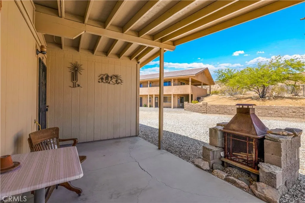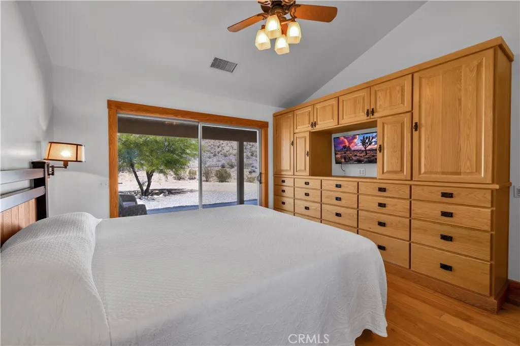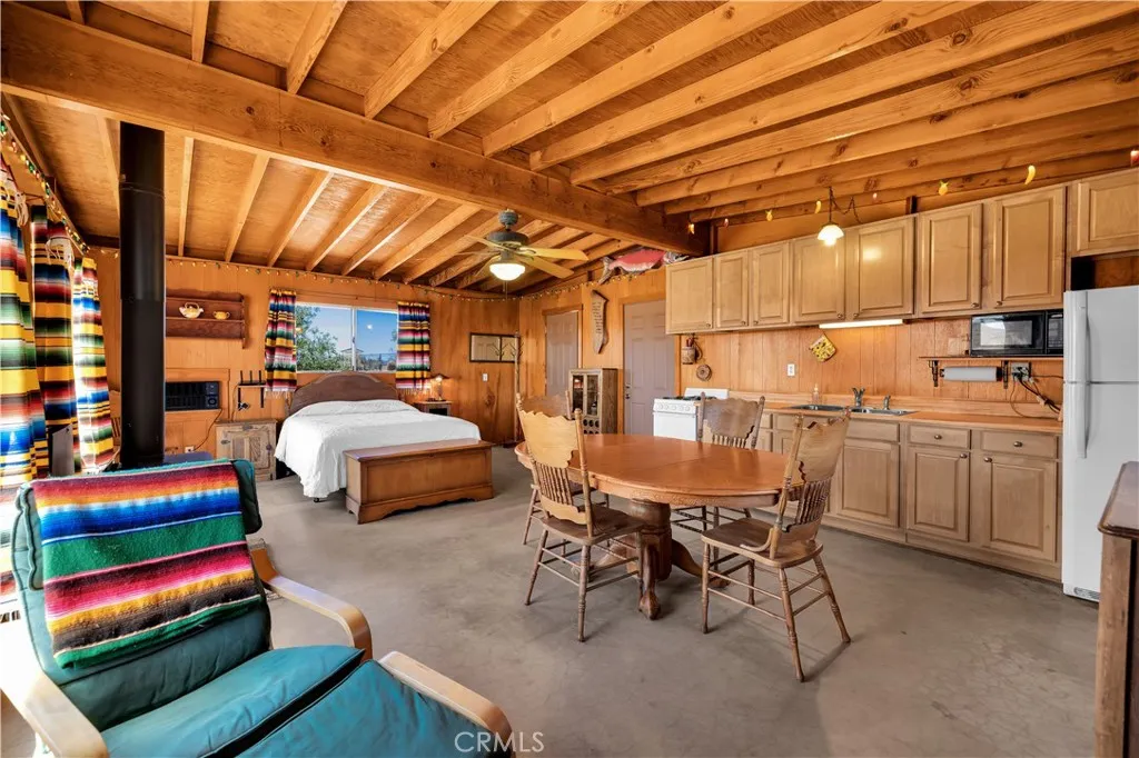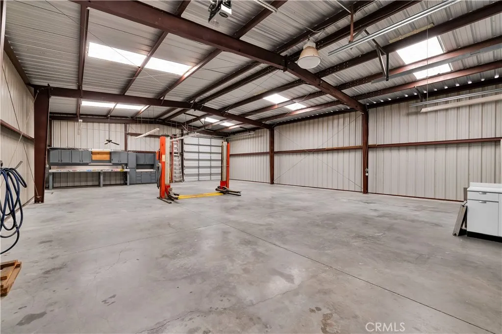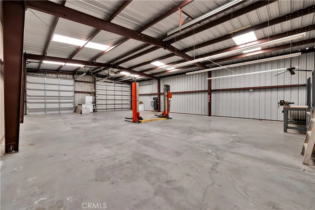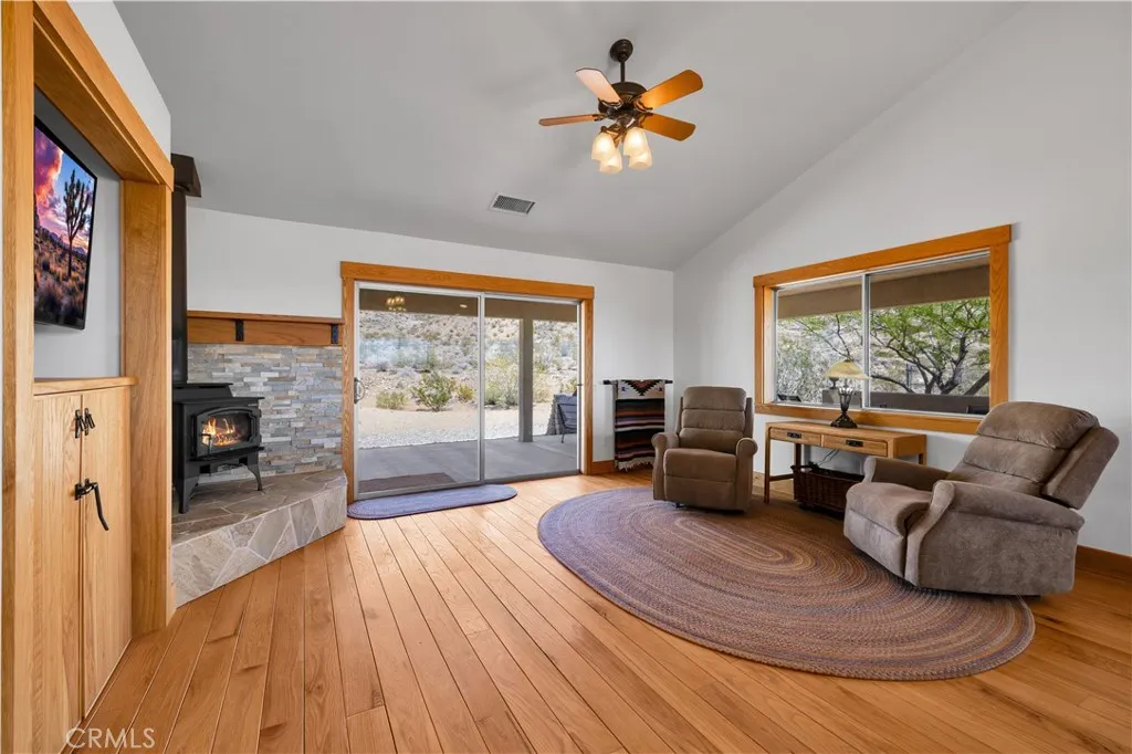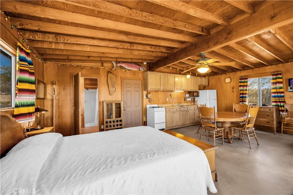 Large two-story main home, additional cabin, and a 2,400 sq ft workshop all on a fenced 5-acre parcel. This unique property is the last home on the street, backed directly against the mountain, offering incredible panoramic views overlooking all of Landers and unmatched privacy. The 2012 custom-built two-story main home features high-end finishes throughout, including real wood flooring, custom oak cabinetry, and laundry rooms on both levels. The upper level showcases vaulted ceilings and an open-concept layout, with a spacious kitchen featuring raw-edge granite countertops, abundant cabinetry, and ample workspace. The living room includes a wood stove and multiple sliders leading to both the front wraparound balcony and back patio. Bedrooms are generously sized, and the primary suite offers a massive walk-in closet, patio access, and a beautifully finished bathroom with soaking tub and walk-in shower. A bedroom on the lower level and a fully finished two-car garage add to the flexibility. The separate cabin provides excellent additional living space for guests, featuring an open layout, well-preserved retro charm, beautiful views, its own bathroom with walk-in shower, front porch, and a cross-fenced yard. The 2,400 sq ft metal workshop is a standout feature, equipped with three RV-height roll-up doors, power throughout with multiple 220 outlets, laundry hookups, a car lift, and custom fabrication tables with built-in storage—ideal for hobbyists, contractors, or business use. Additional features include a Connex storage container and full RV hookups. Properties offering this level of space, privacy, views, and versatility are rare—this is a must-see to truly appreciate everything it has to offer.