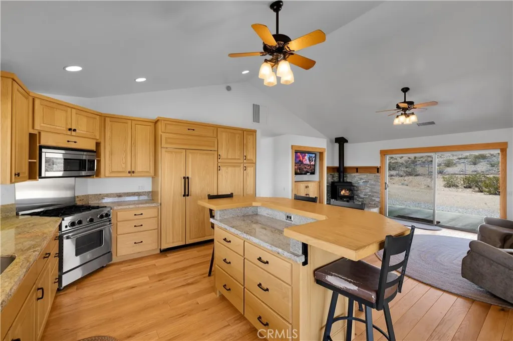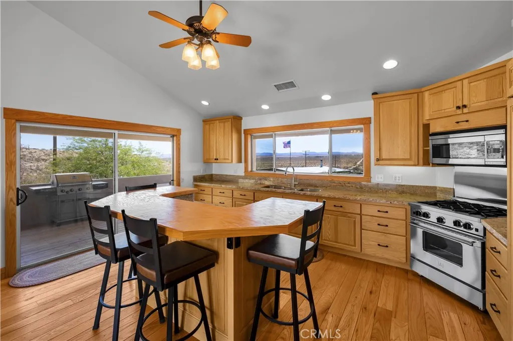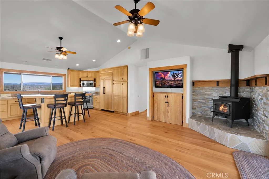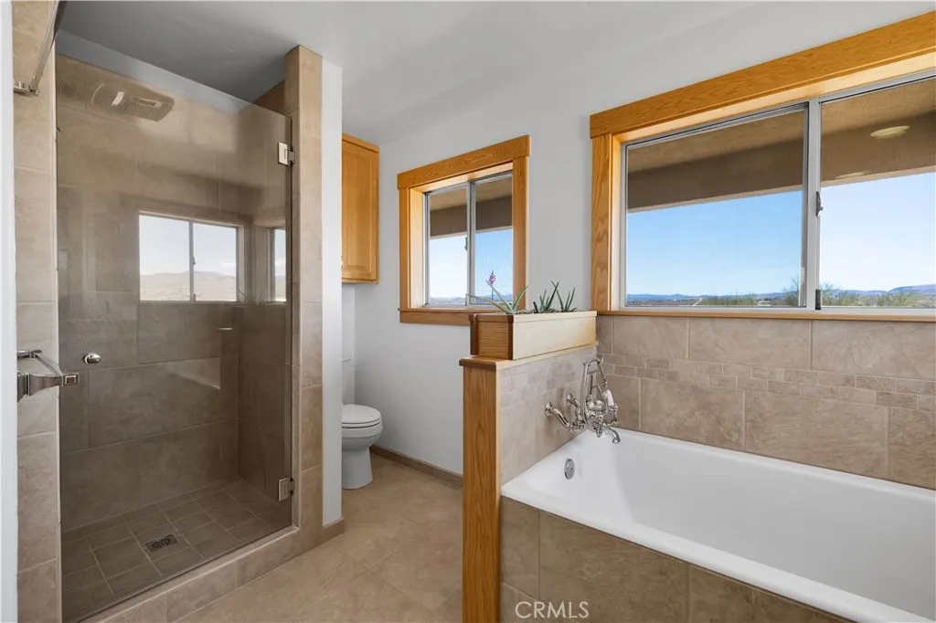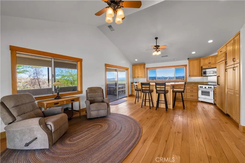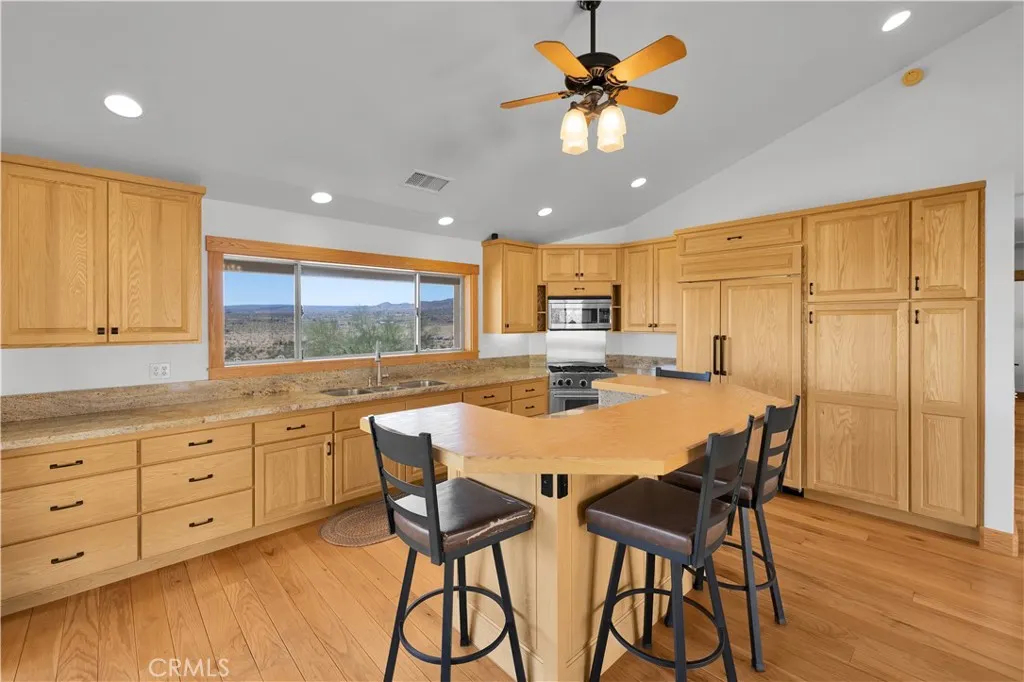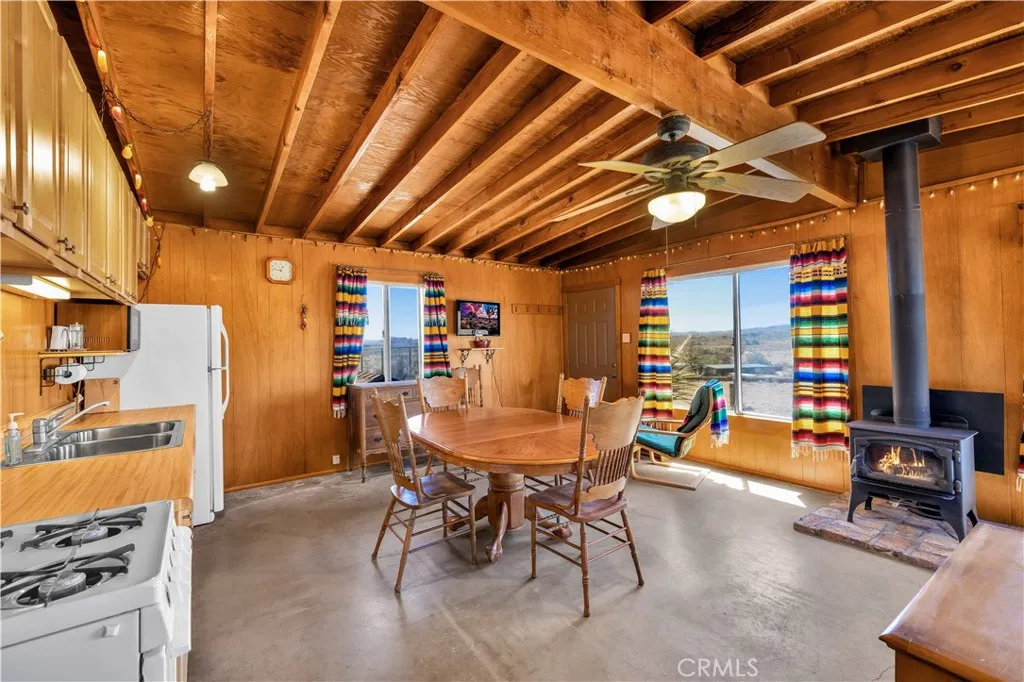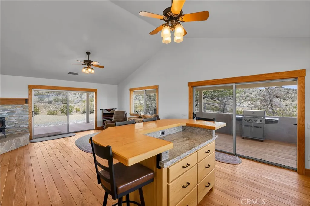Large two-story main home, additional cabin, and a 2,400 sq ft workshop all on a fenced 5-acre parcel. This unique property is the last home on the street, backed directly against the mountain, offering incredible panoramic views overlooking all of Landers and unmatched privacy. The 2012 custom-built two-story main home features high-end finishes throughout, including real wood flooring, custom oak cabinetry, and laundry rooms on both levels. The upper level showcases vaulted ceilings and an open-concept layout, with a spacious kitchen featuring raw-edge granite countertops, abundant cabinetry, and ample workspace. The living room includes a wood stove and multiple sliders leading to both the front wraparound balcony and back patio. Bedrooms are generously sized, and the primary suite offers a massive walk-in closet, patio access, and a beautifully finished bathroom with soaking tub and walk-in shower. A bedroom on the lower level and a fully finished two-car garage add to the flexibility. The separate cabin provides excellent additional living space for guests, featuring an open layout, well-preserved retro charm, beautiful views, its own bathroom with walk-in shower, front porch, and a cross-fenced yard. The 2,400 sq ft metal workshop is a standout feature, equipped with three RV-height roll-up doors, power throughout with multiple 220 outlets, laundry hookups, a car lift, and custom fabrication tables with built-in storage—ideal for hobbyists, contractors, or business use. Additional features include a Connex storage container and full RV hookups. Properties offering this level of space, privacy, views, and versatility are rare—this is a must-see to truly appreciate everything it has to offer.
