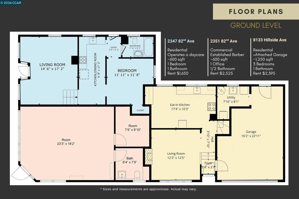 Strong, CASH-FLOWING mixed-use opportunity combining two residential units and a corner storefront for diversified, stable income. The retail space is leased to a well-established barber shop with a consistent operating history, providing dependable revenue. The primary residential unit, with frontage on Hillside St, offers ~1,250 sq ft across three levels with 3 bedrooms, 1 bath, an attached garage, dedicated laundry room, and direct access to the backyard - currently rented at close-to-market rate. The second unit, zoned residential, presently operating as a family day-care (permitted use). The unit features a kitchen, full bath, and a bedroom, opening the door to multiple use scenarios. In-place rents total $6,570/month ($78,840 annually), delivering immediate cash flow (7-8% cap rate!) with additional upside potential. The property is well maintained with sewer lateral compliance certificate and sidewalk cleared for certification. Full inspection reports are available. Positioned with convenient access to I-580, I-880, and public transit, the location connects easily to major employment hubs across Oakland and the broader East Bay. Nearby parks, neighborhood retail, and community services support strong tenant demand and long-term stability. A versatile, income-producing asset with multiple income streams and room to grow. Ideal for investors seeking both performance and flexibility. Shown by appointment. Reach out for disclosures, pro forma, and offering memorandum.