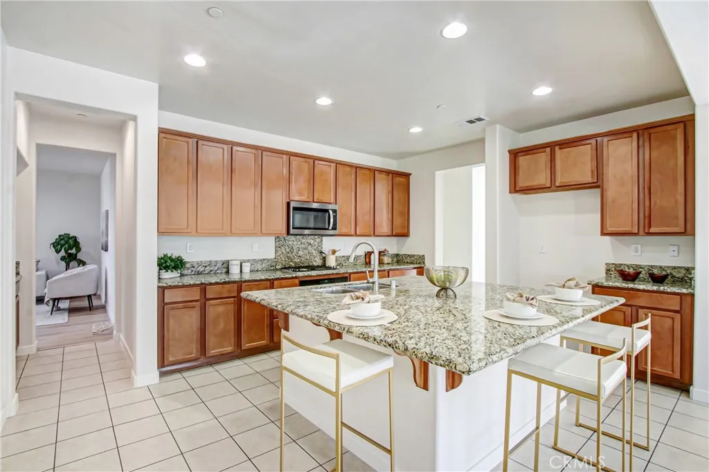 Welcome to this beautifully updated 5-bedroom, 3.5-bath home in the desirable Riverwood community of Eastvale, offering approximately 3,697 sq ft of well-designed living space. Recently refreshed with brand-new waterproof laminate flooring, fresh interior and exterior paint, and updated fixtures, this home delivers a modern, move-in ready experience. The thoughtfully designed floor plan features a convenient downstairs bedroom and bathroom, providing flexible living arrangements. The spacious kitchen is equipped with quartz countertops, a large center island, ample cabinetry, and a pantry, seamlessly connecting to the main living areas for both everyday living and entertaining. Upstairs, enjoy a versatile loft space along with a generously sized primary suite offering a comfortable retreat. Additional well-proportioned bedrooms provide flexibility for a variety of needs. Situated on a spacious lot, the backyard provides space for outdoor living and entertaining. A 3-car attached garage adds convenience and ample storage. Located in a desirable Eastvale neighborhood with convenient access to parks, shopping, dining, and major commuter routes.