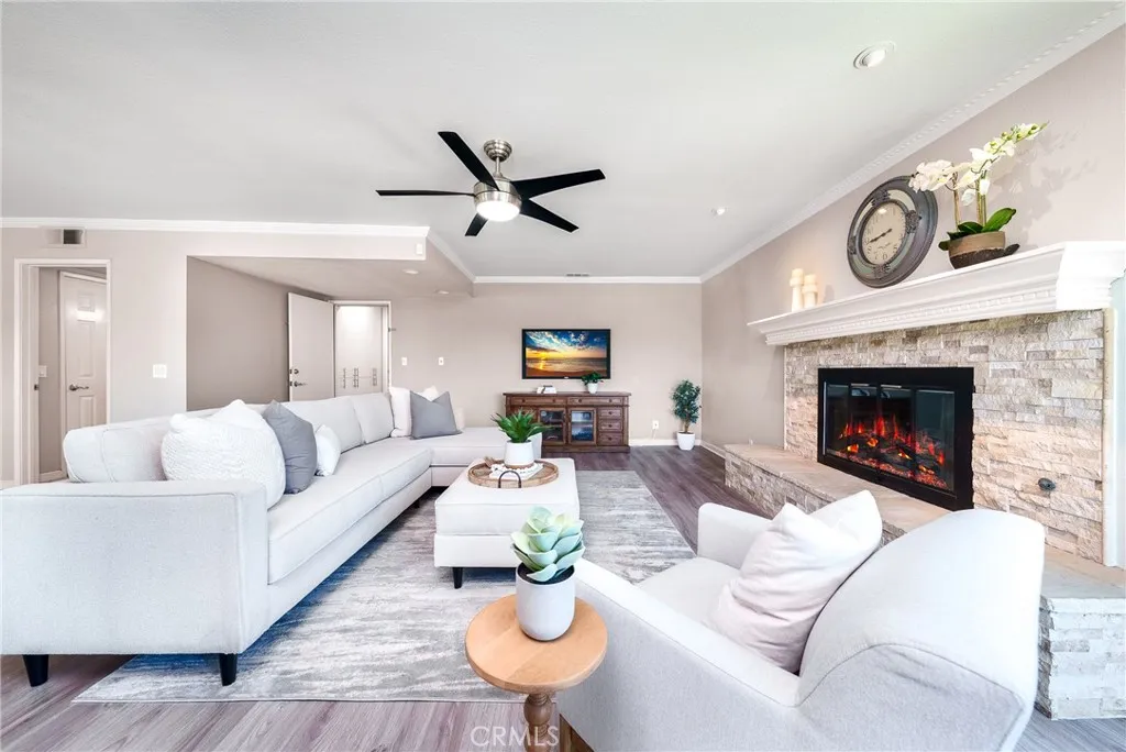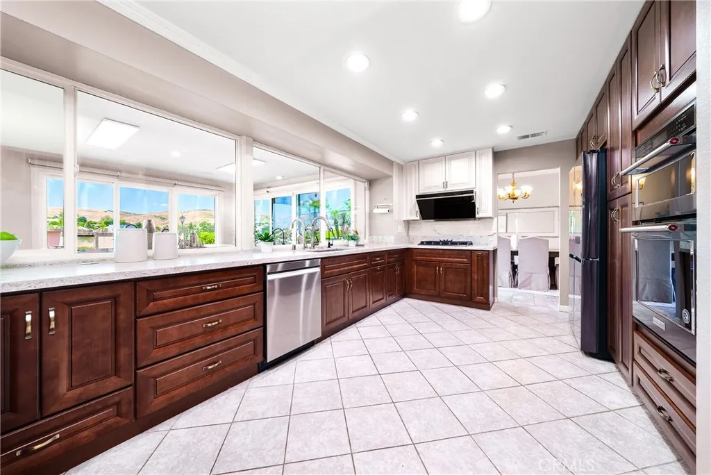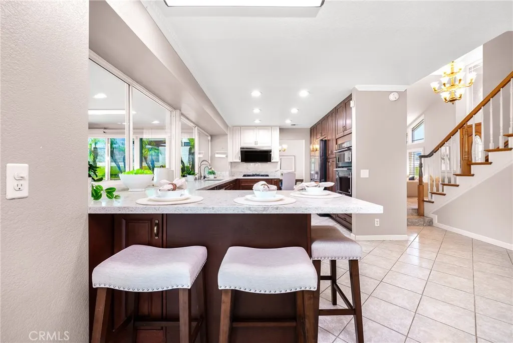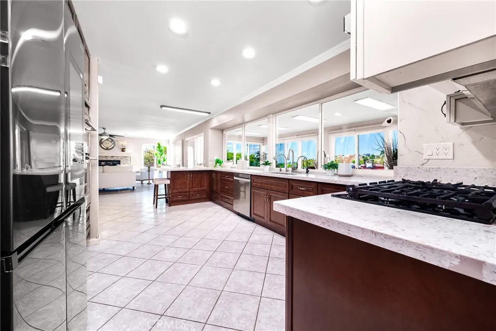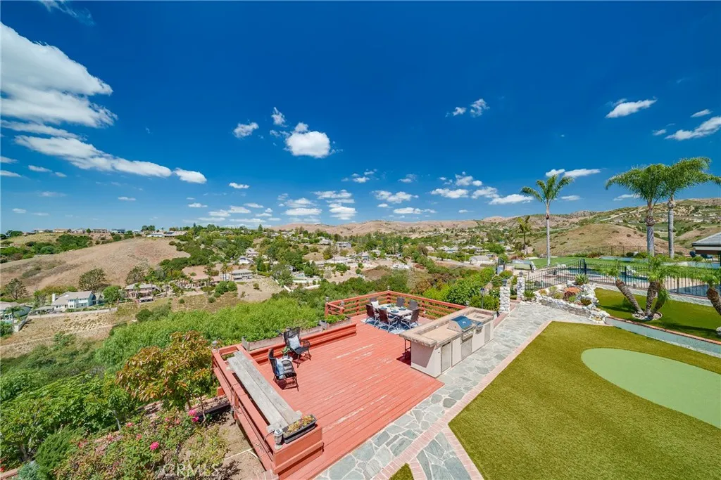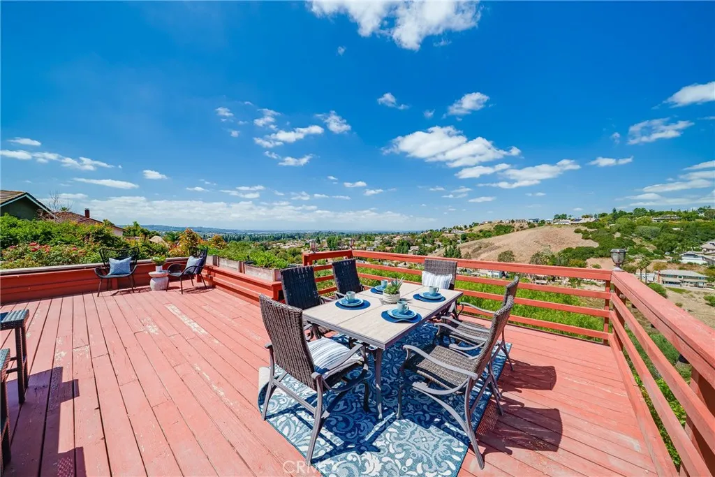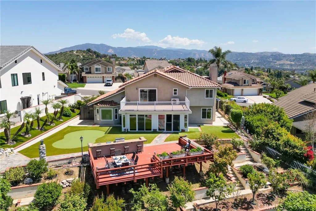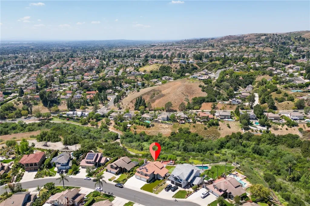 This beautifully updated home is a rare find in one of Yorba Linda’s most desirable hill-top neighborhoods. Situated on a spacious 19,200 sqft cul-de-sac view lot, this residence offers a perfect blend of modern luxury and serene natural beauty. The highlight of this property is the incredible panoramic view from Catalina in the south and mountain in the north. From the backyard, the massive custom-built deck, the private balcony off the master suite, and the widows next to the Jacuzzi tub you enjoy unobstructed mountain views during daytime, sunset views and shimmering city lights every night, along with Disneyland fireworks from afar. Comes with 22-panel paid off solar, whole house fan, and artificial turf front and back, this energy efficient home features 4 bedrooms and 3.5 bathrooms, recently replaced roof, upgraded kitchen and bathrooms, marble, travertine and carpet floors, neutral toned interior and exterior, wood shutters, zebra roller shades, dual pane windows, stainless steel appliances, an added sunroom for extra kitchen space as well as family gathering. An added full bedroom and bathroom, plus an expanded upstairs bedroom provides extra living space. The master bedroom comes with a retreat and a large balcony. It also features a gas burning fireplace with a glass conversion kit, and there's another gas fireplace in the family room featuring Roman beige Ledger panels. The master bath is fully upgraded with walk-in shower and soaking tub. The backyard is an entertainer’s paradise, featuring a spacious built out deck for party and gathering. The slope is turned into nature lover’s dream, boosting a lush private orchard with over 50 producing fruit trees including peach, lemon, avocado, fig, apricot, and more. This home is in the Yorba Linda high school boundaries. Travis Ranch school (K-8) is located down the street. Convenient location and close to shopping, parks, trails, and freeway. Make this the perfect place to call your dream home!