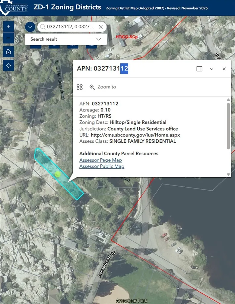 4,375 sf vacant lot a stone's throw from Arrowbear Lake. Located in the Arrowbear Park community (Running Springs) between Lake Arrowhead and Big Bear Lake. This lot was subdivided in preparation for a new housing tract which never materialized, leaving current Buyers the opportunity to acquire at a very reasonable price. Land is zoned HT/RS (Hilltop/Single Family Residential). Water and Power are located nearby on main paved road (Arrowbear Dr). This lot provides a beautiful setting with great natural rock outcroppings, enabling a buyer's vision on future potential. Lot dimensions are roughly 25 ft x 161 ft.