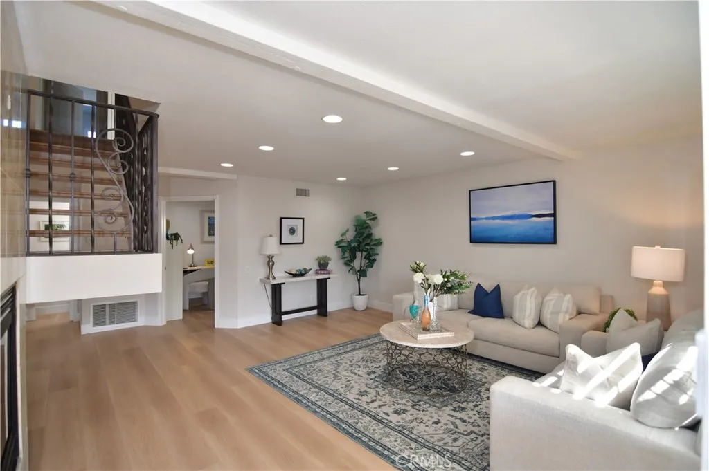 This beautifully upgraded home offers 2,109 sq ft of comfortable living space on a generous 5,000 sq ft lot in a prime Irvine location. Thoughtfully updated and move-in ready, it seamlessly blends modern finishes with a warm, functional layout — and best of all, there is no HOA and no Mello-Roos!. The home is within easy walking distance to the elementary school and nearby parks, making daily school runs and family outgoings incredibly convenient. As you enter, you’re immediately drawn to the stunning kitchen featuring elegant quartz countertops and a new gas cooktop. The main level also boasts fresh vinyl plank flooring throughout and a bright dinning room with soaring high ceilings and a dramatic see-through fireplace. Upstairs, you’ll find three generously sized bedrooms and two beautifully remodeled bathrooms, both accented with quartz countertops. The primary suite is a true retreat, complete with its own private balcony — perfect for enjoying your morning coffee or unwinding with the evening breeze. The luxurious primary bathroom features a spa-like walk-in shower with elegant marble-look tile, modern gold/brass hardware, a sleek frameless glass enclosure, and a stylish hexagonal mosaic floor. Recently upgraded, it delivers a high-end feel that’s both functional and indulgent. Additional recent upgrades include a new water heater, new gas cooktop, new quartz countertops, new dishwasher, new light fixtures, and more. Outside, relax on the covered porch with durable aluminum roofing, sturdy piers, and a ceiling fan, while overlooking the beautifully landscaped backyard. Whether you’re entertaining guests, gardening, or simply enjoying some quiet time outdoors, this private, low-maintenance yard is ideal. Combining thoughtful modern updates with an excellent Irvine location, this home is truly one you won’t want to miss.