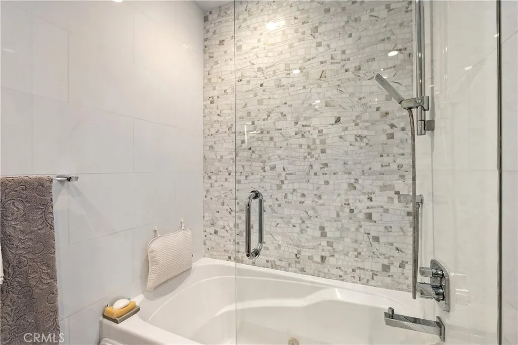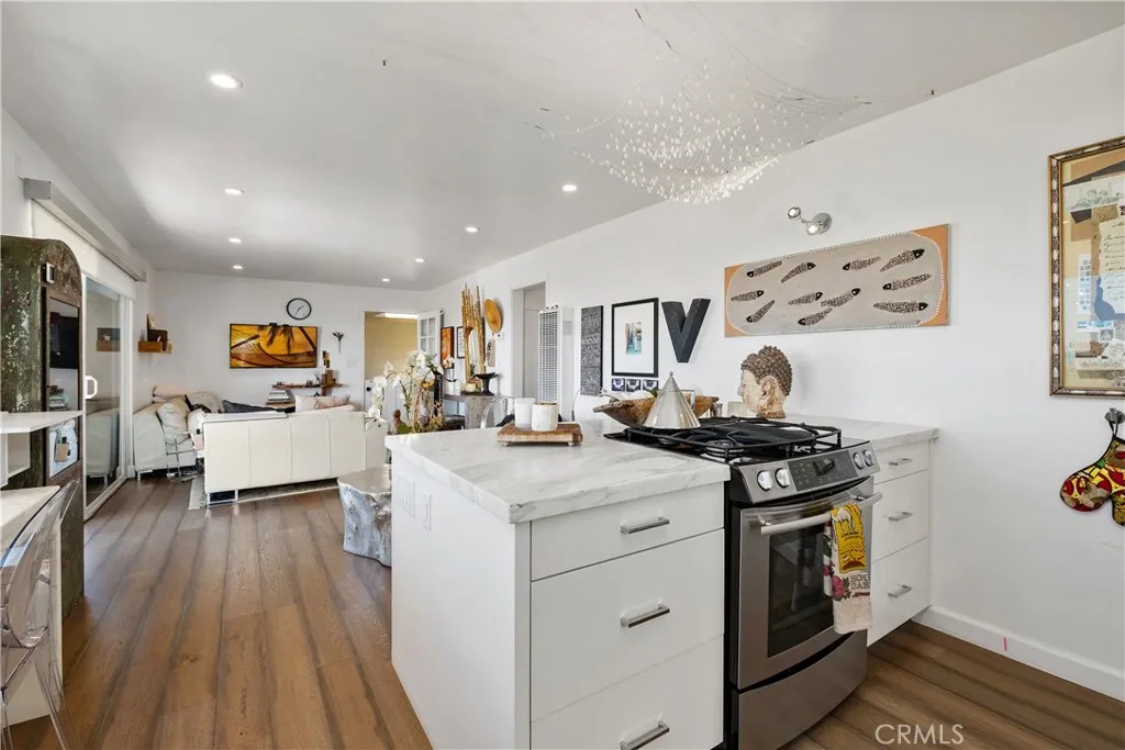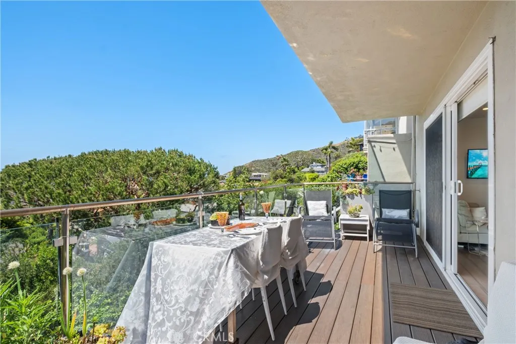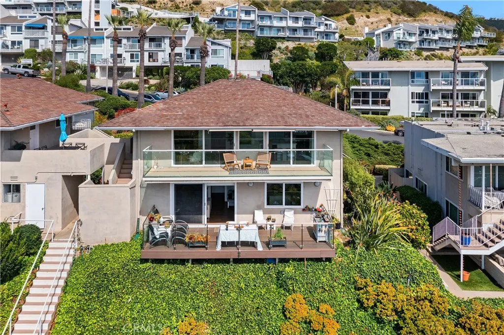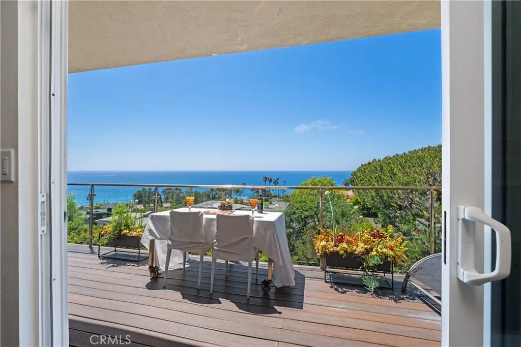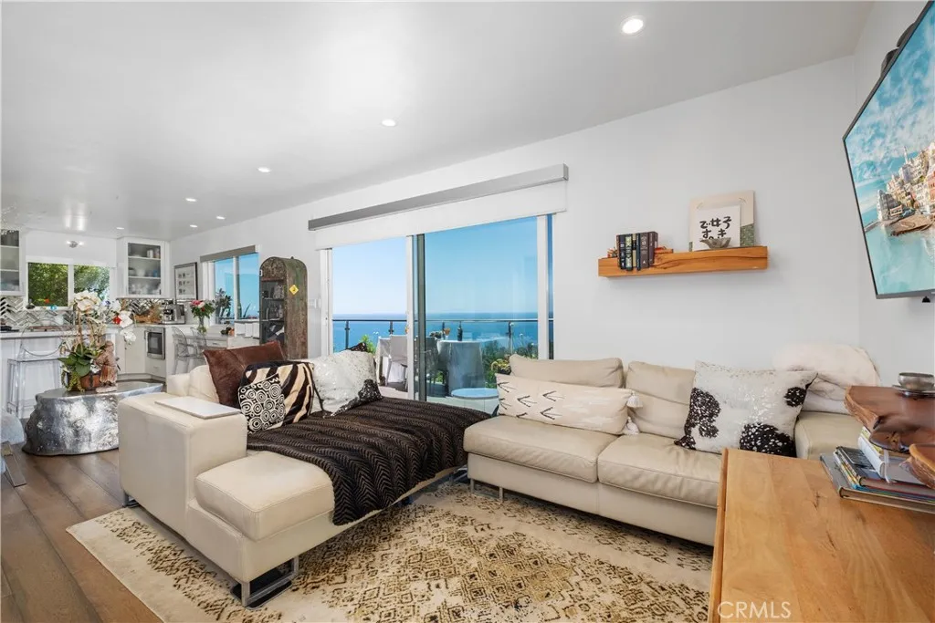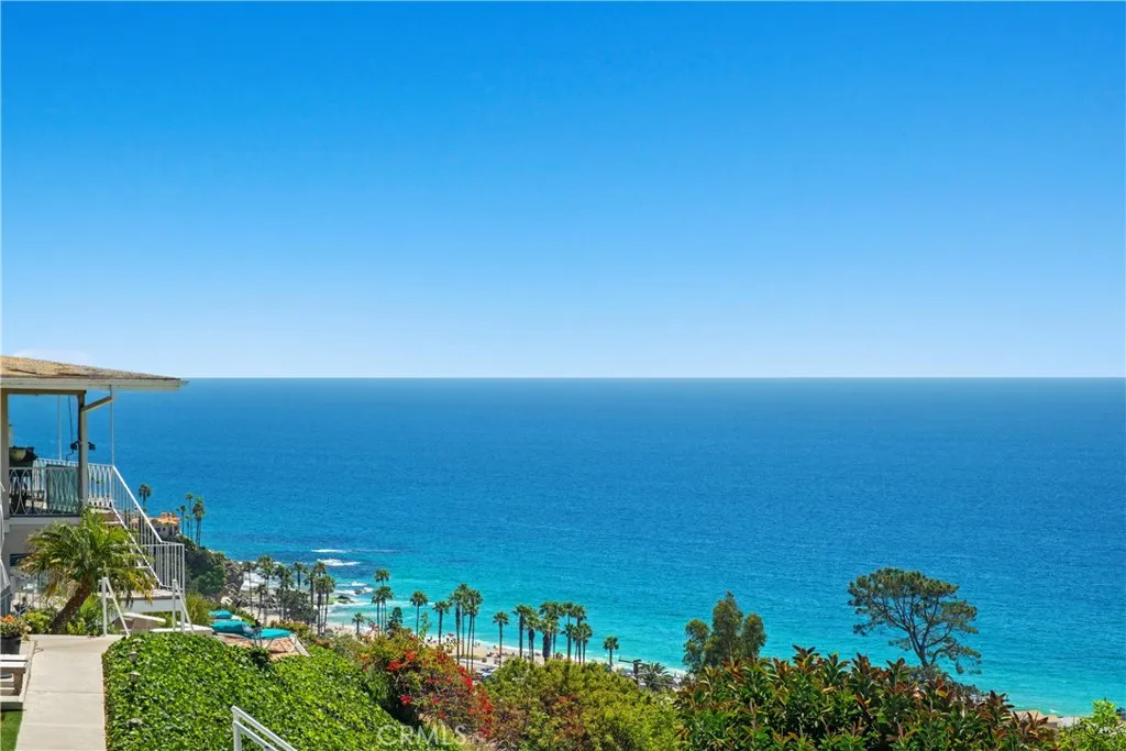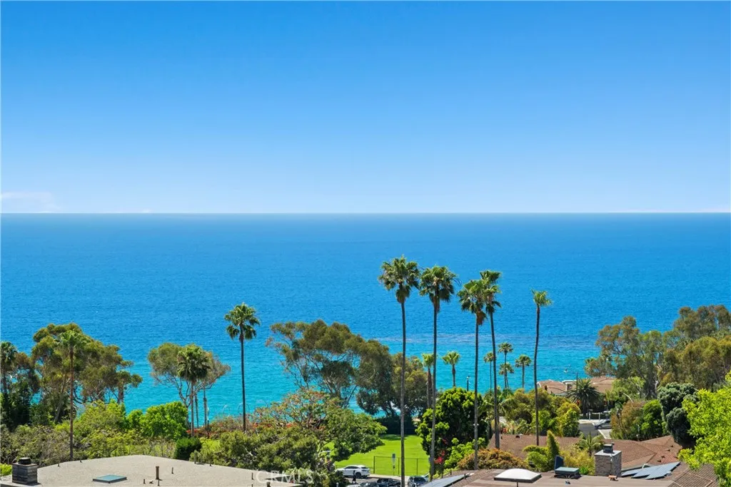 Perched above the Pacific Ocean, this coastal residence delivers sweep-the-horizon views from the living area and an ocean-facing kitchen window—plus the indoor/outdoor flow everyone craves. The open great room features recessed lighting, warm wood floors, and a large slider that extends daily living onto a view deck with glass railing—ideal for sunset dinners, morning coffee, and coastal breezes. Your patio is exclusive-use and not shared like units next door. The kitchen pairs crisp cabinetry with stone counters and a striking backsplash, with bar seating positioned to keep the ocean in sight. Updated bath finishes include a modern vanity and a glass-enclosed tub/shower with statement mosaic detail. Partial repipe completed recently. The bedroom layout includes a serene primary retreat and a flexible secondary room well-suited for guests, an office, or a personal library. Enjoy the community setting at Ocean Vista, with a sun-splashed pool, an Open-Air Pavilion area, and a prime coastal location overlooking the world-famous Montage Resort!