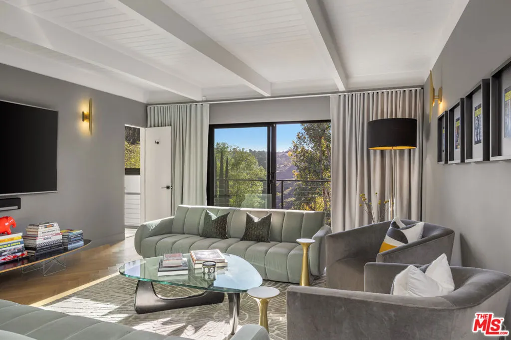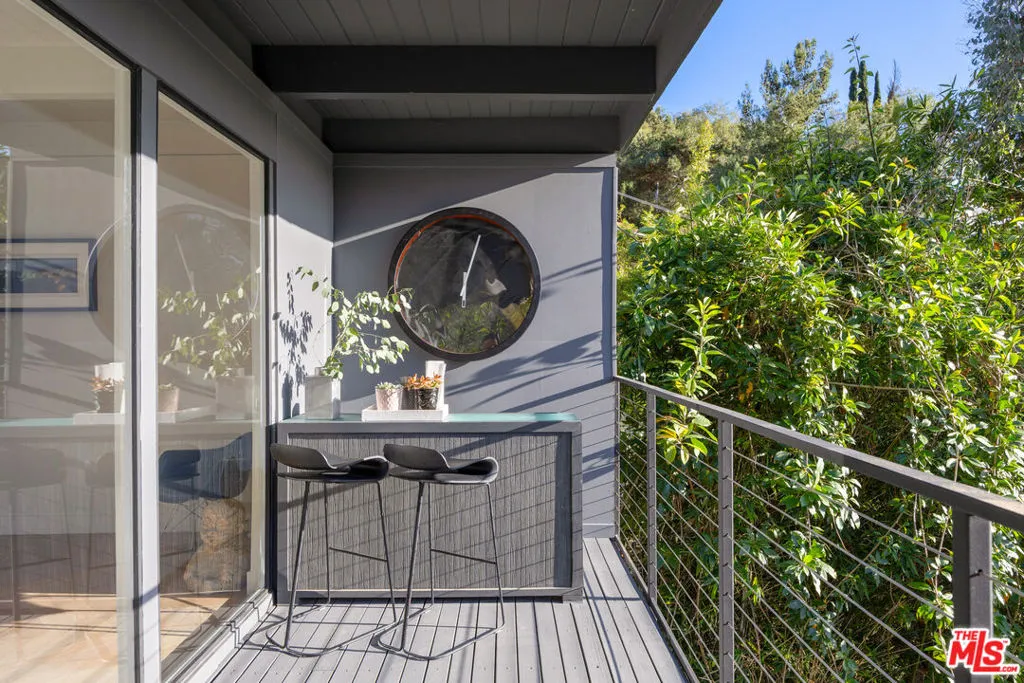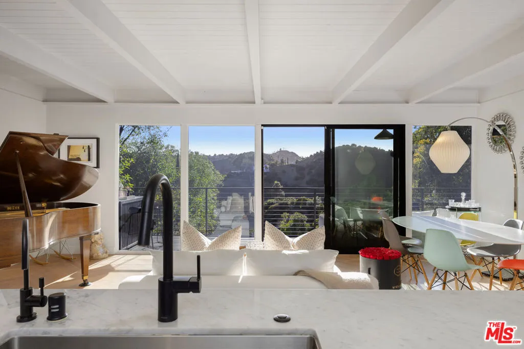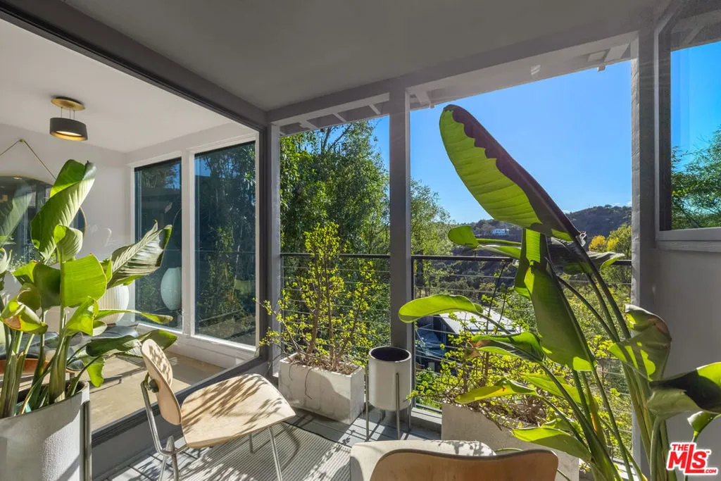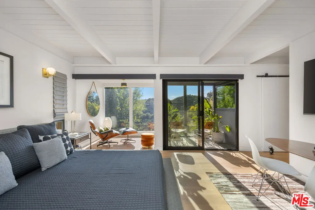 Welcome to Sunridge Hollywood Hills, a reimagined mid-century retreat where panoramic canyon views meet golden afternoon light that floods the interiors through walls of glass, all just minutes from West Hollywood, revealed through a crisp white breezeway reminiscent of the iconic Parker Palm Springs. A bold vermillion door opens into a space that immediately slows you down: morning begins softly here - light filtering through the canyon, coffee in hand, as lush greenery stretches endlessly beyond the glass. Every room is oriented toward the views, creating a constant connection to nature that feels both grounding and expansive as the day naturally unfolds. The open-concept living and dining areas flow effortlessly into expansive balconies, where indoor and outdoor living blur into one continuous experience. An outdoor bar invites casual afternoons with friends or quiet moments taking in the stillness of the hills, while unforgettable sunset and hillside views become part of the everyday rhythm. At the center, a sleek Carrara open kitchen with Bertazzoni appliances anchors the space - equally suited for daily living or hosting with intention. Norwegian white oak floors run throughout, adding warmth beneath the clean architectural lines and enhancing the home's inviting, elevated feel. Designed for both comfort and hosting, the layout reveals a rare level of flexibility with two primary suites. On its own upper level, a separate second primary retreat - currently styled as a cinema room with bar and ensuite - becomes an entertainer's dream, offering a fully private escape for guests while still capturing the same sweeping canyon views. As the day begins to wind down, the lower level shifts into a more tranquil rhythm: the primary suite becomes a true sanctuary - waking to canyon vistas, stepping out to a private seating area, or unwinding inside a spa-like bath wrapped in striking blue tile with dual vanities and a spacious rainfall shower, where lush green views of surrounding trees continue the home's seamless connection to nature. The third bedroom - again with floor-to-ceiling forest views - offers flexibility as a guest room or an inspiring home office where the workday feels worlds away. At last, evenings take center stage outdoors! The expansive, secluded deck with hot tub transforms into the heart of the home - alive with candlelit dinners, laughter-filled gatherings, or quiet moments under star-filled skies, surrounded by towering greenery and the soft, distant call of resident owls. It's the kind of setting that feels cinematic, unforgettable, and entirely your own. Come experience the magic of Sunridge Hollywood Hills - a rare, ultra peaceful canyon escape where design, privacy, and nature come together effortlessly!