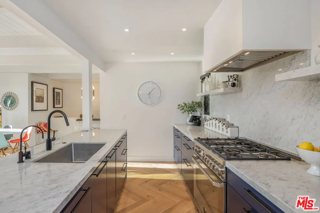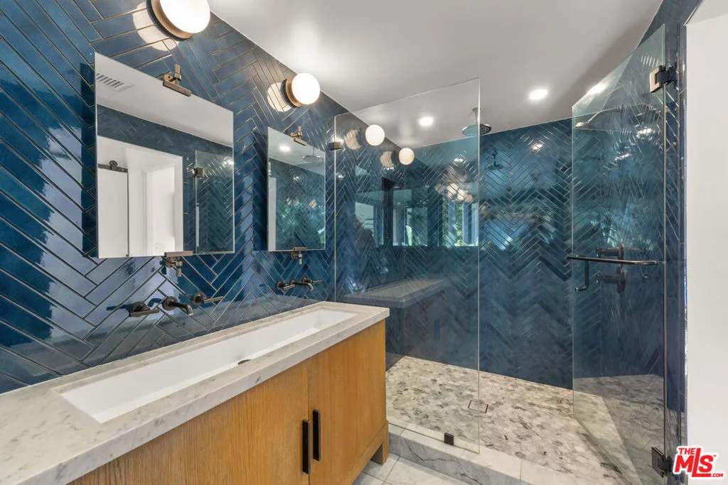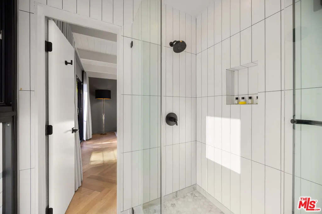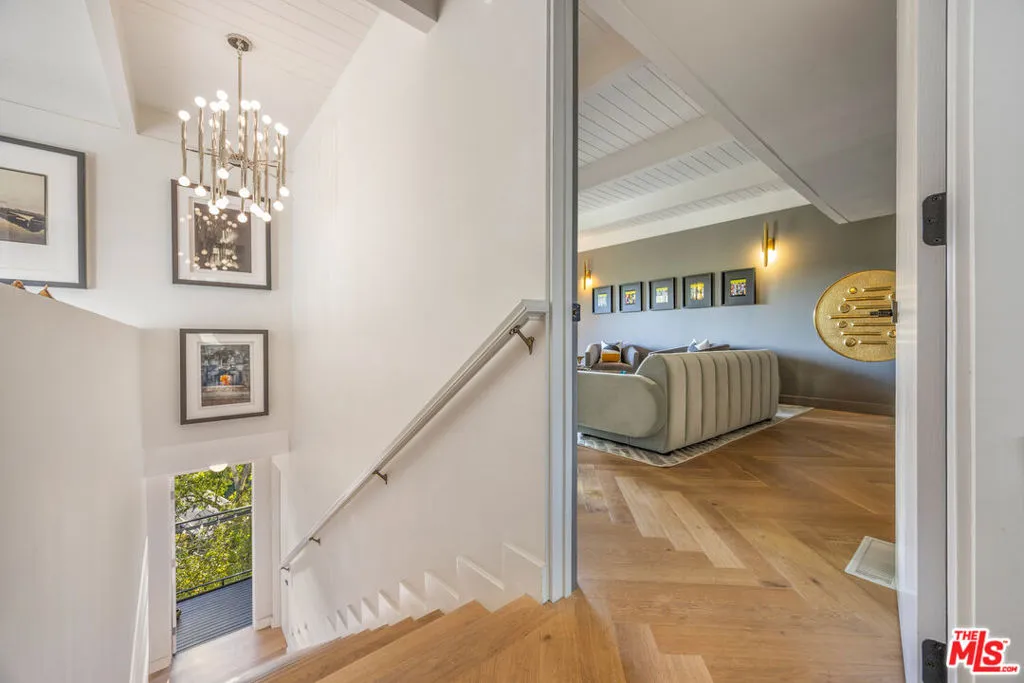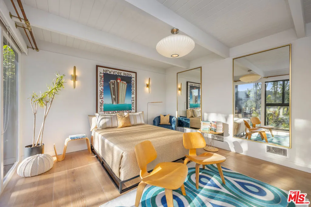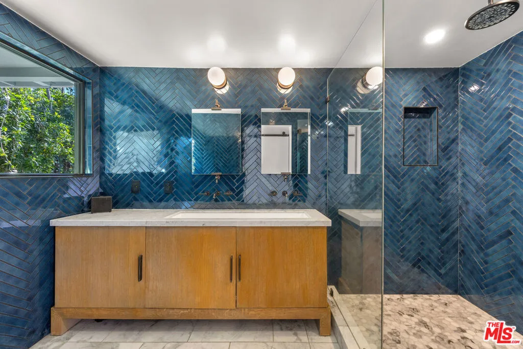 Welcome to Sunridge Hollywood Hills, a reimagined mid-century retreat where panoramic canyon views meet golden afternoon light that floods the interiors through walls of glass, all just minutes from West Hollywood, revealed through a crisp white breezeway reminiscent of the iconic Parker Palm Springs. A bold vermillion door opens into a space that immediately slows you down: morning begins softly here - light filtering through the canyon, coffee in hand, as lush greenery stretches endlessly beyond the glass. Every room is oriented toward the views, creating a constant connection to nature that feels both grounding and expansive as the day naturally unfolds. The open-concept living and dining areas flow effortlessly into expansive balconies, where indoor and outdoor living blur into one continuous experience. An outdoor bar invites casual afternoons with friends or quiet moments taking in the stillness of the hills, while unforgettable sunset and hillside views become part of the everyday rhythm. At the center, a sleek Carrara open kitchen with Bertazzoni appliances anchors the space - equally suited for daily living or hosting with intention. Norwegian white oak floors run throughout, adding warmth beneath the clean architectural lines and enhancing the home's inviting, elevated feel. Designed for both comfort and hosting, the layout reveals a rare level of flexibility with two primary suites. On its own upper level, a separate second primary retreat - currently styled as a cinema room with bar and ensuite - becomes an entertainer's dream, offering a fully private escape for guests while still capturing the same sweeping canyon views. As the day begins to wind down, the lower level shifts into a more tranquil rhythm: the primary suite becomes a true sanctuary - waking to canyon vistas, stepping out to a private seating area, or unwinding inside a spa-like bath wrapped in striking blue tile with dual vanities and a spacious rainfall shower, where lush green views of surrounding trees continue the home's seamless connection to nature. The third bedroom - again with floor-to-ceiling forest views - offers flexibility as a guest room or an inspiring home office where the workday feels worlds away. At last, evenings take center stage outdoors! The expansive, secluded deck with hot tub transforms into the heart of the home - alive with candlelit dinners, laughter-filled gatherings, or quiet moments under star-filled skies, surrounded by towering greenery and the soft, distant call of resident owls. It's the kind of setting that feels cinematic, unforgettable, and entirely your own. Come experience the magic of Sunridge Hollywood Hills - a rare, ultra peaceful canyon escape where design, privacy, and nature come together effortlessly!