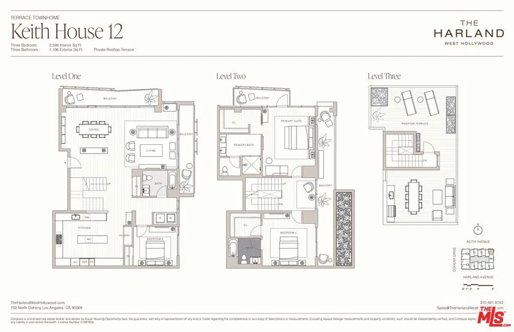 Keith House 12 is one of a limited collection of Case Study inspired Terrace Townhomes at The Harland, a boutique condominium building designed by OFFICEUNTITLED with interiors by Marmol Radziner. This three-bedroom, three-bath corner residence exemplifies the best of California modern design, offering a private street-level entry along tree-lined Keith Avenue. A light-filled great room is framed by floor-to-ceiling glass on the main level with one bedroom, and the upper level features the primary suite and a third bedroom. Private balconies extend from each level, opening to a full rooftop terrace with views of the Hollywood Hills. Located where West Hollywood meets Beverly Hills, The Harland pairs the privacy of a personal residence with a curated suite of services and amenities, including a screening room, residents' lounge, chefs kitchen, fitness studio, and two-lane bowling alley just moments from the city's top dining, shopping, and cultural destinations.